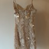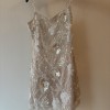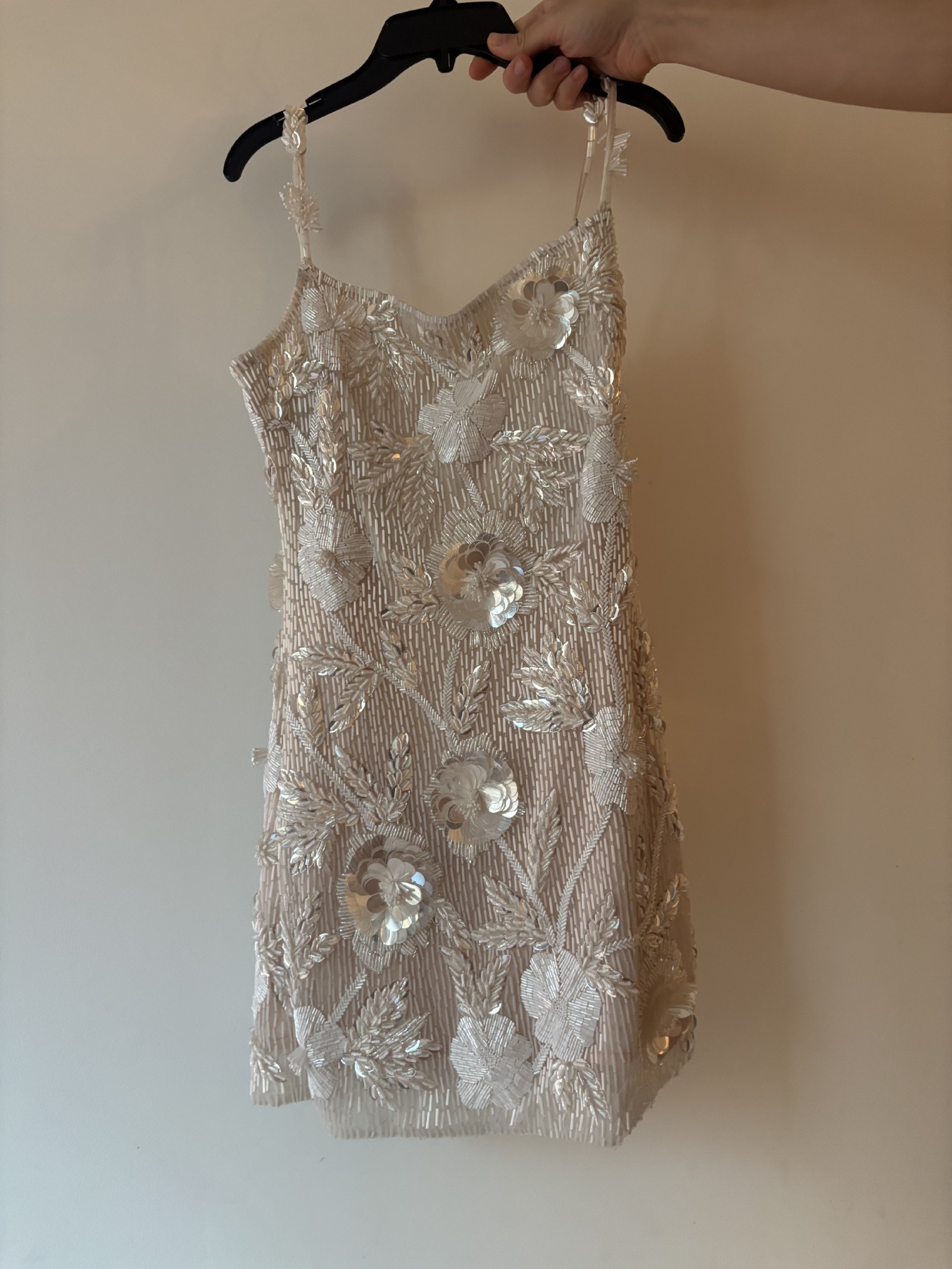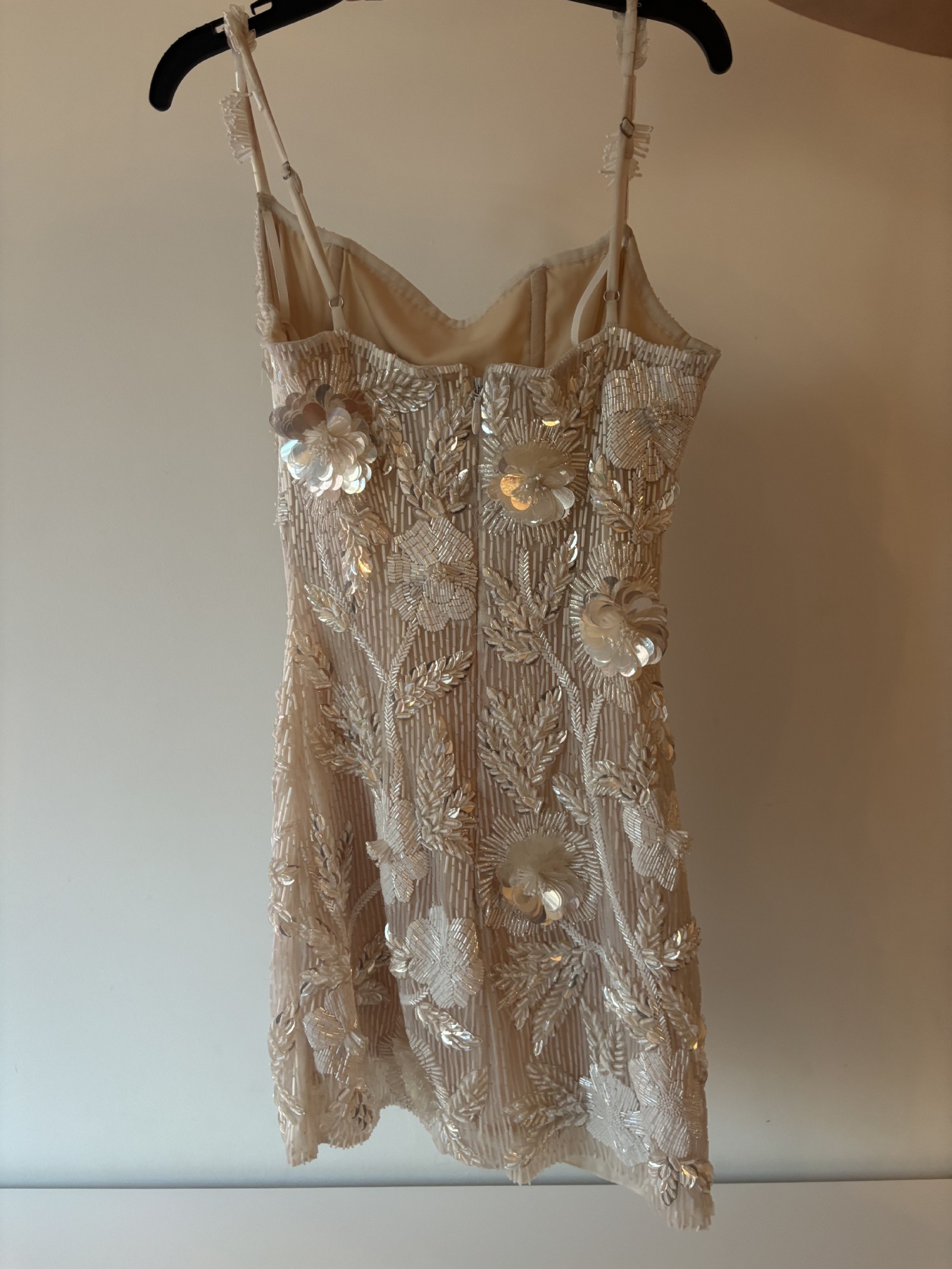 Rachel Gilbert Pierre Mini Dress in white/ivory. Slim-fitting micro mini dress, adorned with meticulously hand-placed glass beads and laser cut sequin embellishments in a modern floral design. Crafted with an internal corset, the bodice has form fitting lining with high power stretch mesh to strengthen the support.
