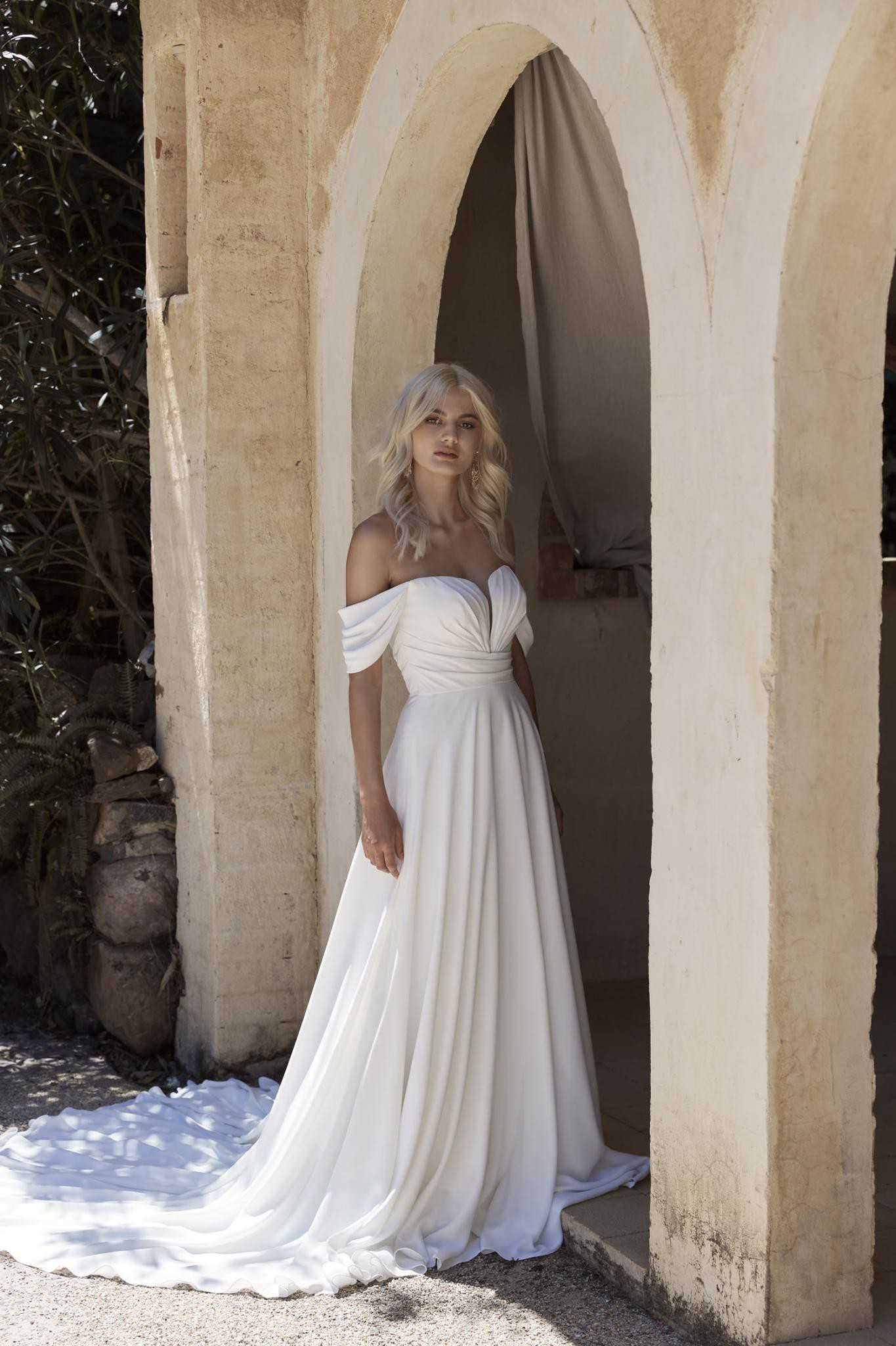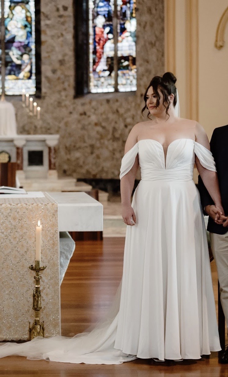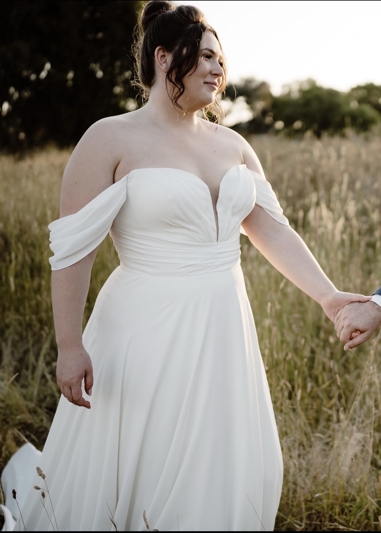 Speaking to the elegant minimalist bride, who still wants wow but without the embellishment. Serenes strapless soft square neckline with modest plunge and ruched off-shoulder straps blend synonymously with the pleated bodice really elevating this gown from simple to statement. Designed to draw the eye to the waist point with a cross-over pleating feature making it a flattering gown for any shape or size.