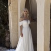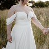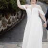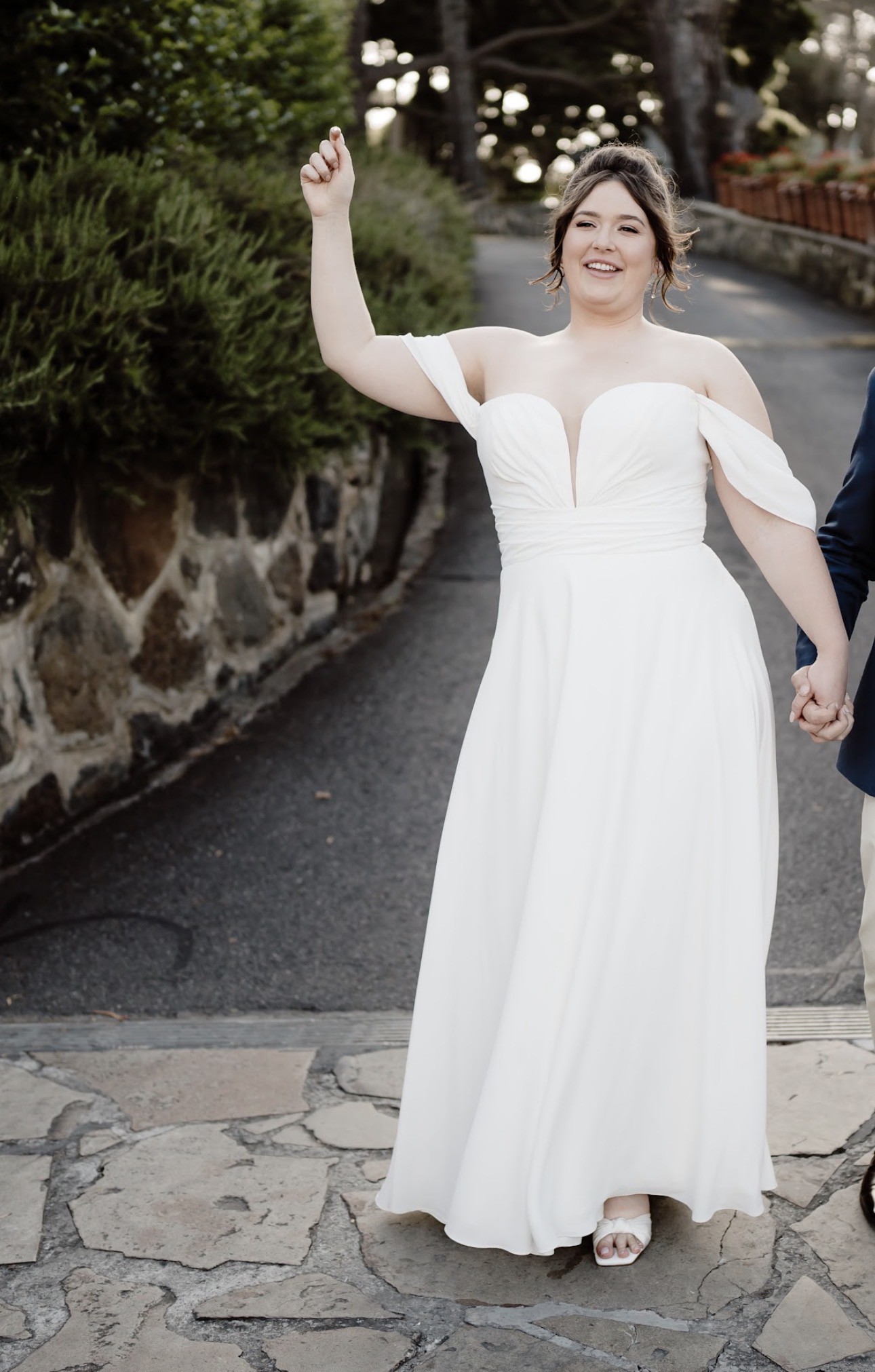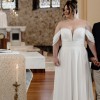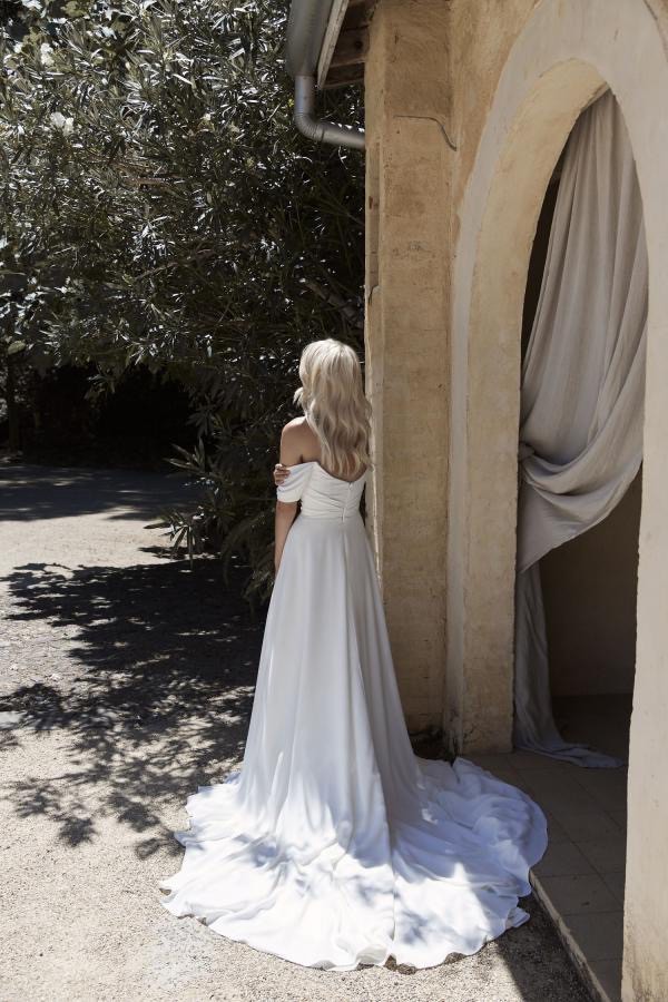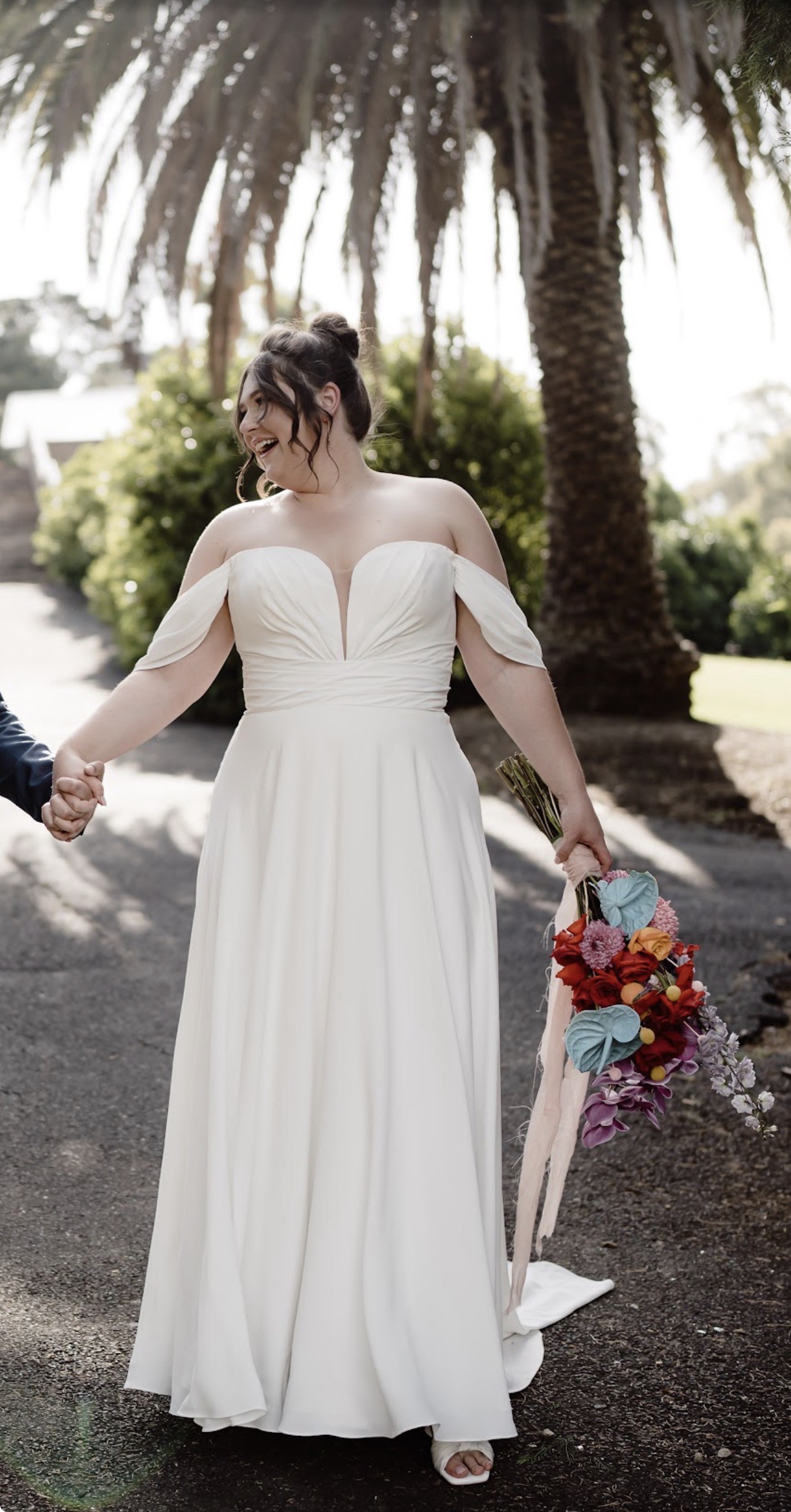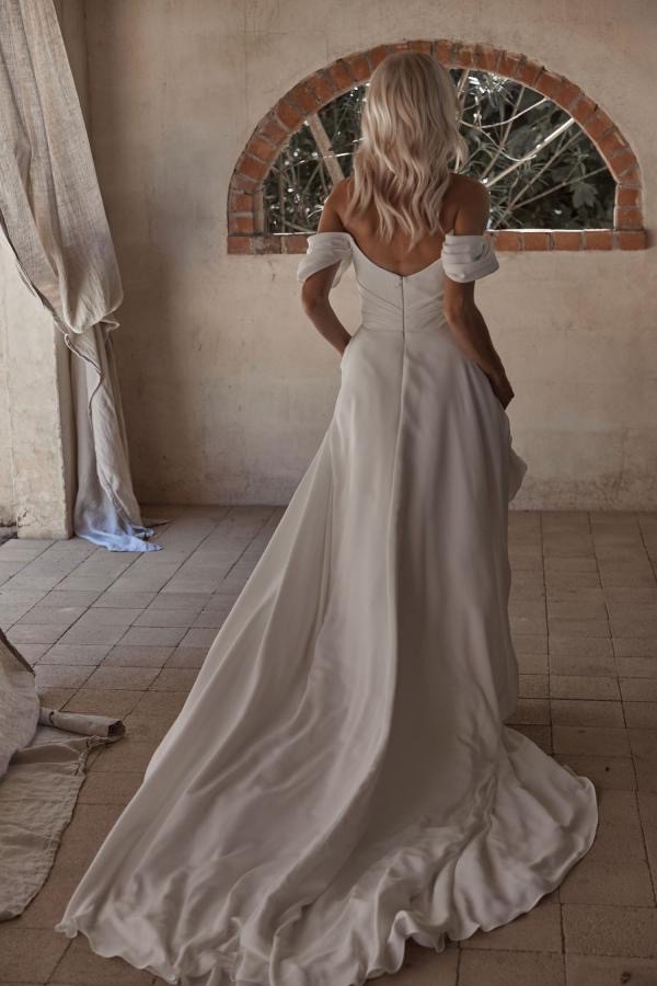 Speaking to the elegant minimalist bride, who still wants wow but without the embellishment. Serenes strapless soft square neckline with modest plunge and ruched off-shoulder straps blend synonymously with the pleated bodice really elevating this gown from simple to statement. Designed to draw the eye to the waist point with a cross-over pleating feature making it a flattering gown for any shape or size.