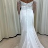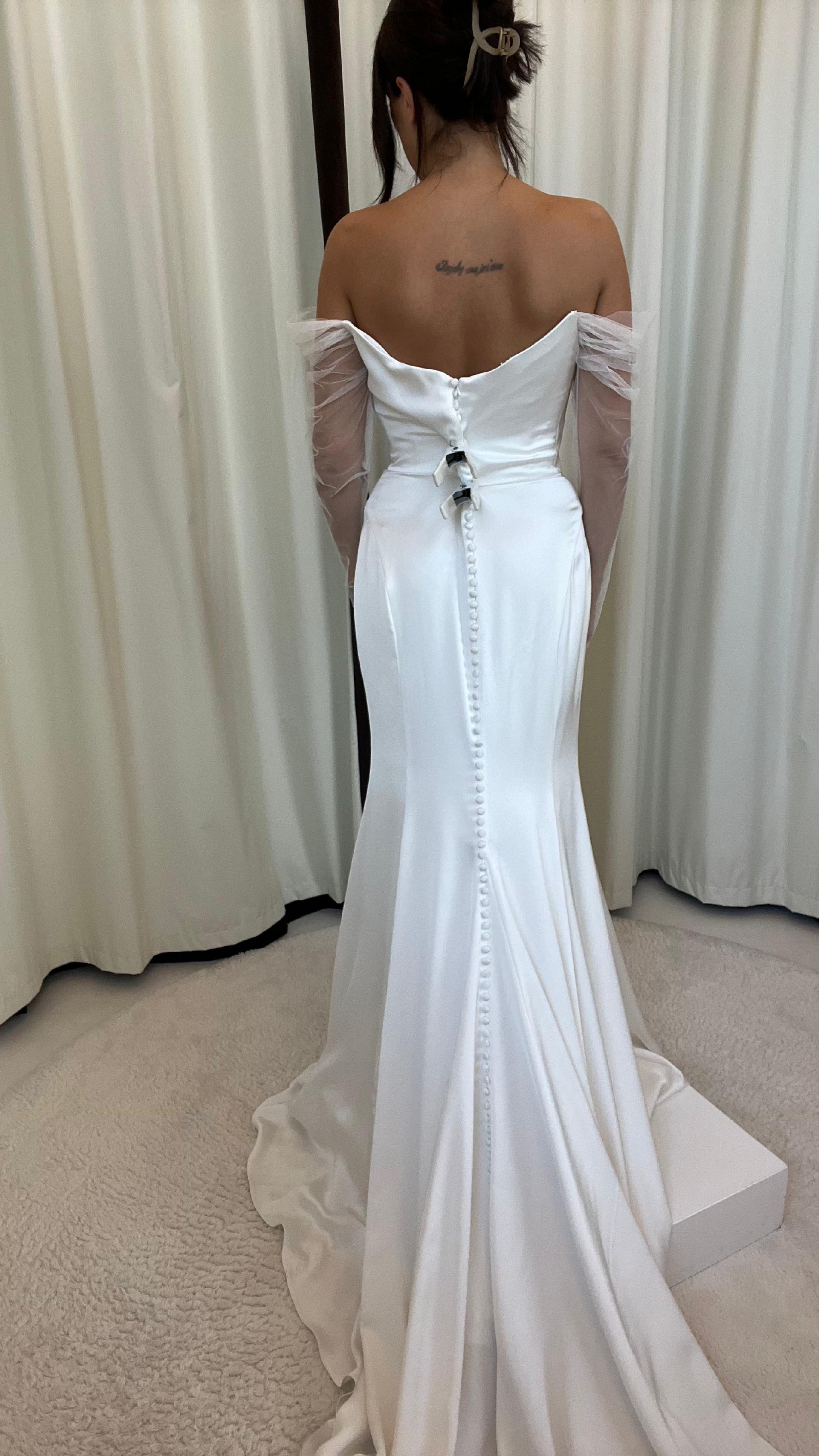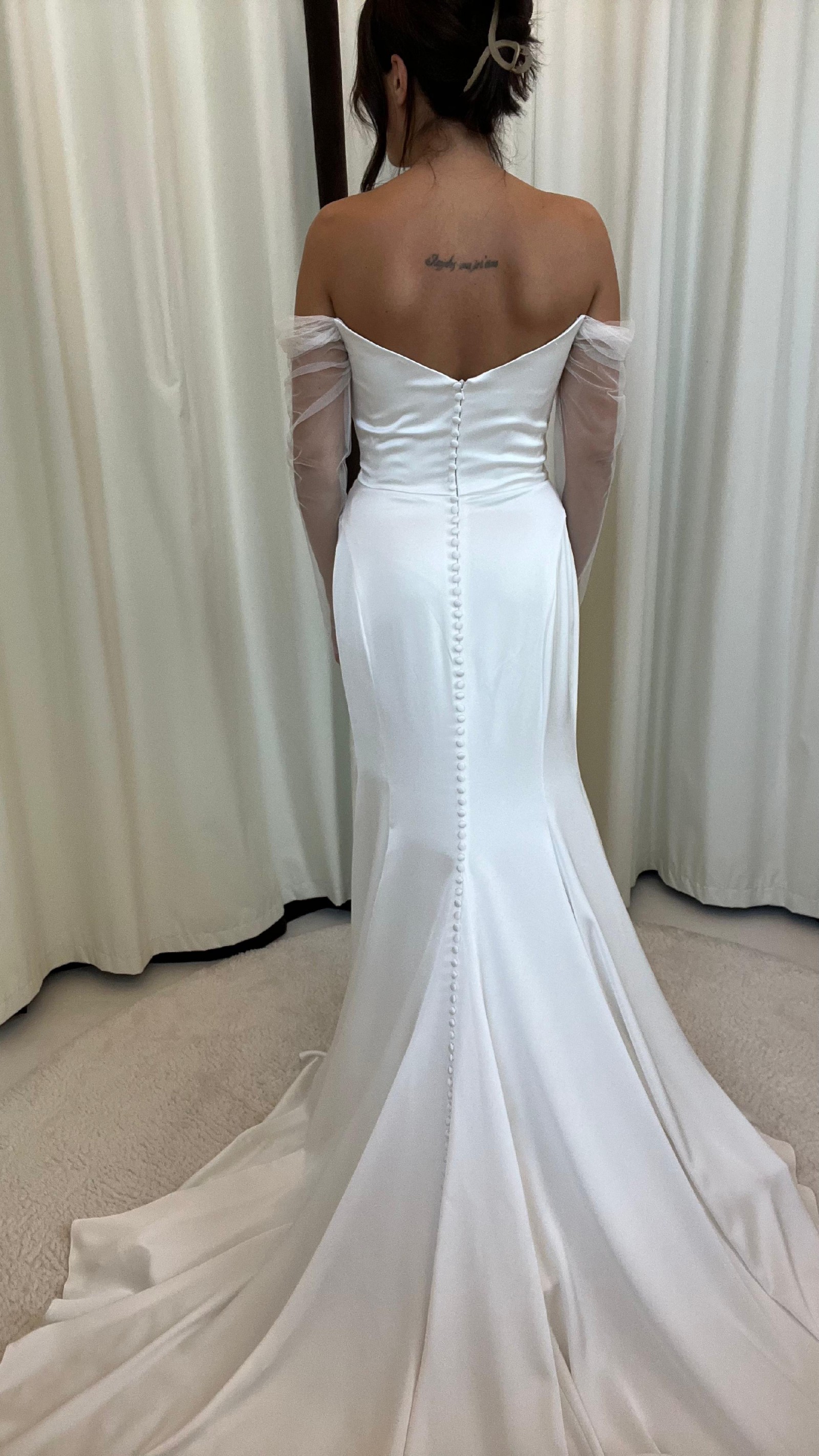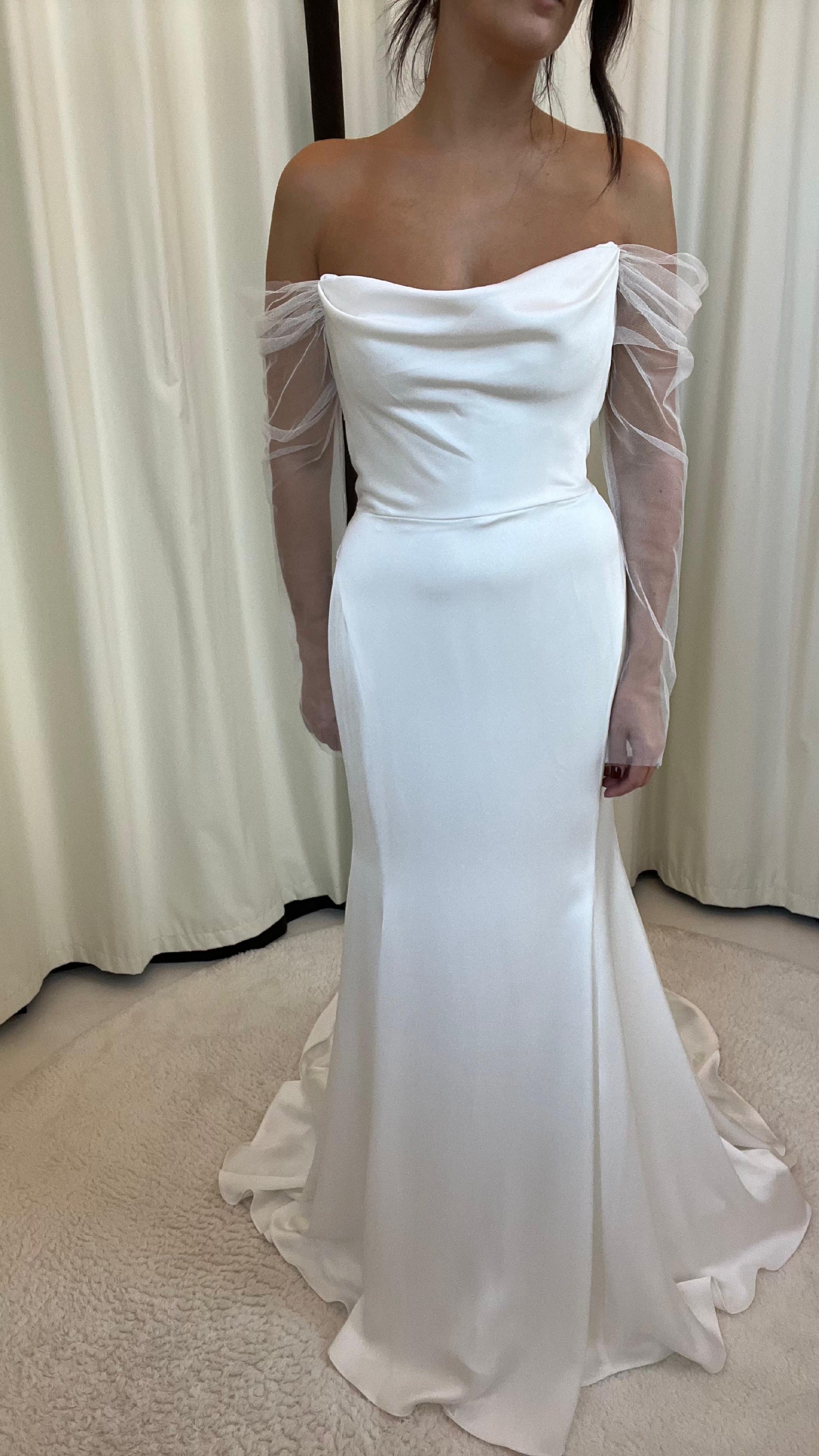 Modern details elevate and update the otherwise timeless silhouette of the Olivia gown. Cut in our elegantly fluid luxe satin fabric, the draped cowl bodice lead way to a sheer off the shoulder sleeve. Curved princess seams sculpt the fit and flare skirt, and detachable tulle streamers lend a hint of whimsy.