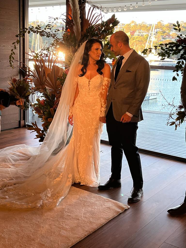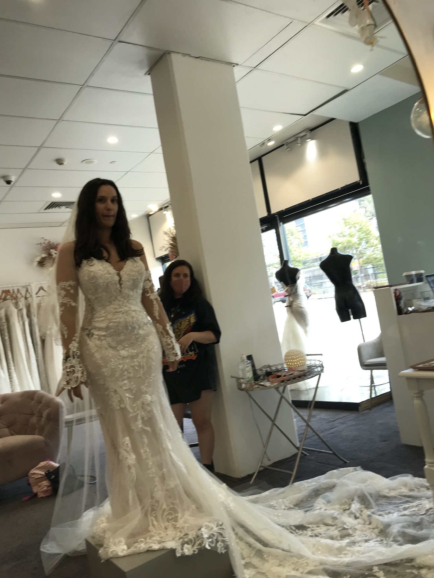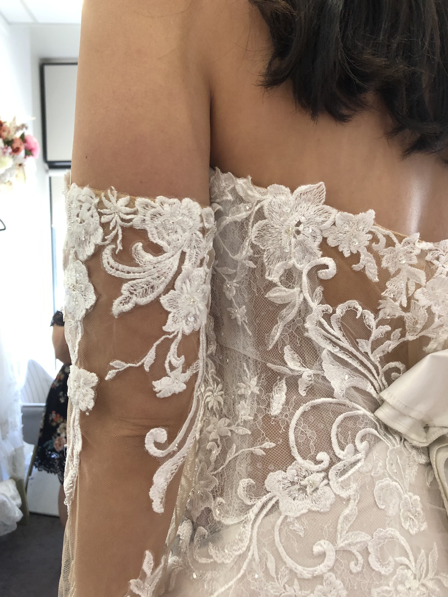 I loved my Sophia Tolli dress. I received so many compliments on it. I’m probably more like a size 9 in Australia. I had the dress adjusted. The sleeves are skin coloured. I took them off halfway through the night as it was more comfortable without them. I hope someone will enjoy and love this dress as much as I did.