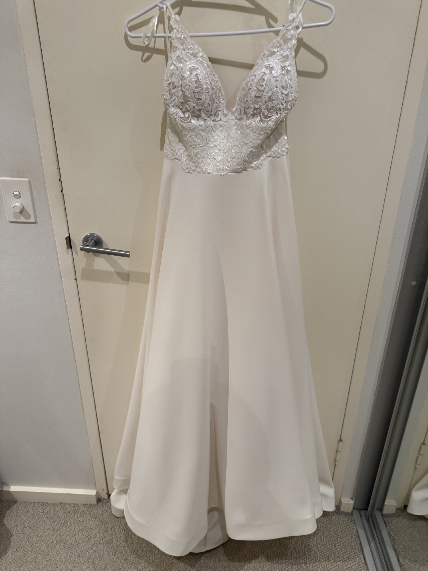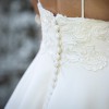 Beautiful Cizzy Bridal (style CZ8327) wedding dress in ivory. The lace bodice with spaghetti straps and low back gives it a romantic feel, and the satin A-line skirt flows perfectly — plus it has pockets!