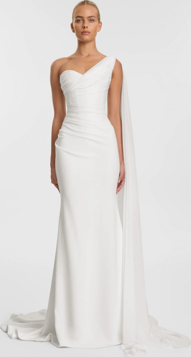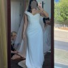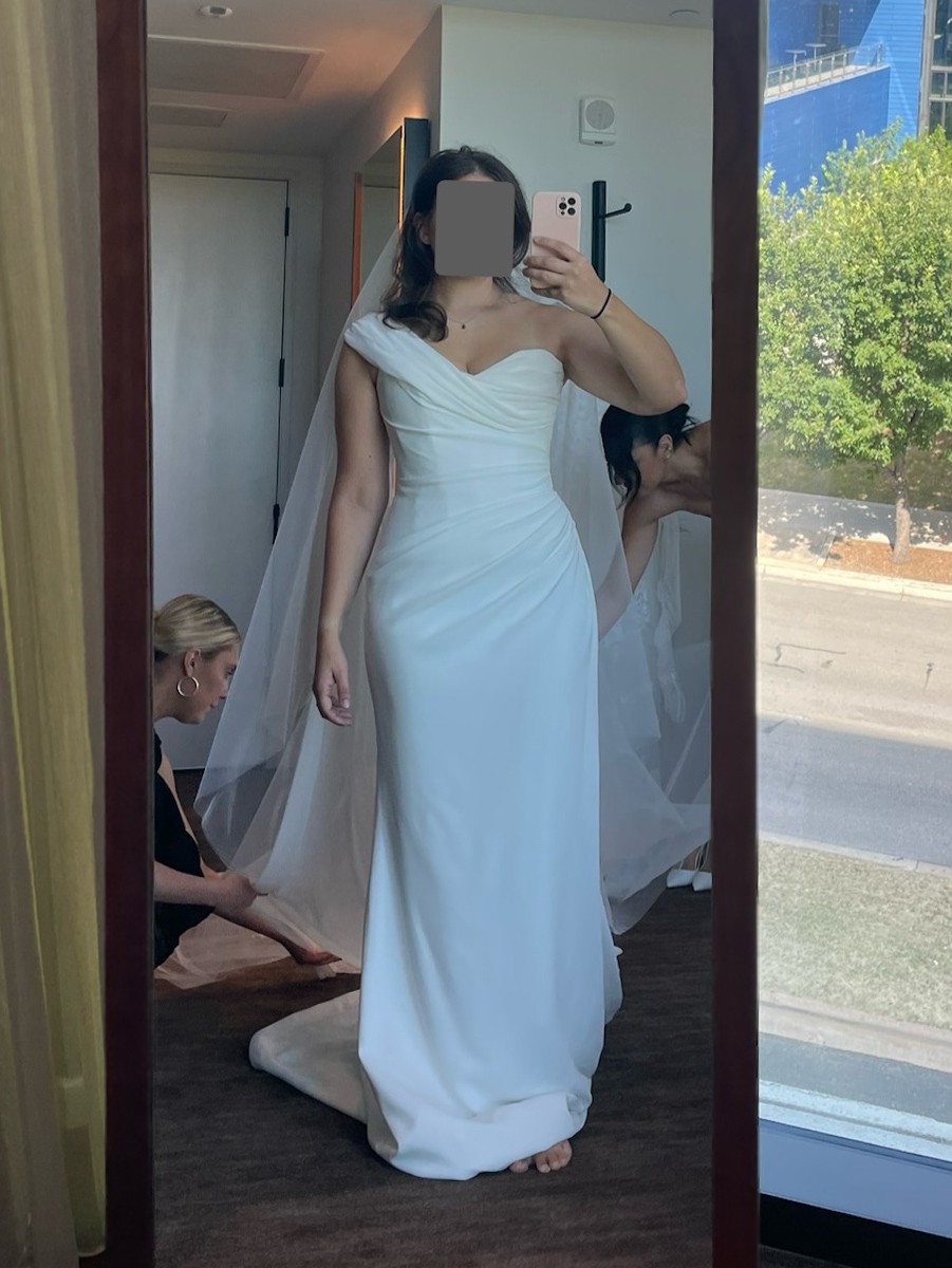 Gorgeous dress that I didn’t end up wearing - which means it’s ready for your perfect day. It’s an incredibly flattering silhouette with a wonderfully structured bodice. The perfect blend of effortlessly elegant while still feeling very bridal. It’s been professionally altered just in the hem to shorten it slightly (5’3” with 2.75” heels) and I had the shoulder strap shortened but in a way that’s easily reversed or adjusted.