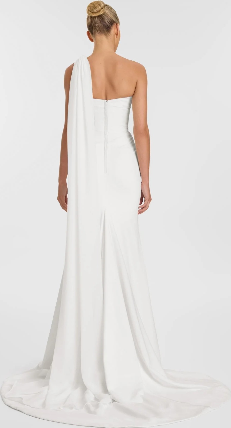 Elm delivers minimalism with maximum impact. A celebration of the female form, Elm creates a must-have fit and flare silhouette thanks to its structured bodice and fitted skirt to the knee. A chiffon overlay is directionally draped to draw the eye in, which finishes over the sweetheart neckline into a streamlined scarf to deliver a solid dose of something special.
