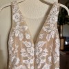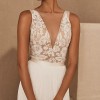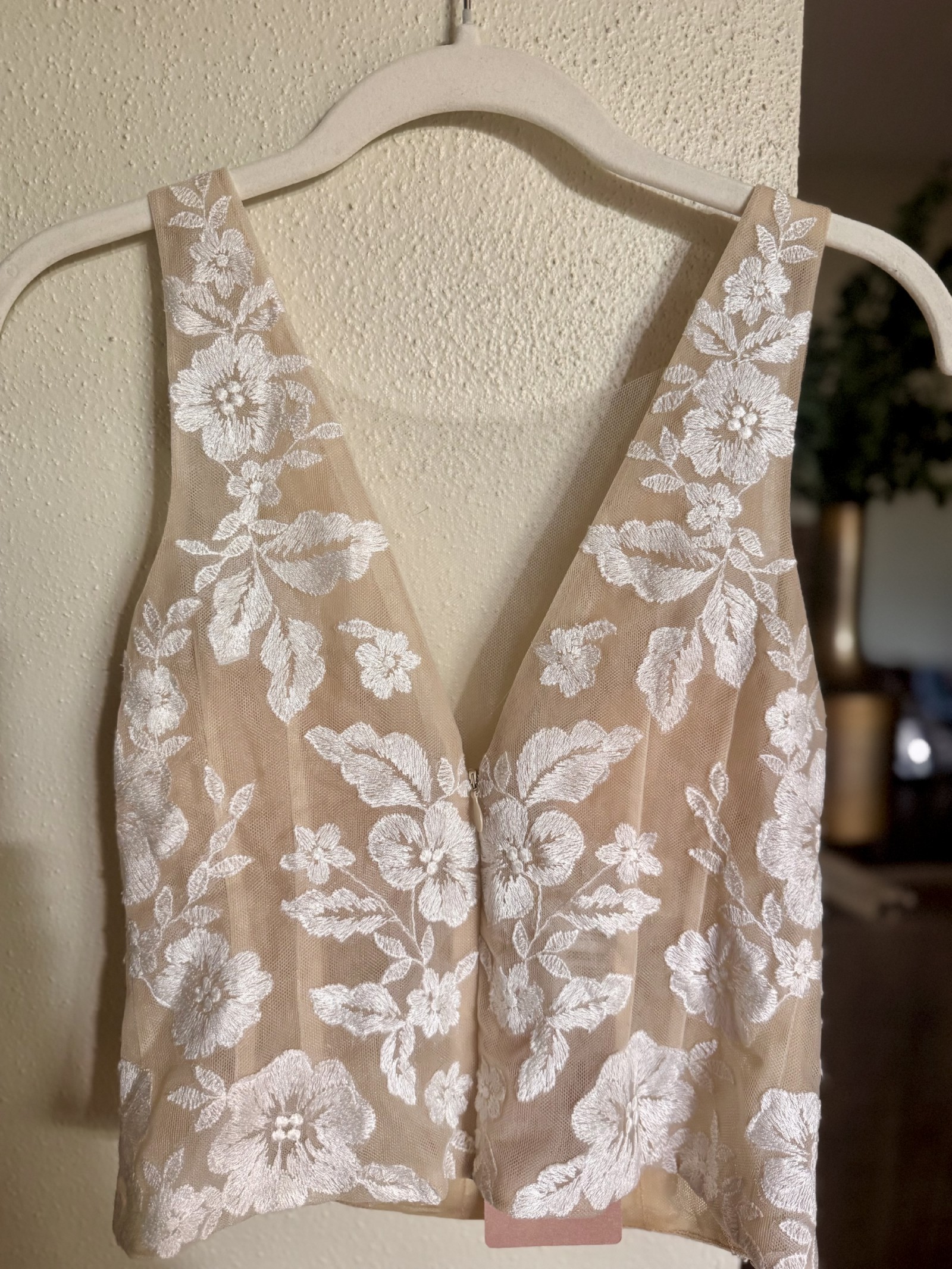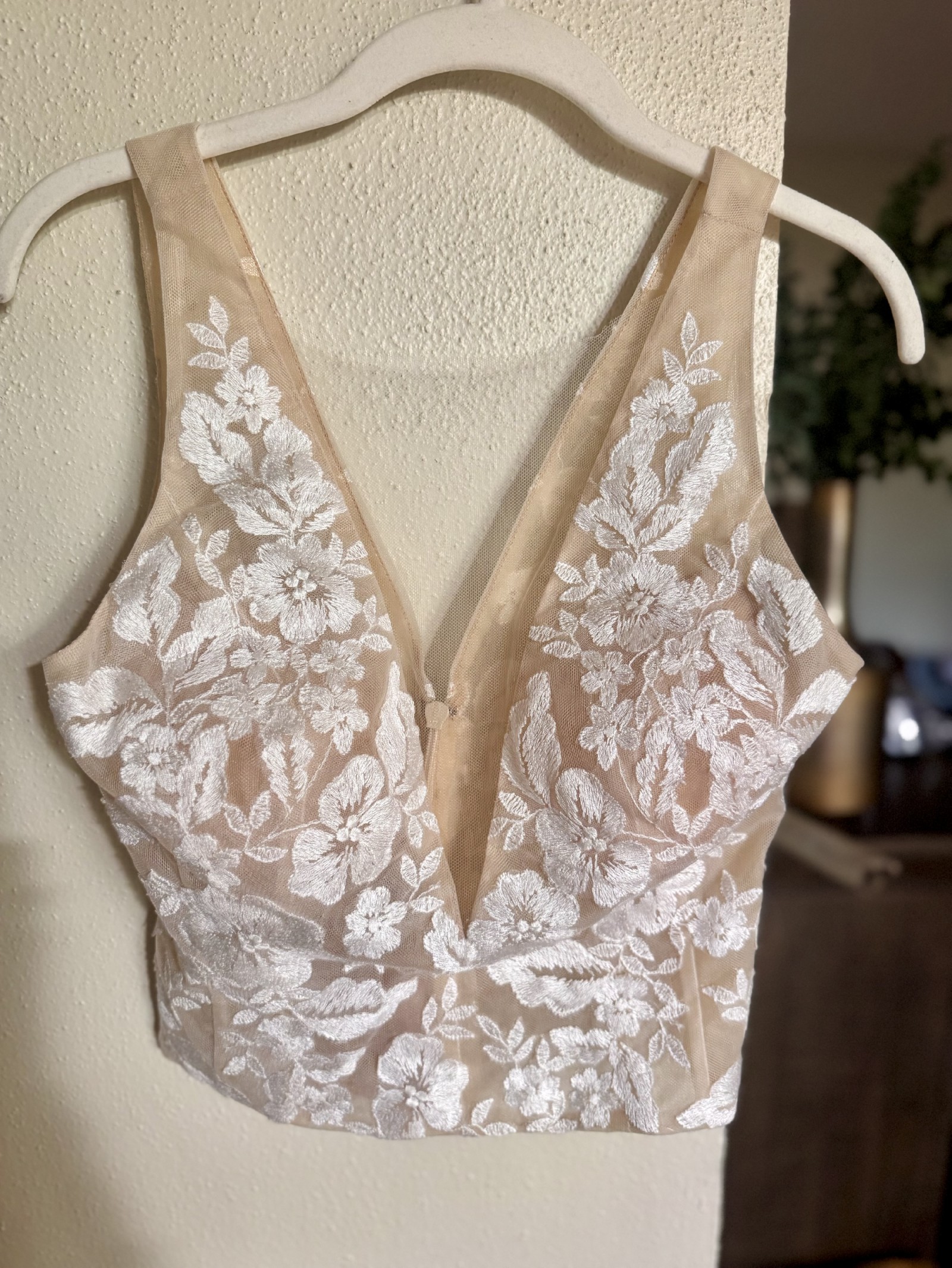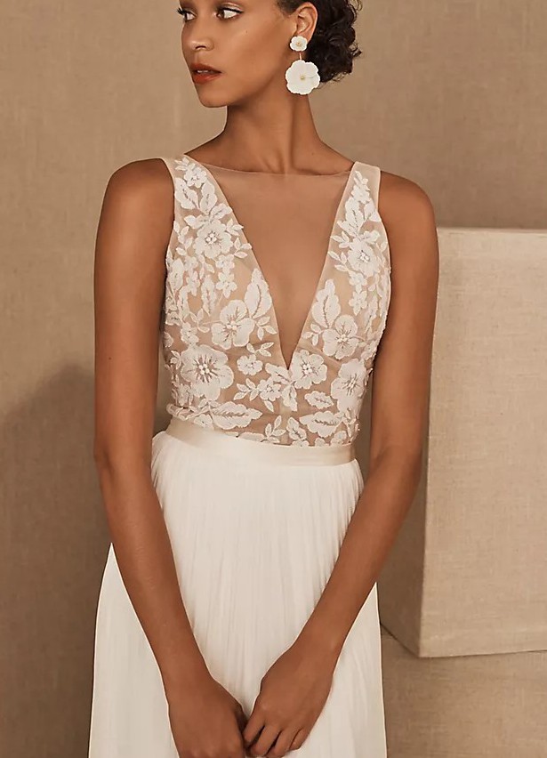 This romantic top features the illusion of a sheer plunging neckline, beautifully detailed with intricate ivory floral embroidery. Fully lined for comfort and coverage, it offers a delicate yet refined bridal look.