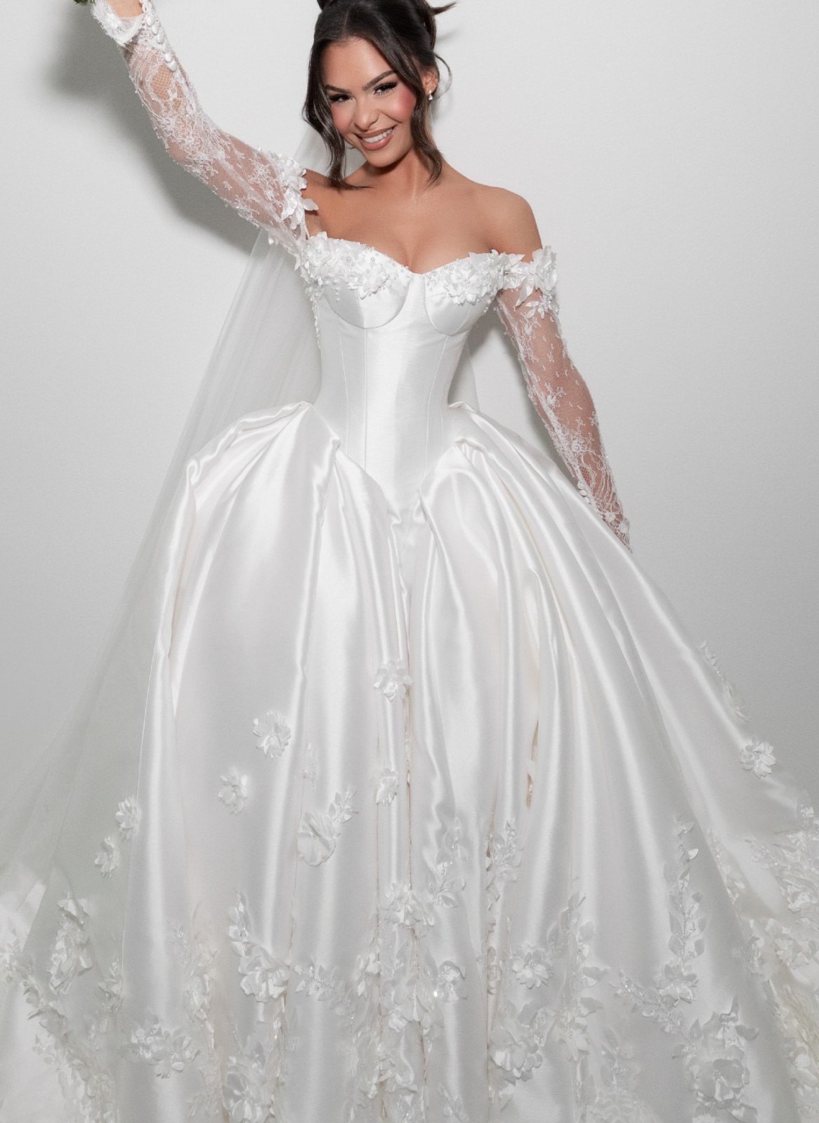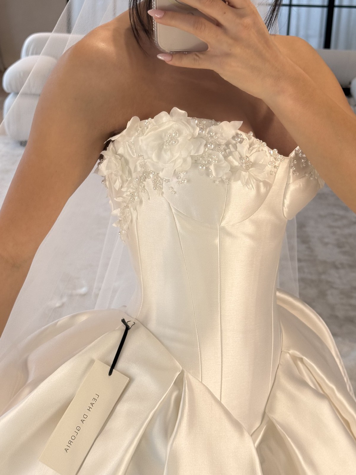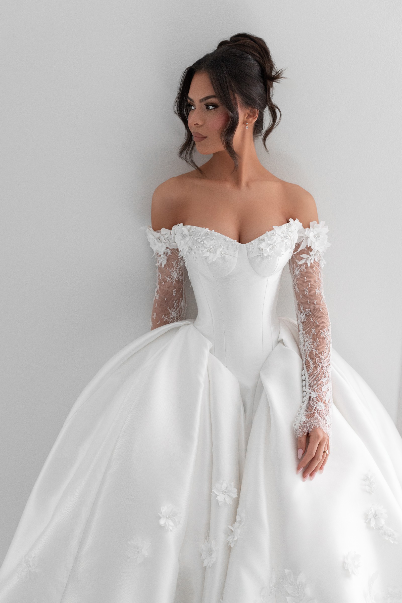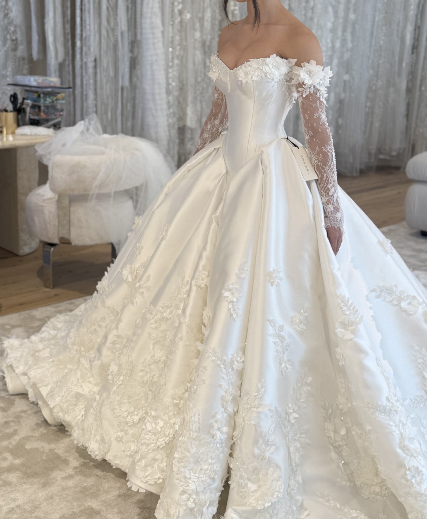 A custom-made silk drop waist ballgown featuring a structured corset bodice adorned with 3D flowers, pearls and sequins, completed with lace detachable sleeves.