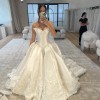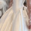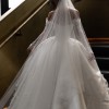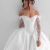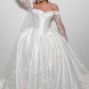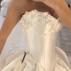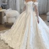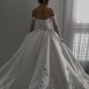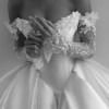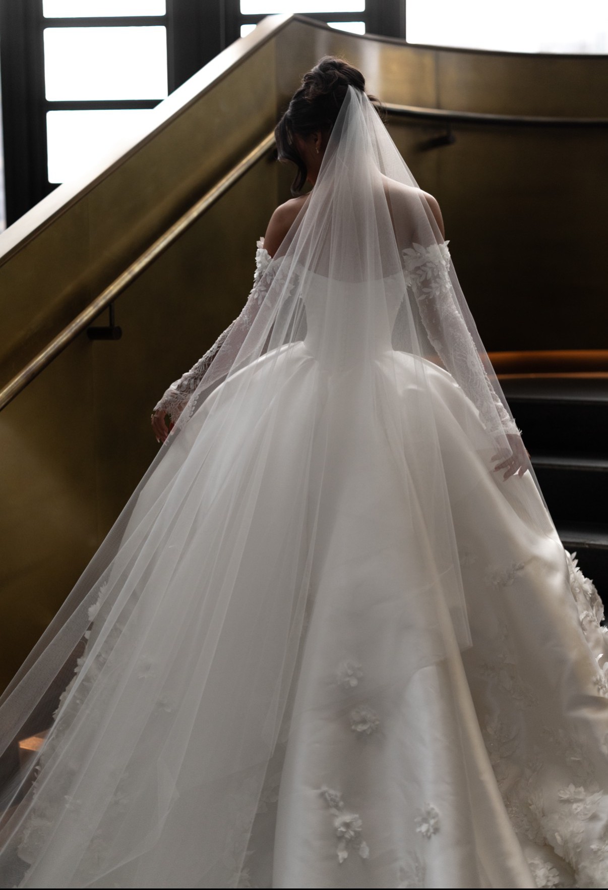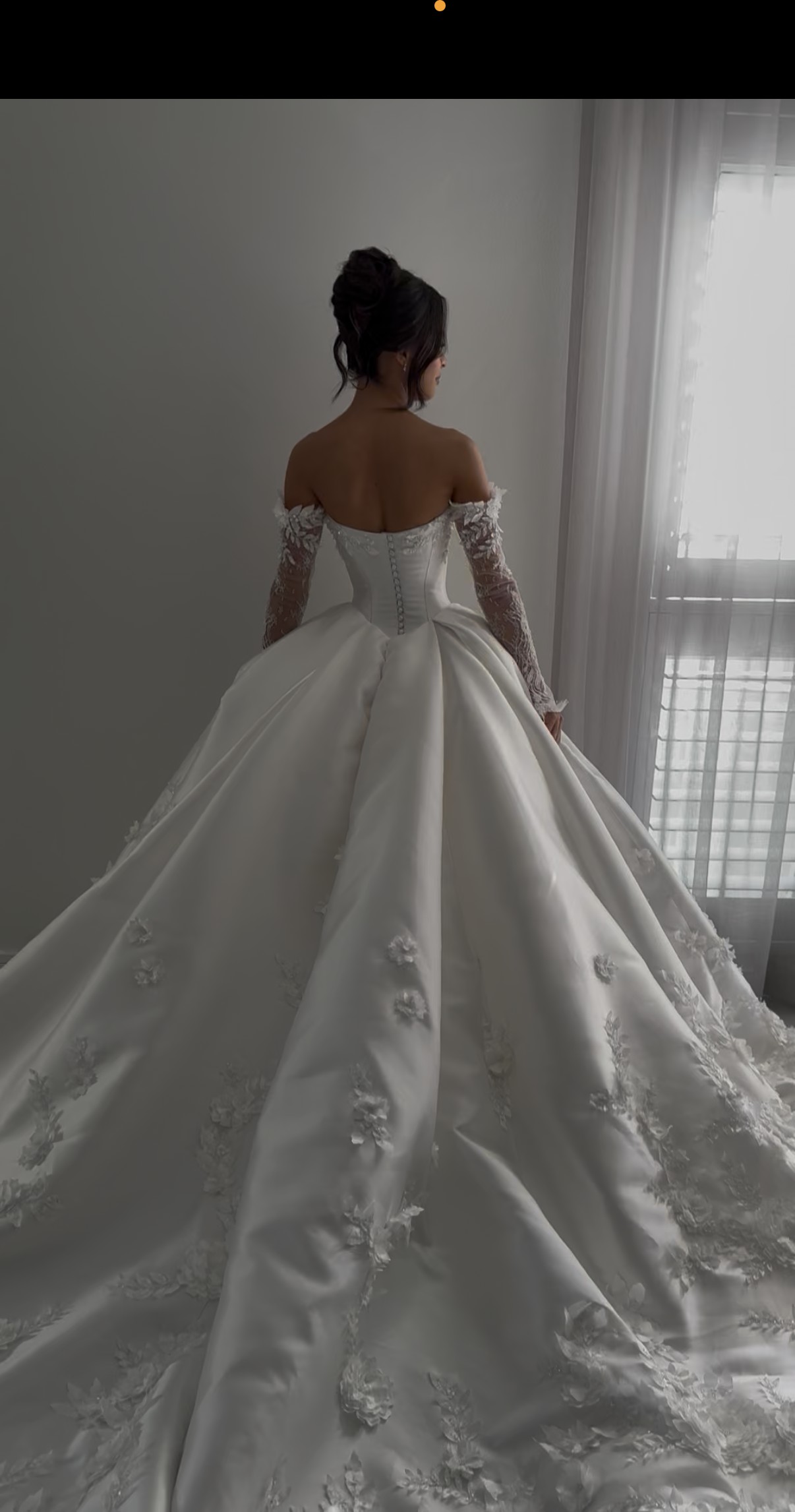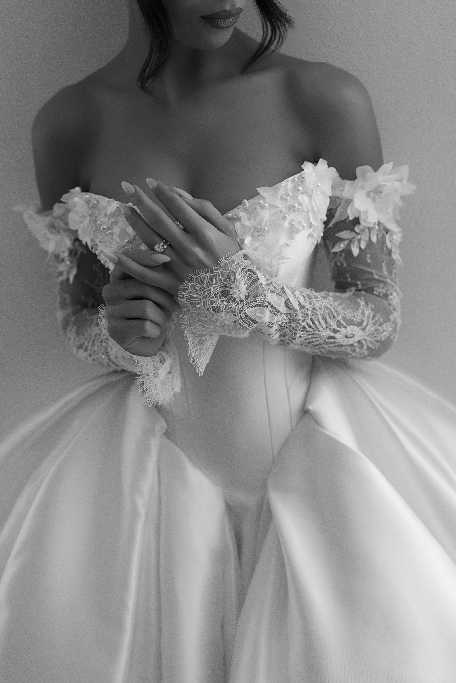 A custom-made silk drop waist ballgown featuring a structured corset bodice adorned with 3D flowers, pearls and sequins, completed with lace detachable sleeves.