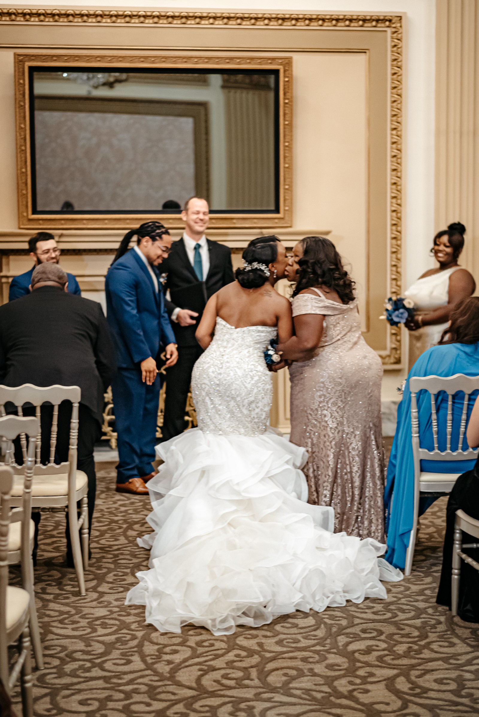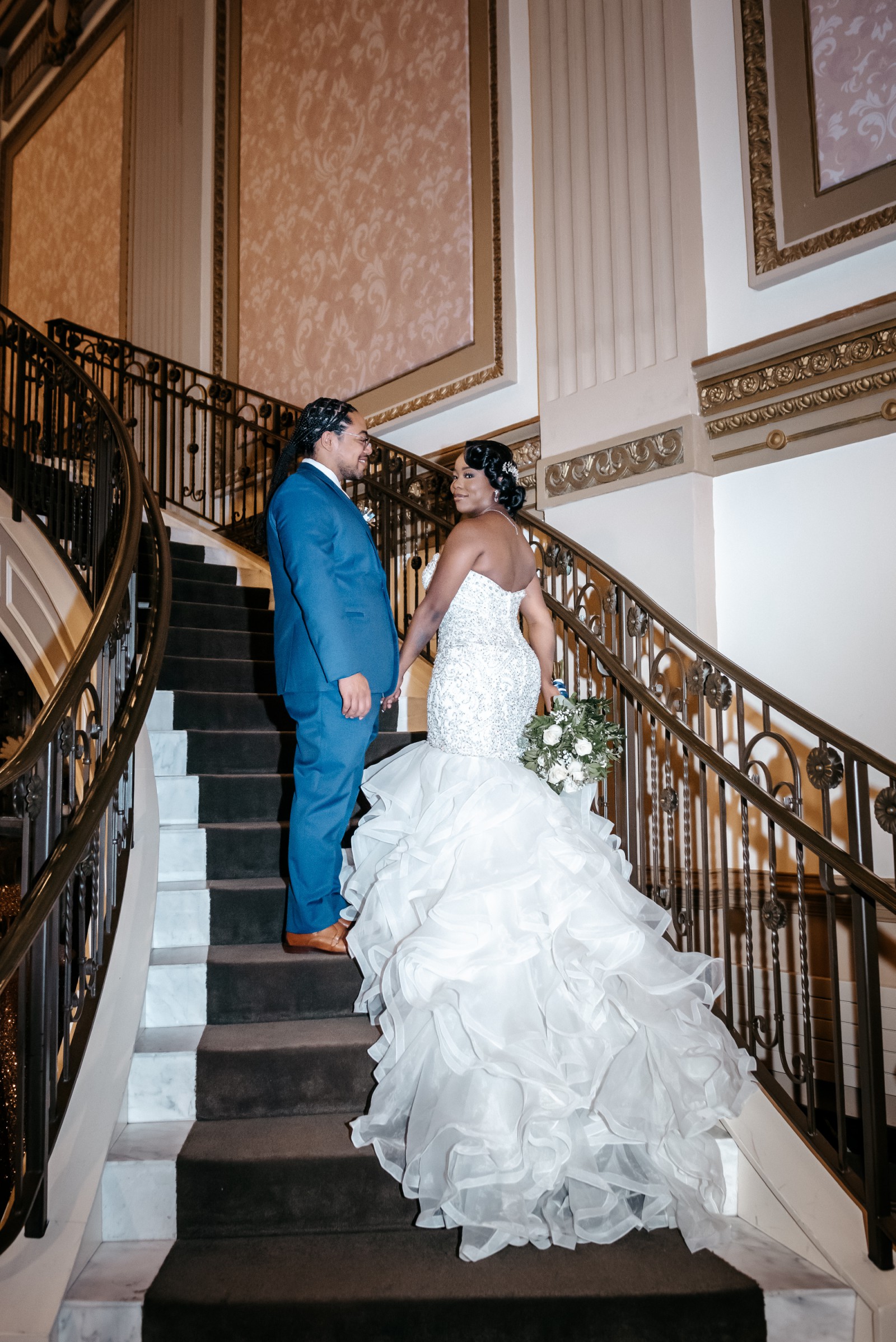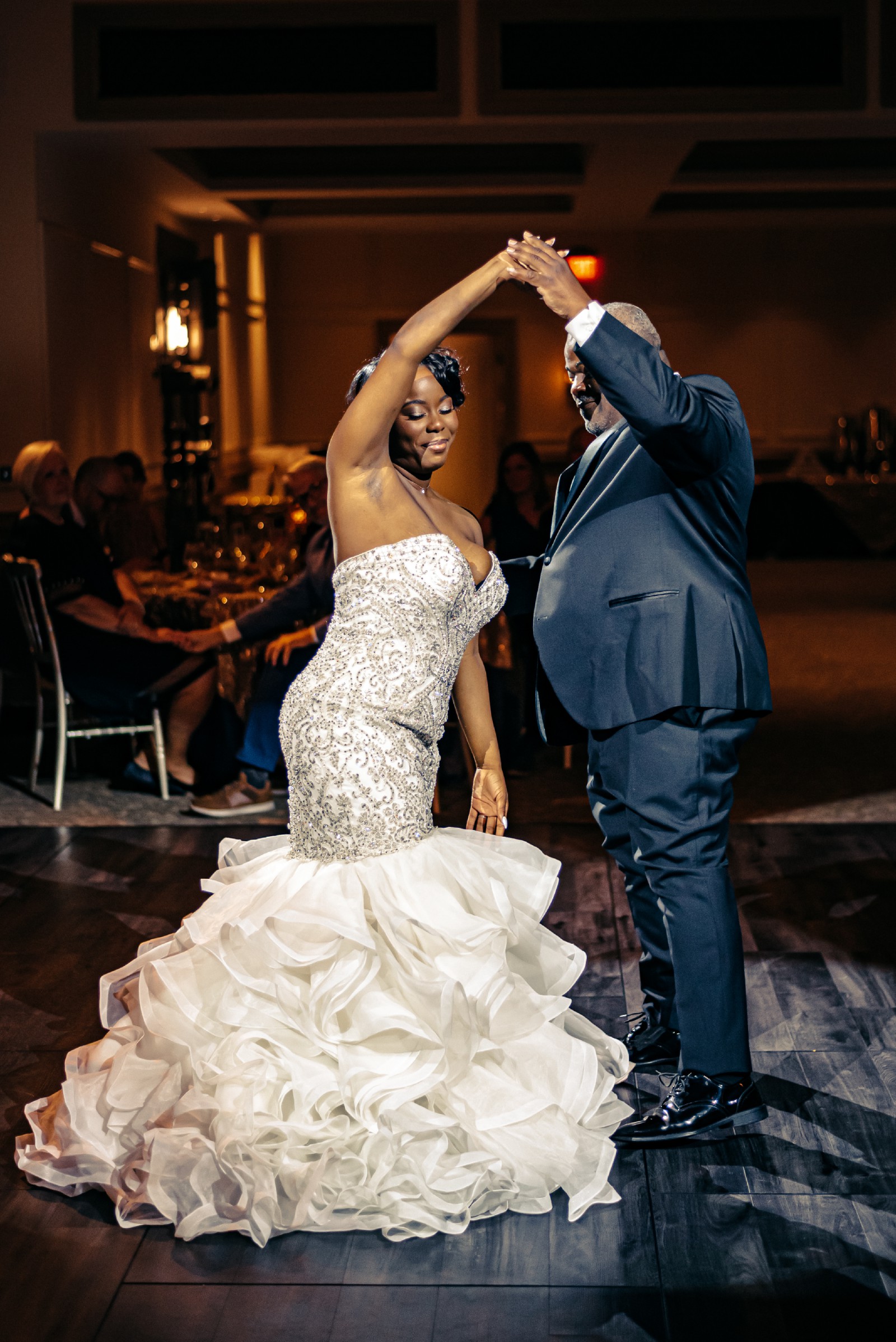 The intricate details truly make this dress distinctive. Adorned with crystals, exquisite embroidery, and delicate ruffles, every angle sparkles with a hint of magic, while the shimmering sequins catch the light in the most enchanting way. It’s floor-length, making it ideal for an enchanting evening ceremony or a grand ballroom celebration.