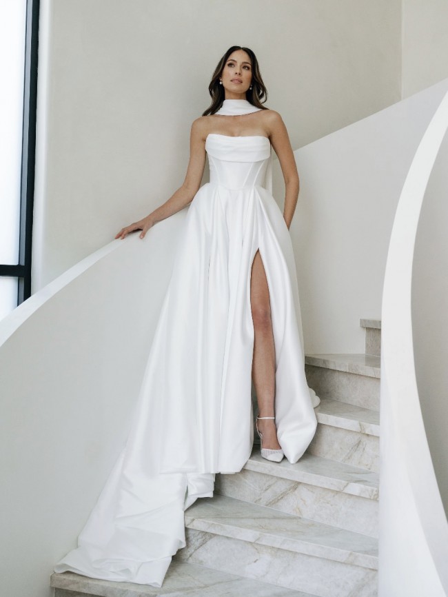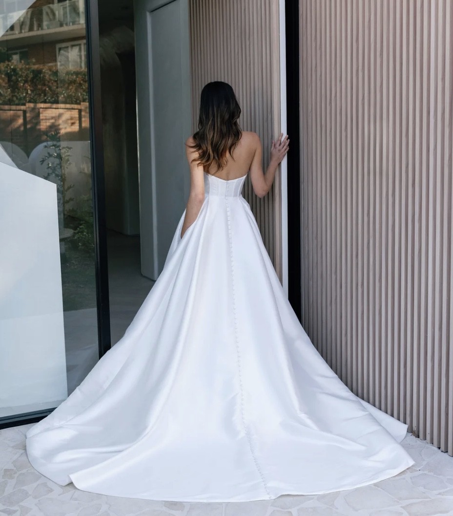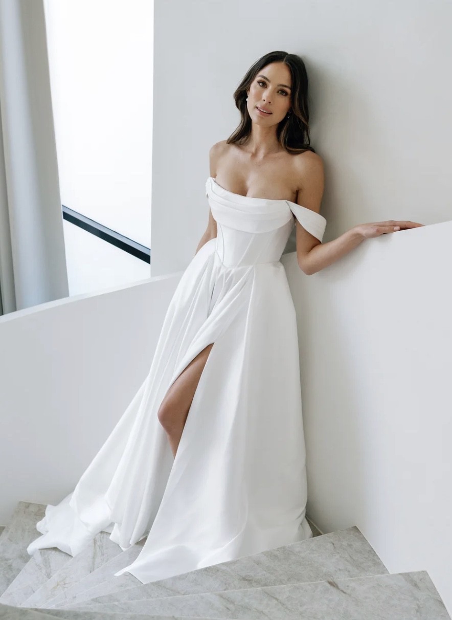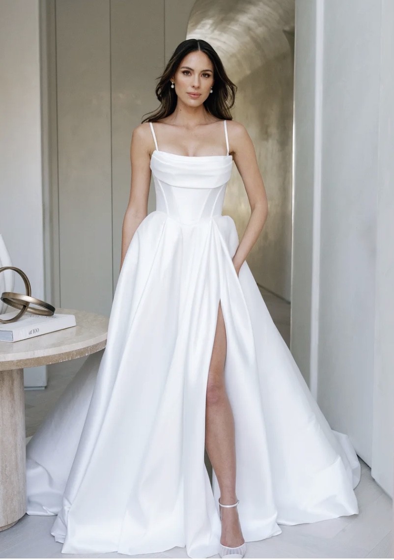 The viral dress that broke the internet redefined! Crafted from their signature mikado fabric, the Avery V3 features a fully lined back and a flattering basque waistline with boning that beautifully angles in and cinches the waist. Known for its versatile styling, Avery Version 3 includes detachable off-the-shoulder draped sleeves, spaghetti straps, and an optional bustle for added drama.