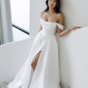 Comes with removable straps, thin and off the shoulder as shown in the different photos. It also comes with a bustle you can attach underneath to make the back more poofy.