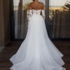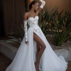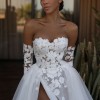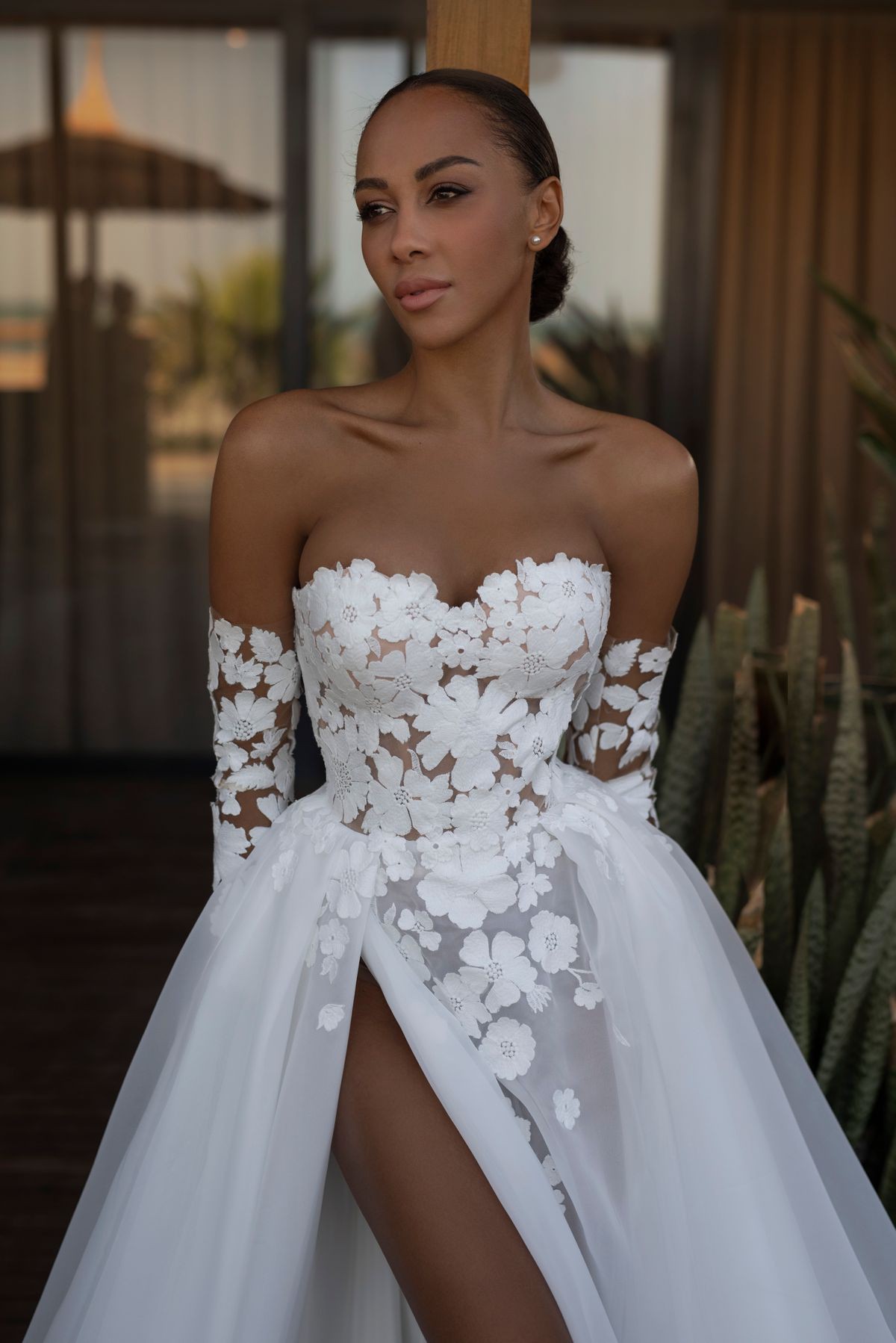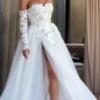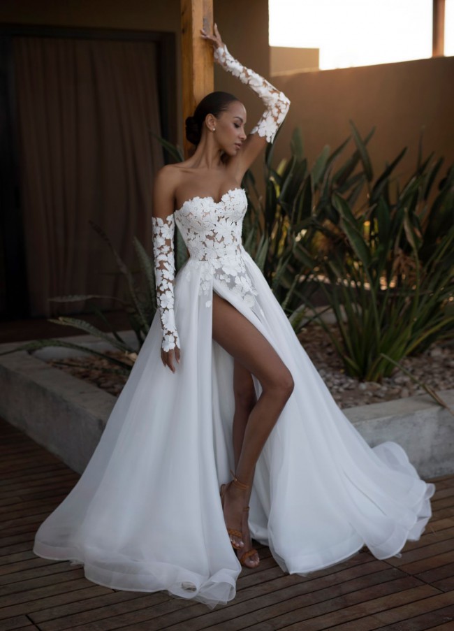 This wedding dress is a beautiful mix of modern and romantic style. It has a fitted, strapless bodice made from sheer fabric with delicate 3D lace flowers. The same floral lace continues onto the long, removable sleeves, adding an elegant touch.