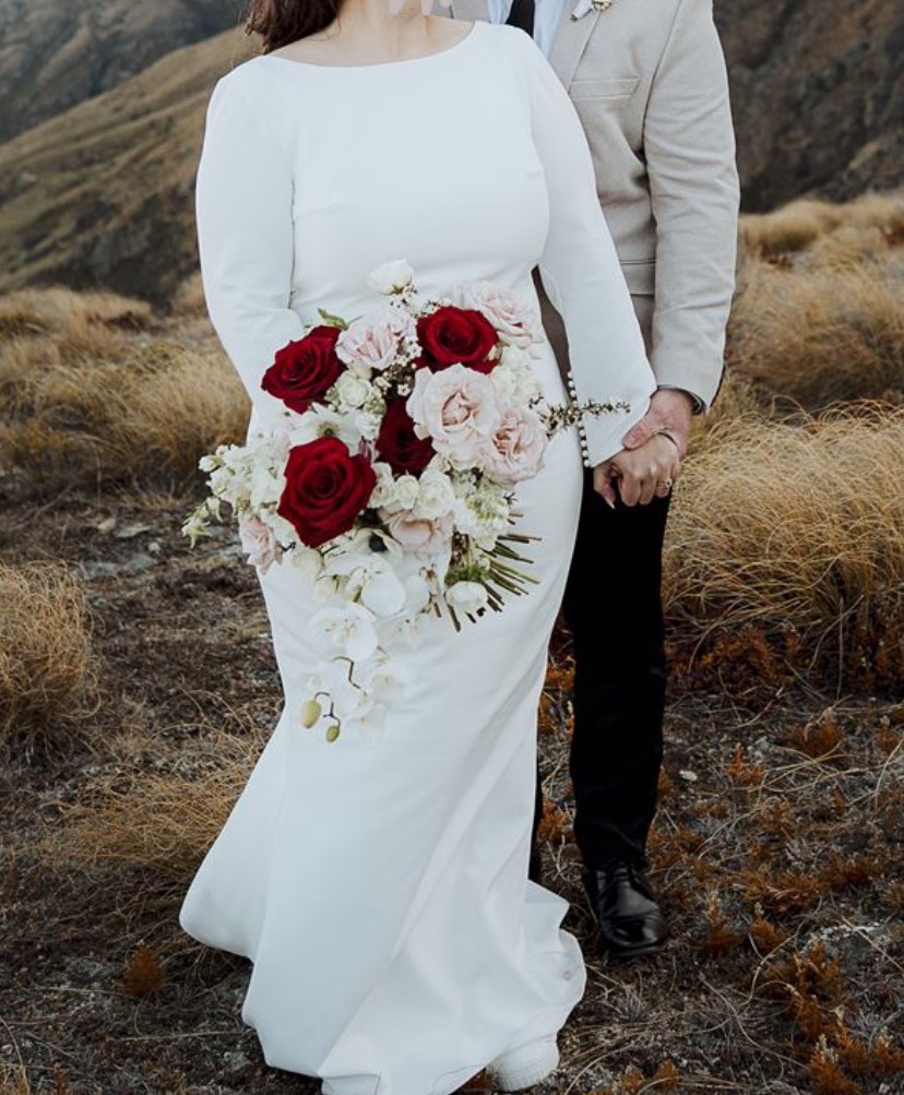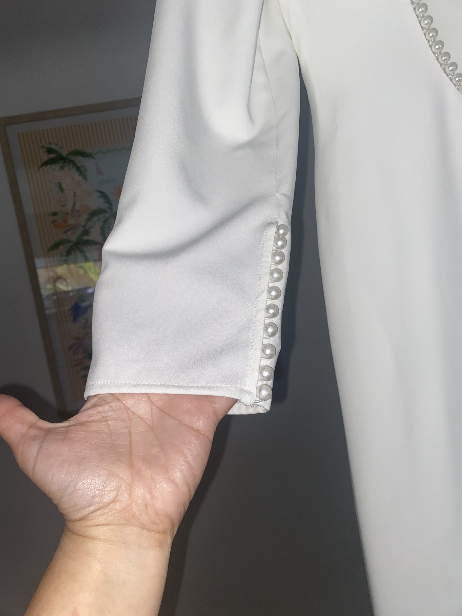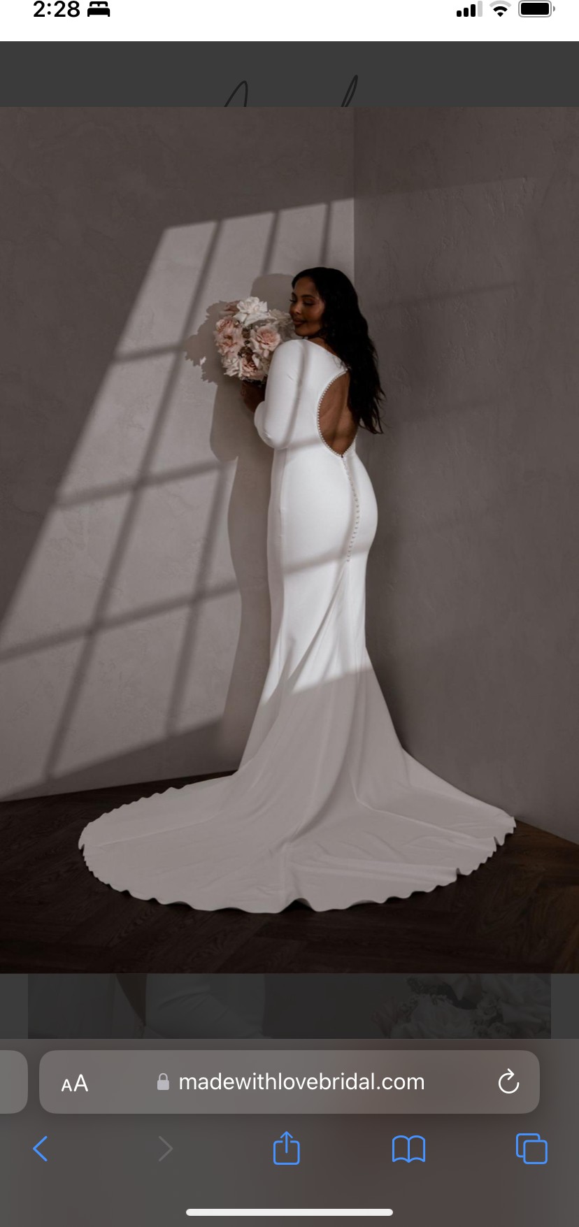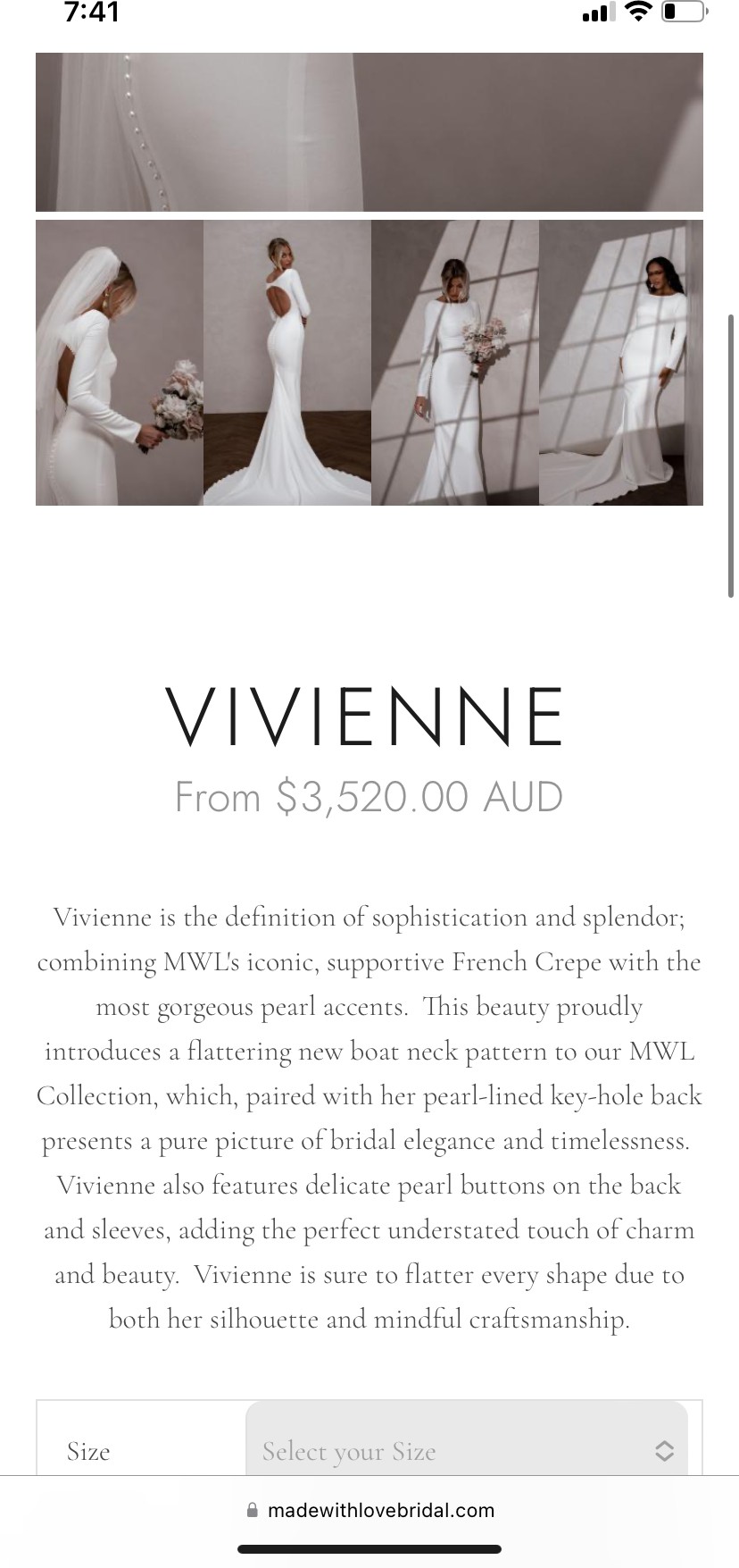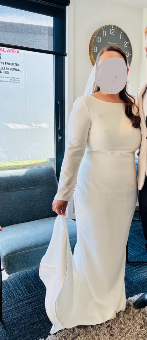 Dress has been altered for a shorter, curvier figure. I’m a size [removed]cm tall. Train was made shorter and dress was taken out at the hips. Hips can therefore be taken back in to original seam for someone less curvy. Happy to provide interested buyers an image of me in it for comparison. Neckline to front hem is 144cm. Train length 36cm. Sleeve length (shoulder to wrist) 60cm. Original bust cups removed but kept and will be provided with dress. Can be easily reattached. Extra pearls provided. Will me mailed in original MWL storage box. Has been cleaned, some feint markings along hemline from wear.