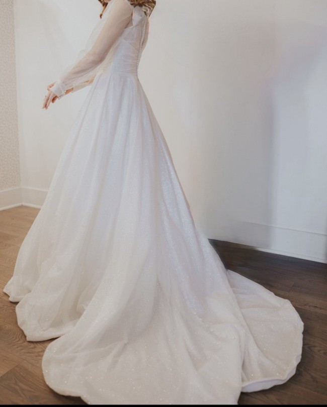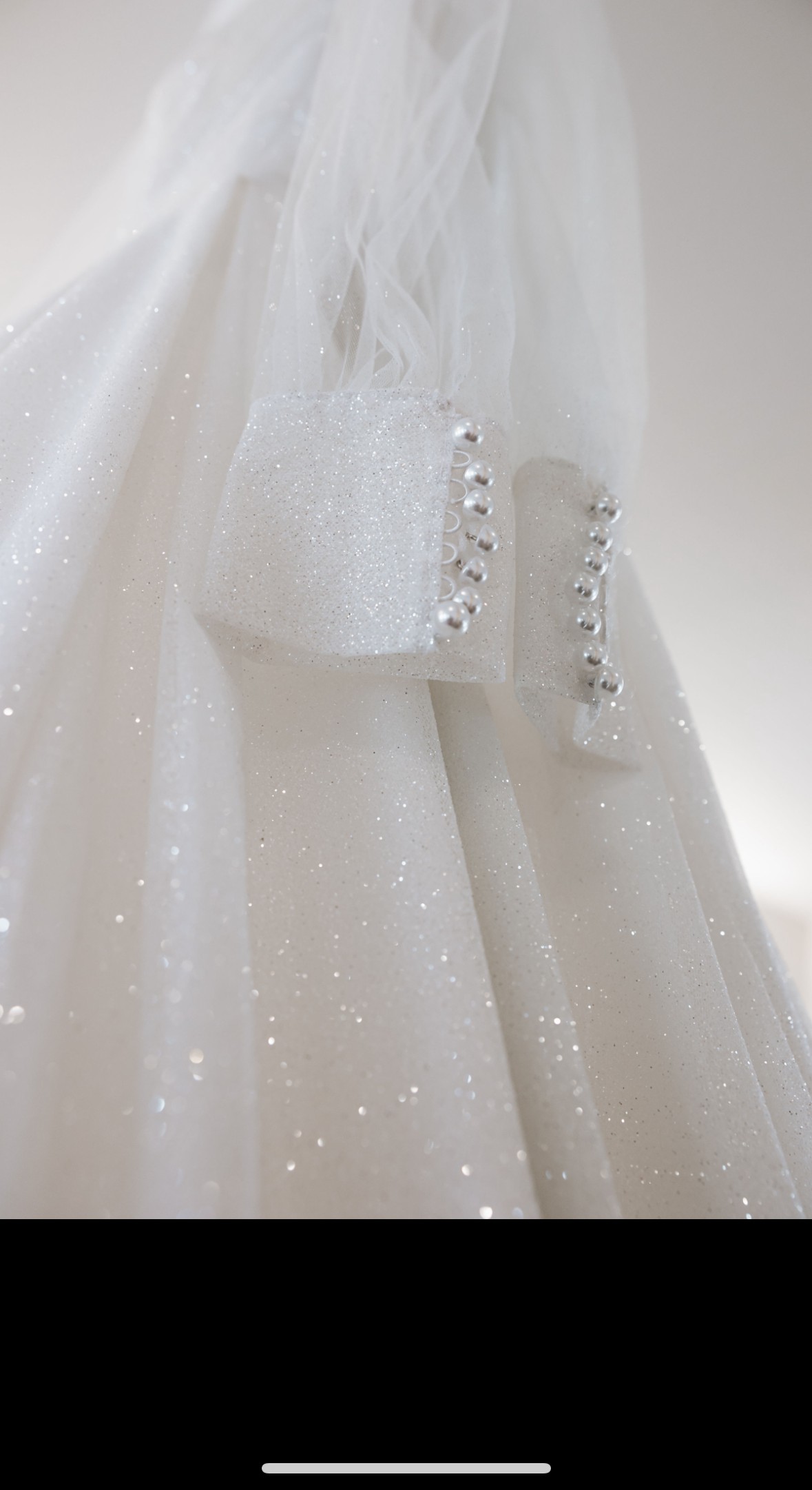lace overlay, sequined long sleeves, cathedral train, transparent sleeves, bridal heels, vintage-inspired, glass slipper, sparkly fabric, elegant design, wedding accessories ✨send me a message for more details ❤️
