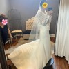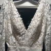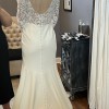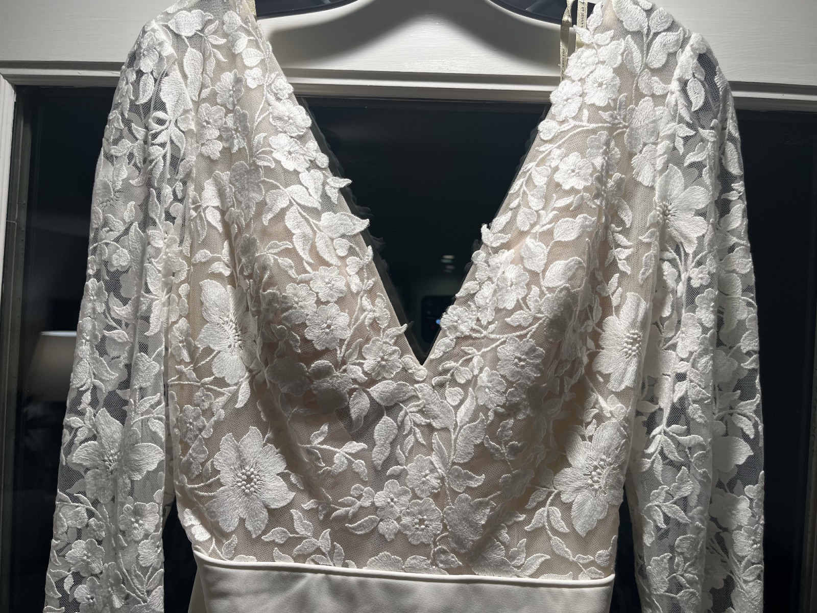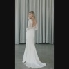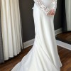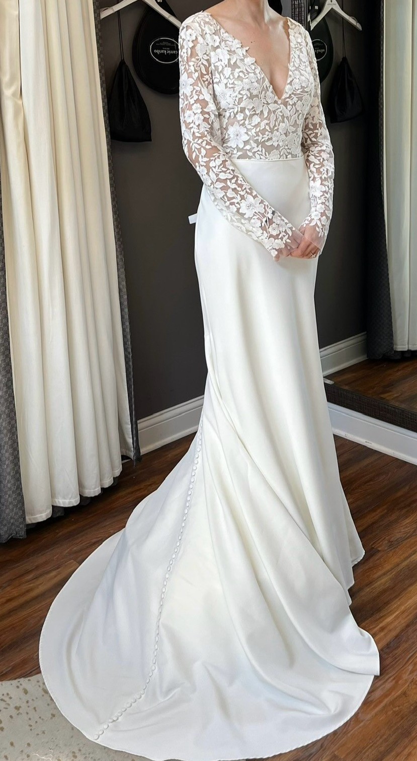 Includes: sheer illusion bodice- nude, floral embroidery, matte crepe skirt, V neck, long sleeves, low scoop back, bust cups, chapel length train, skirt is fully lined, invisible back zipper, covered buttons to hem.