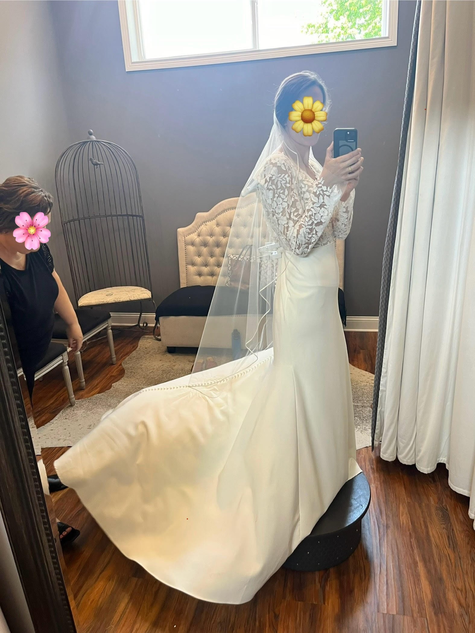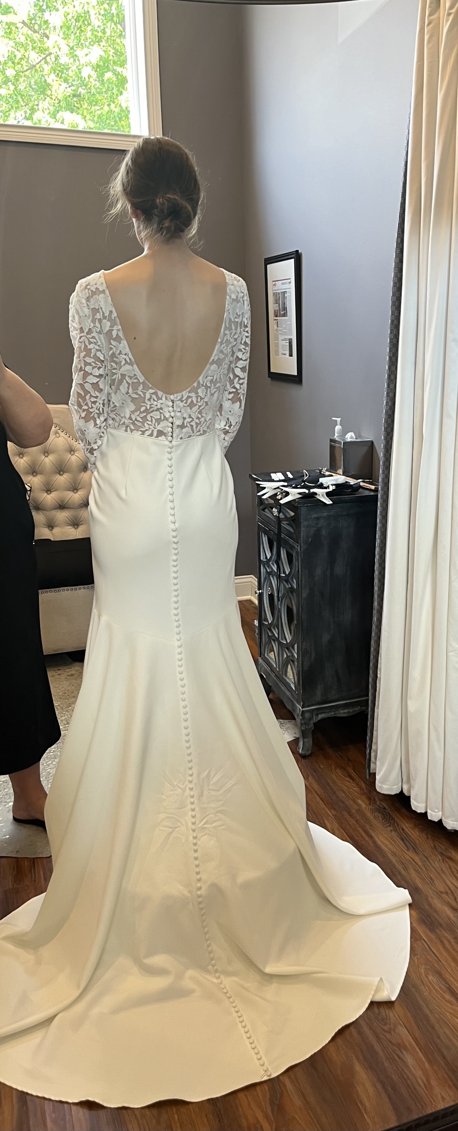 I adore this dress - it remains my favorite dress I tried on (and I tried on dozens of dresses!). I ended up needing to purchase a dress off the rack later towards my wedding after gaining some weight, as I was seeking a bit more coverage around the hips.