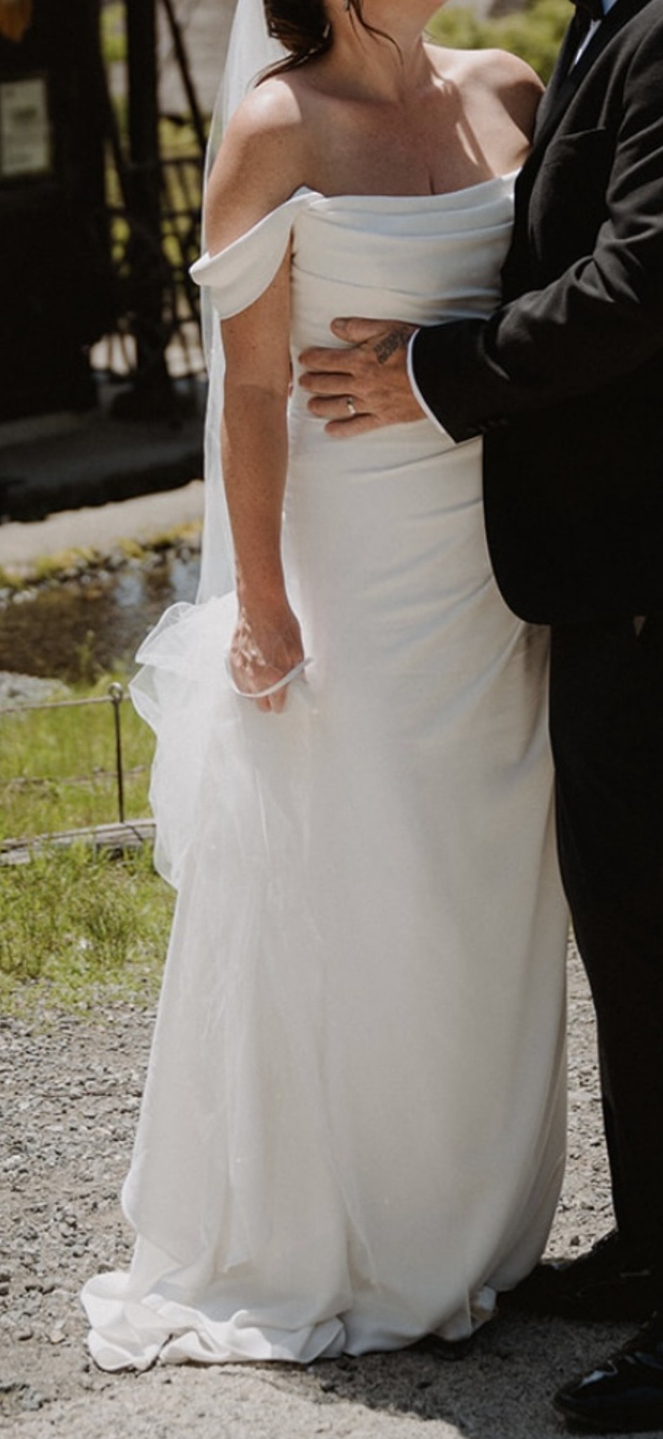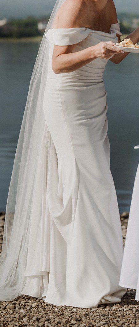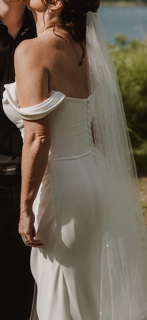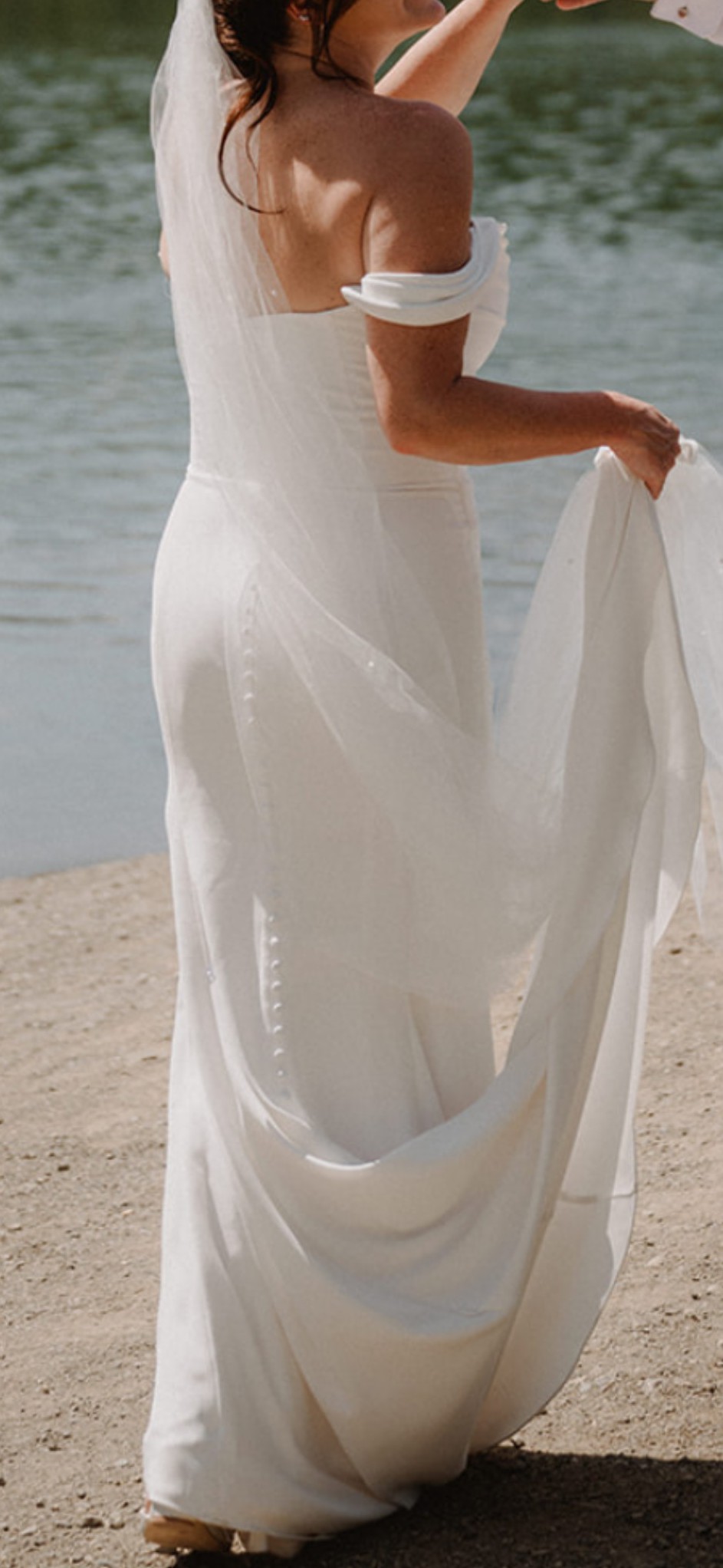 Crafted in soft stretch crepe with ruching and corset boning to sculpt your waistline, she’s made to flatter – and made to move. From the straight neckline and detachable off-shoulder sleeves, to the full row of buttons down the train, every detail feels effortless.