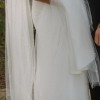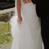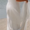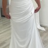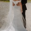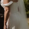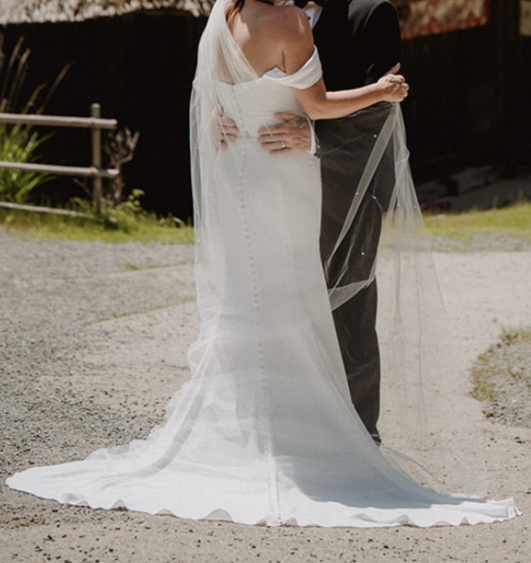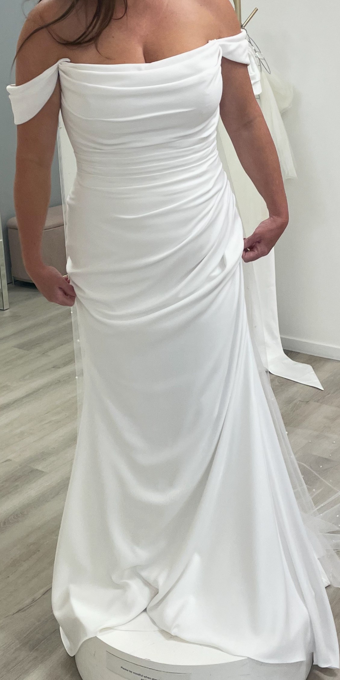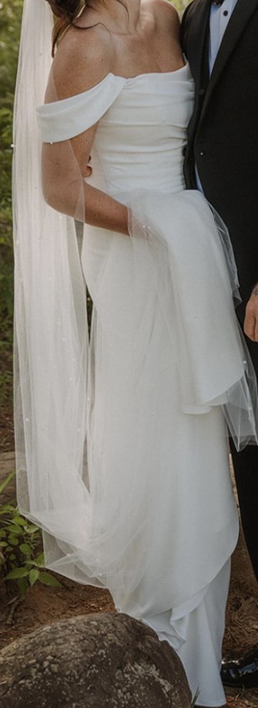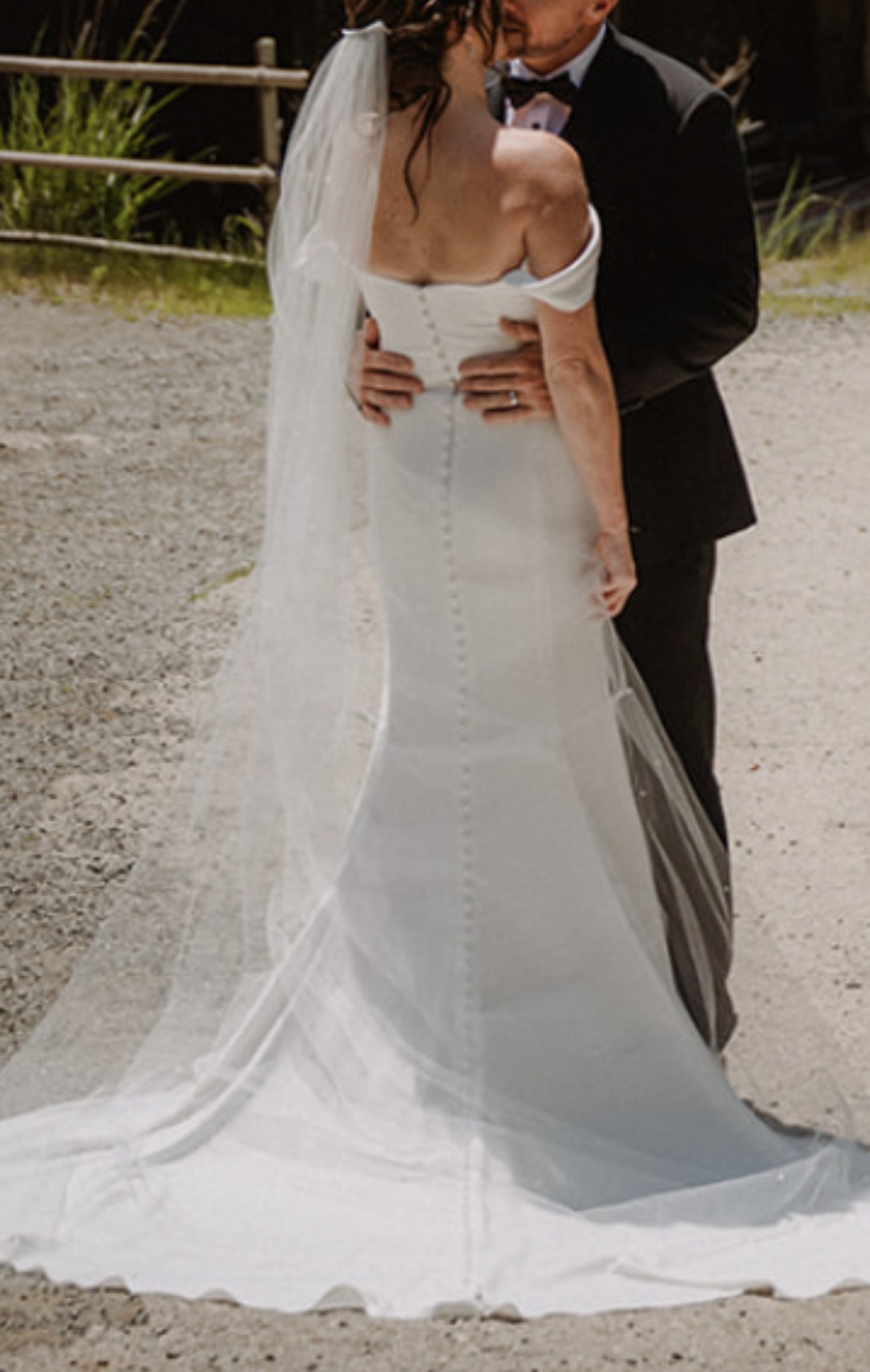 Crafted in soft stretch crepe with ruching and corset boning to sculpt your waistline, she’s made to flatter – and made to move. From the straight neckline and detachable off-shoulder sleeves, to the full row of buttons down the train, every detail feels effortless.