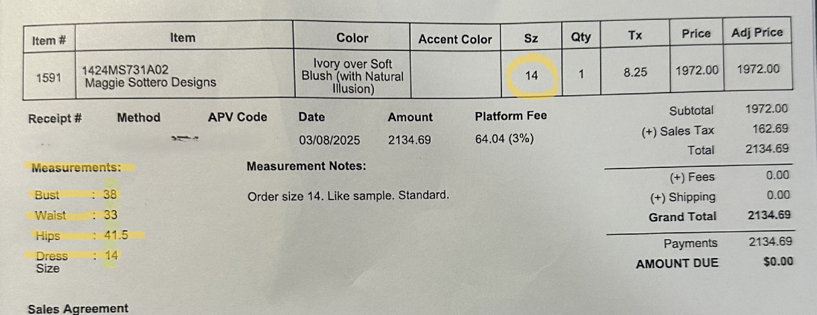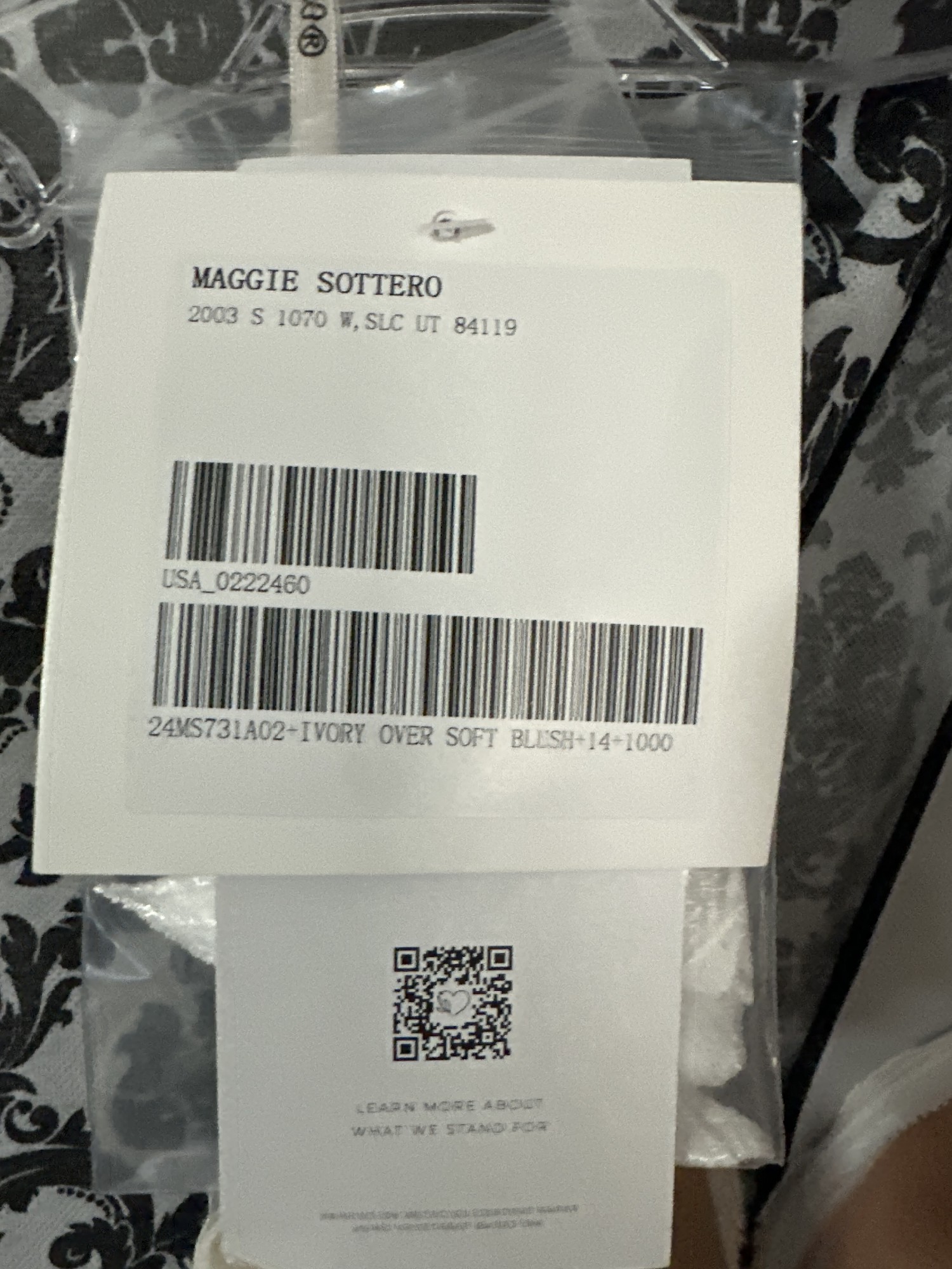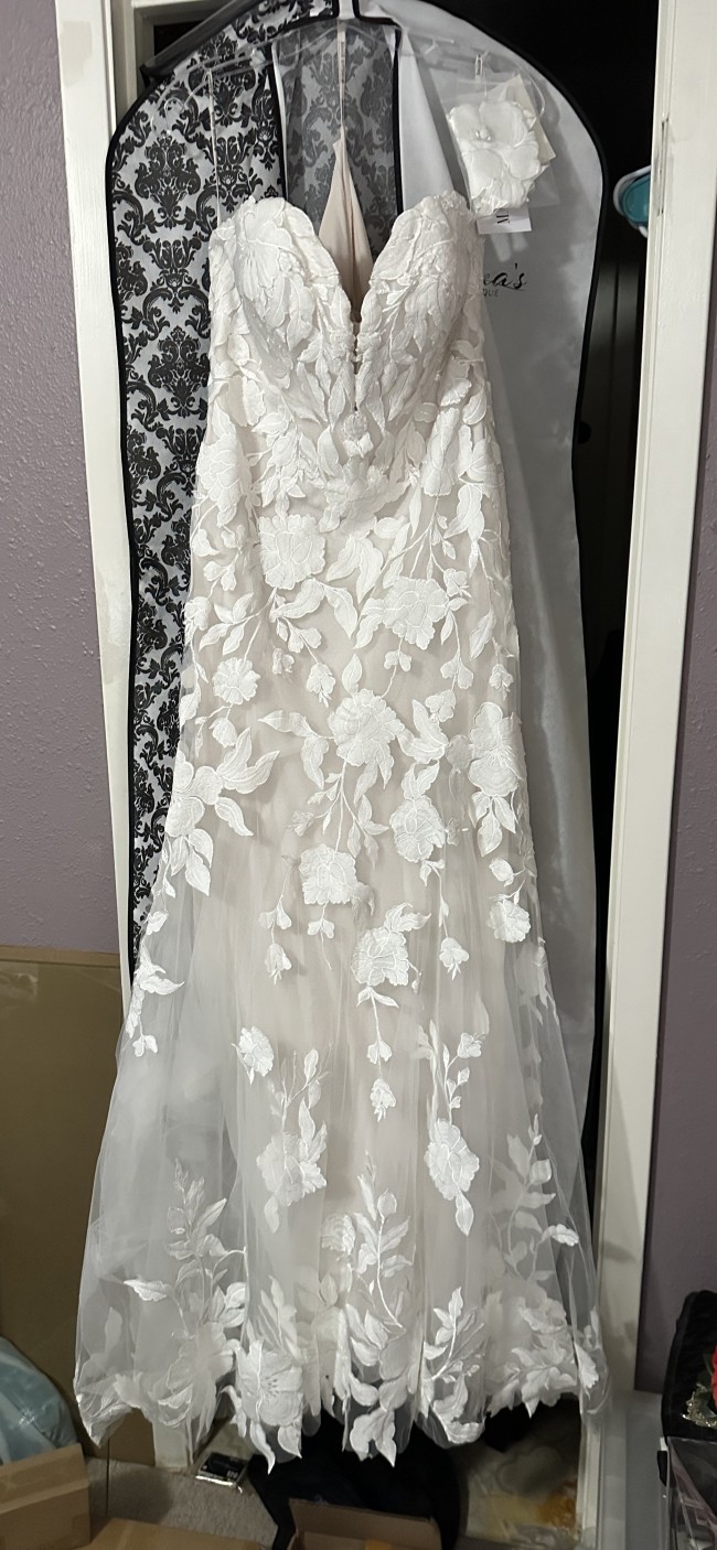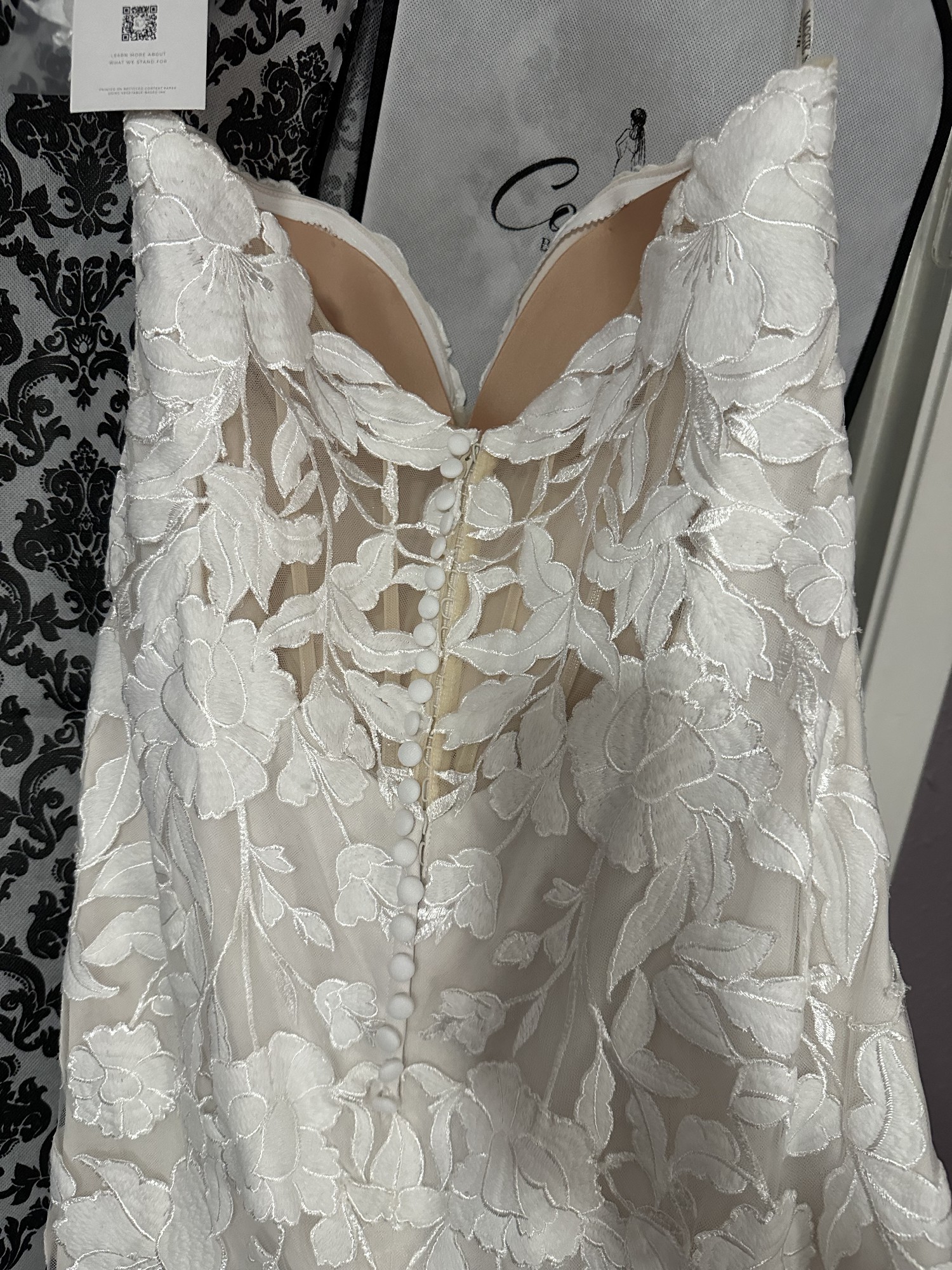 Ordered March 2025 and stored in a proper garment bag since arrival (Oct 2025). Tags still attached. I lost more weight than expected and it can’t be altered down enough — hoping it finds the perfect bride!