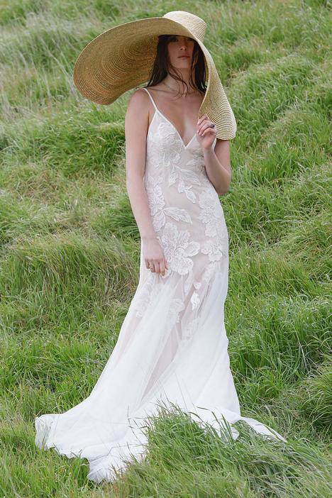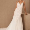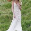 Light nude under light ivory net, large embroidered flowers with no sparkle. Net godets in skirt. No bonining in bodice (comfortable) cups are not super difined so would be great for a small busted bride. Double spag straps into low back.