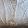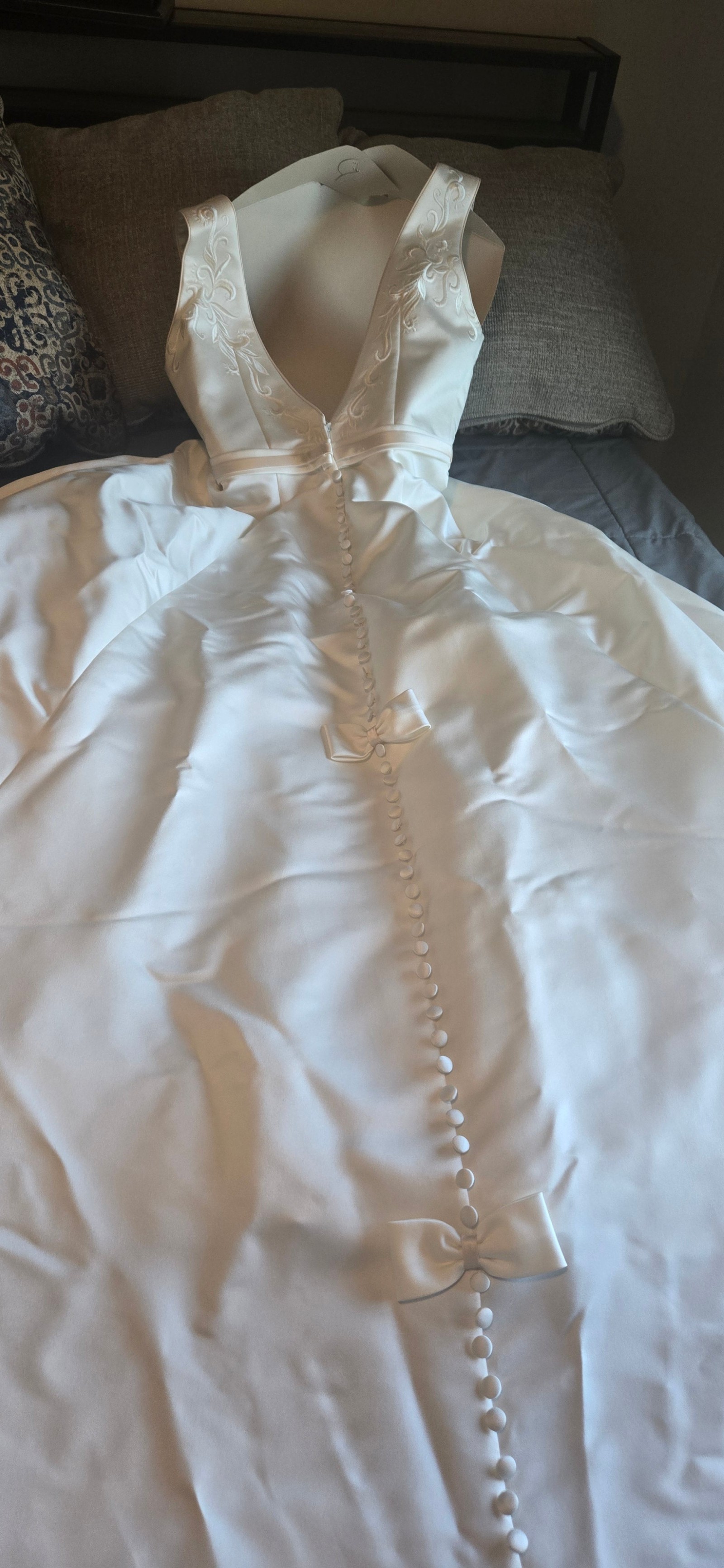 The chapel-length train adds a formal, dramatic touch and includes a bustle for easy movement during the reception. A standout detail is the line of small, delicate bows along the train, adding a soft, romantic feel. The button detailing down the back completes the timeless look.