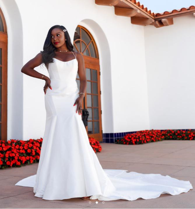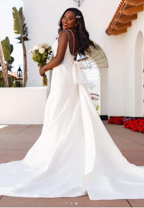 Dramatic elegance comes alive in Style D3404. With head-to-toe matte mikado fabric, this gown uses clean lines and bold accents to deliver a fresh take on a classic silhouette. The scooped neckline is effortlessly stylish and supportive, with boning along the bodice providing sexy structure all day long. The simple double strap adds a delicate touch, meeting at the back of the gown in a delicate V shape. All down the skirt, contour seaming beautifully highlights the body’s natural curves, flaring out below the waist to complete the timeless fit-and-flare silhouette. For a truly show-stopping finish, the detachable bow adds an ultra-modern wow-factor, accentuating the already incredible train and giving the gown a high-fashion flair.