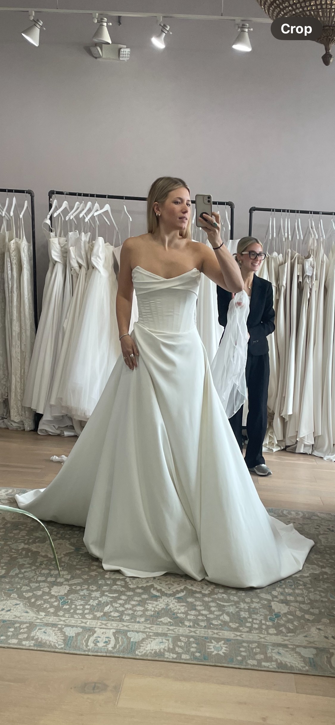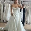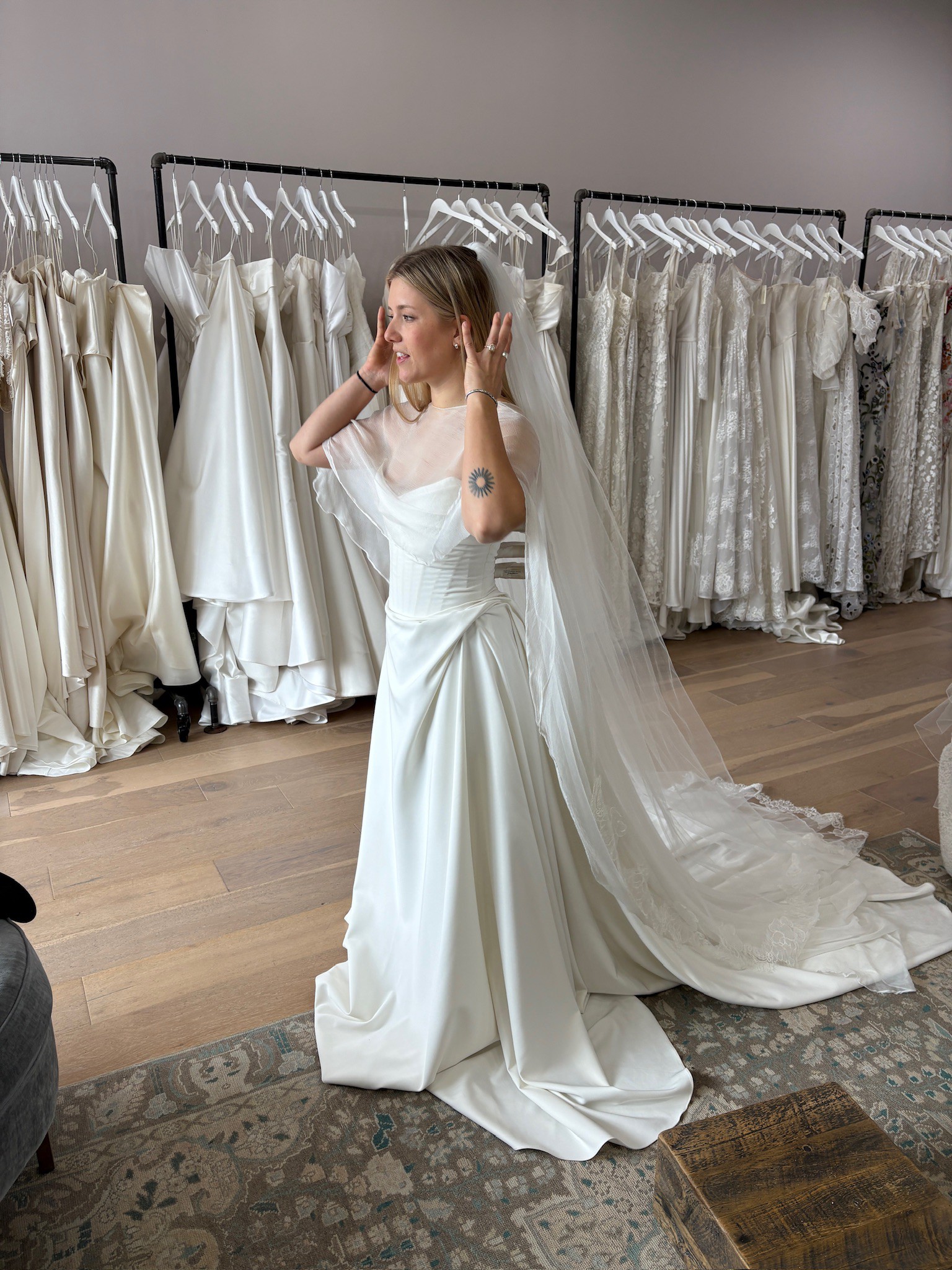 The dress I bought but didn’t wear! I found another dress after I bought this one that was more of the look I was going for. It’s comfortable, crepe material, is so flattering, has the little asymmetrical pick up at the hip, honing in the corset, easy zip up back and beautiful train. I was going to style it with a sheer cape like I had on in this photo. *listing does not come with cape and veil I was going to lose money if I didn’t go through with the purchase, so hear I am selling a perfectly new never worn wedding dress! Unaltered, in Sarah Seven bag, size 6. I tried it on when I got it and the size 6 didn’t fit me snug like it did in these pictures. The pictures have it fitting more like a 4-5.