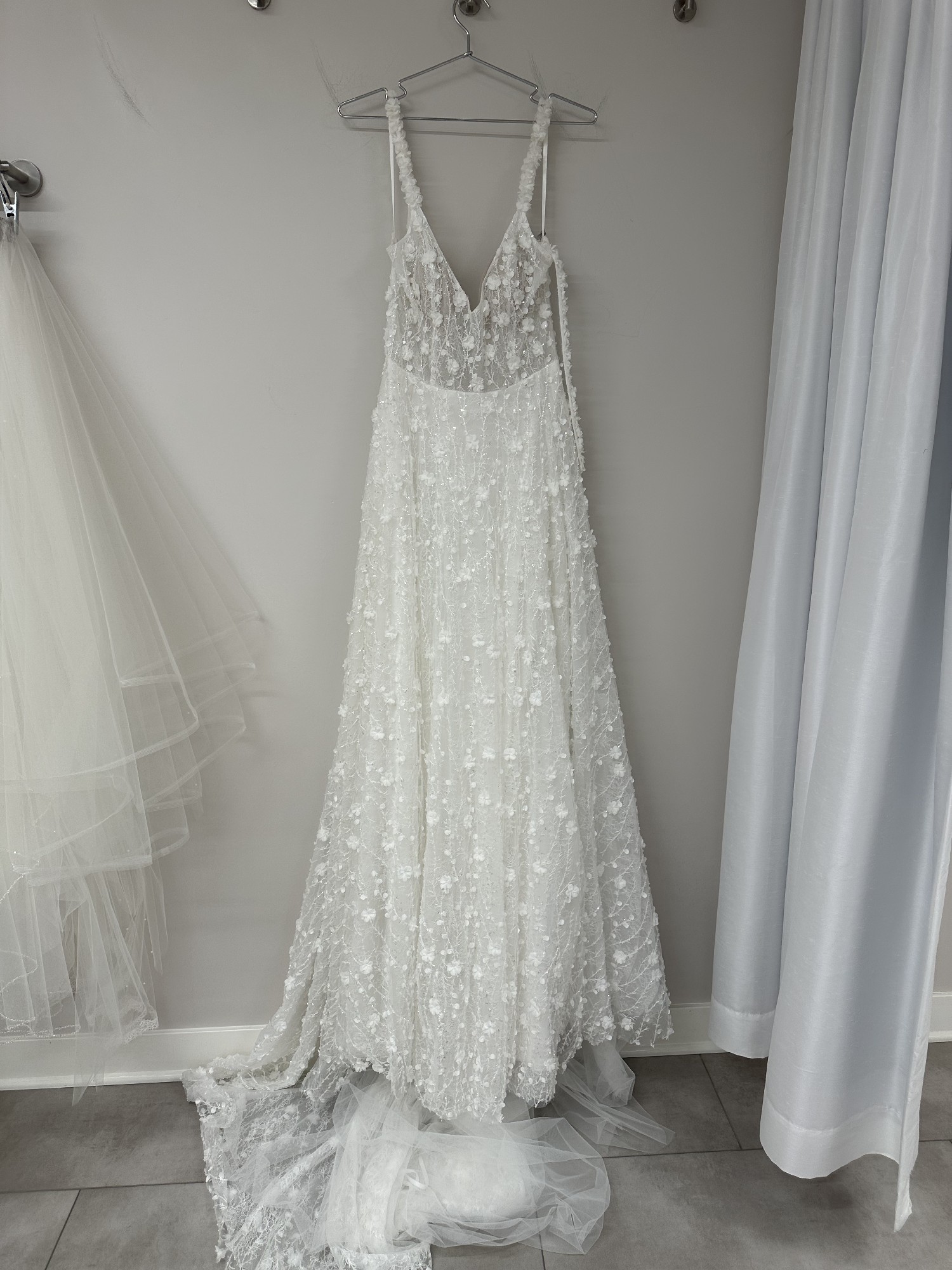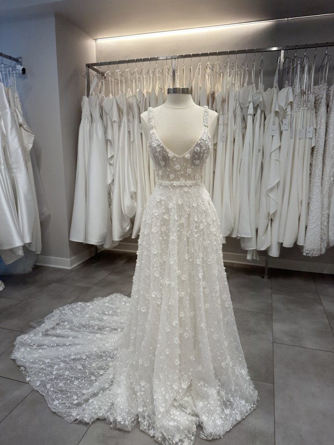 Lenni Flowy is a stunning 3D floral a line gown with a scooped V neck, and gorgeous beading throughout. Dress is in good condition and can be taken in about 3 sizes. FREE SHIPPING IN THE CONTINENTAL USA.