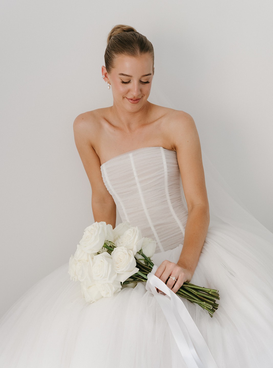 FIT: Dropped waist fitted gown with full tulle skirt. Boned through bodice.