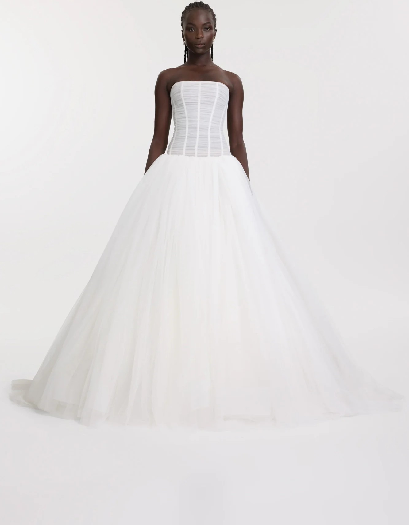 Balletcore energy en pointe via Beau. Its structured, dropped waist bodice is artfully draped with soft tulle, but it’s the full, gathered skirt that delivers the kind of drama that is usually reserved for the stage.