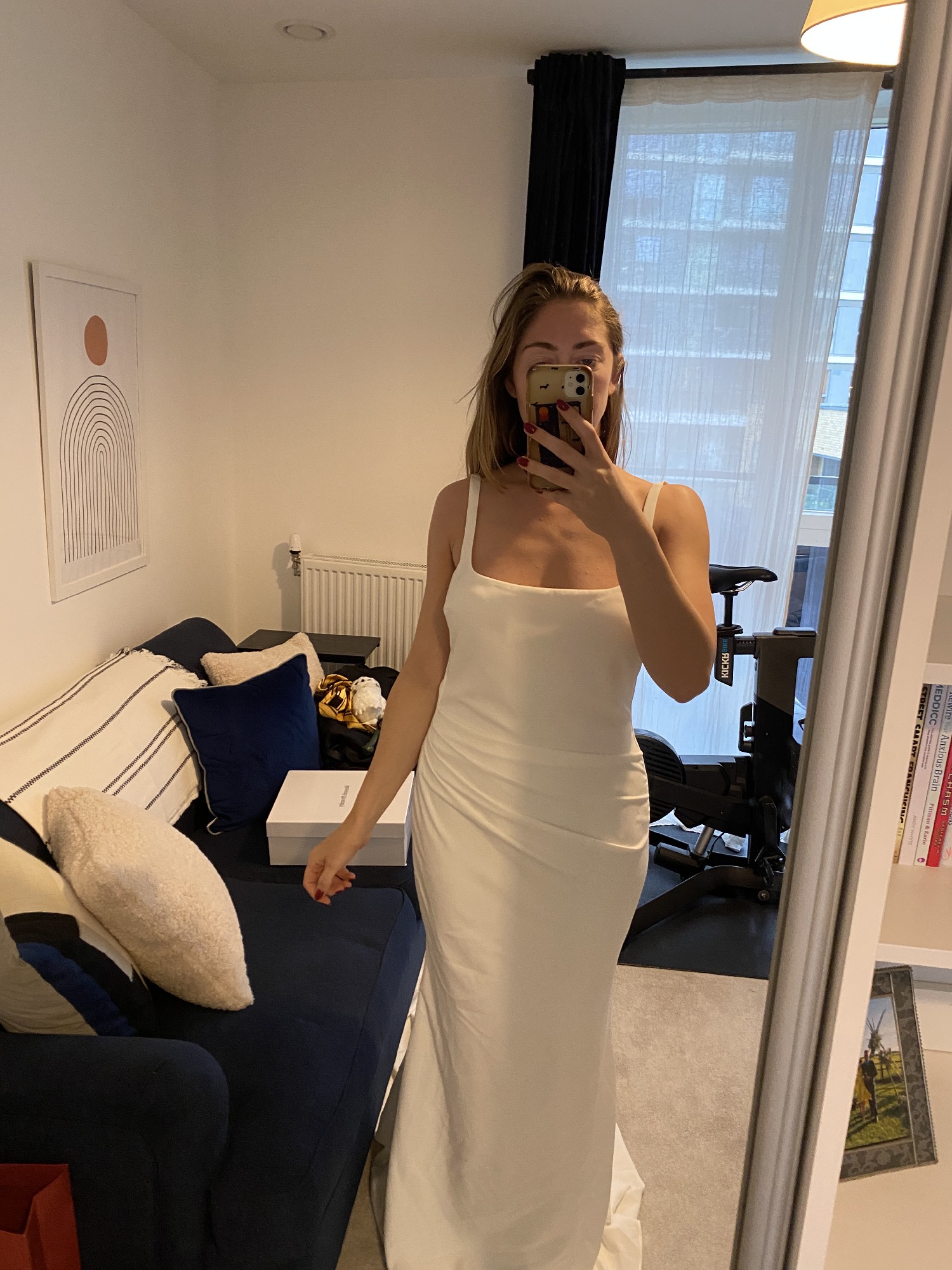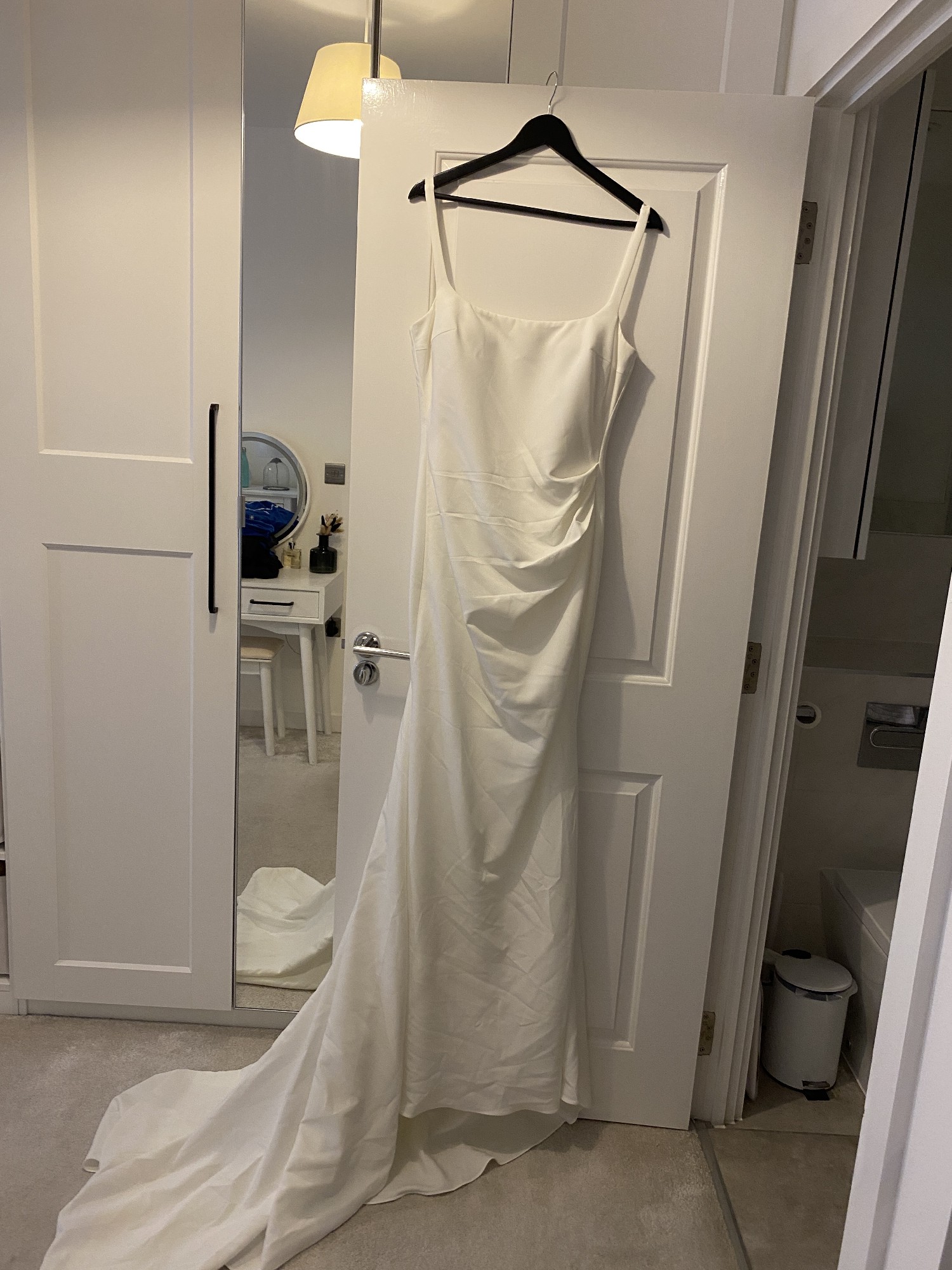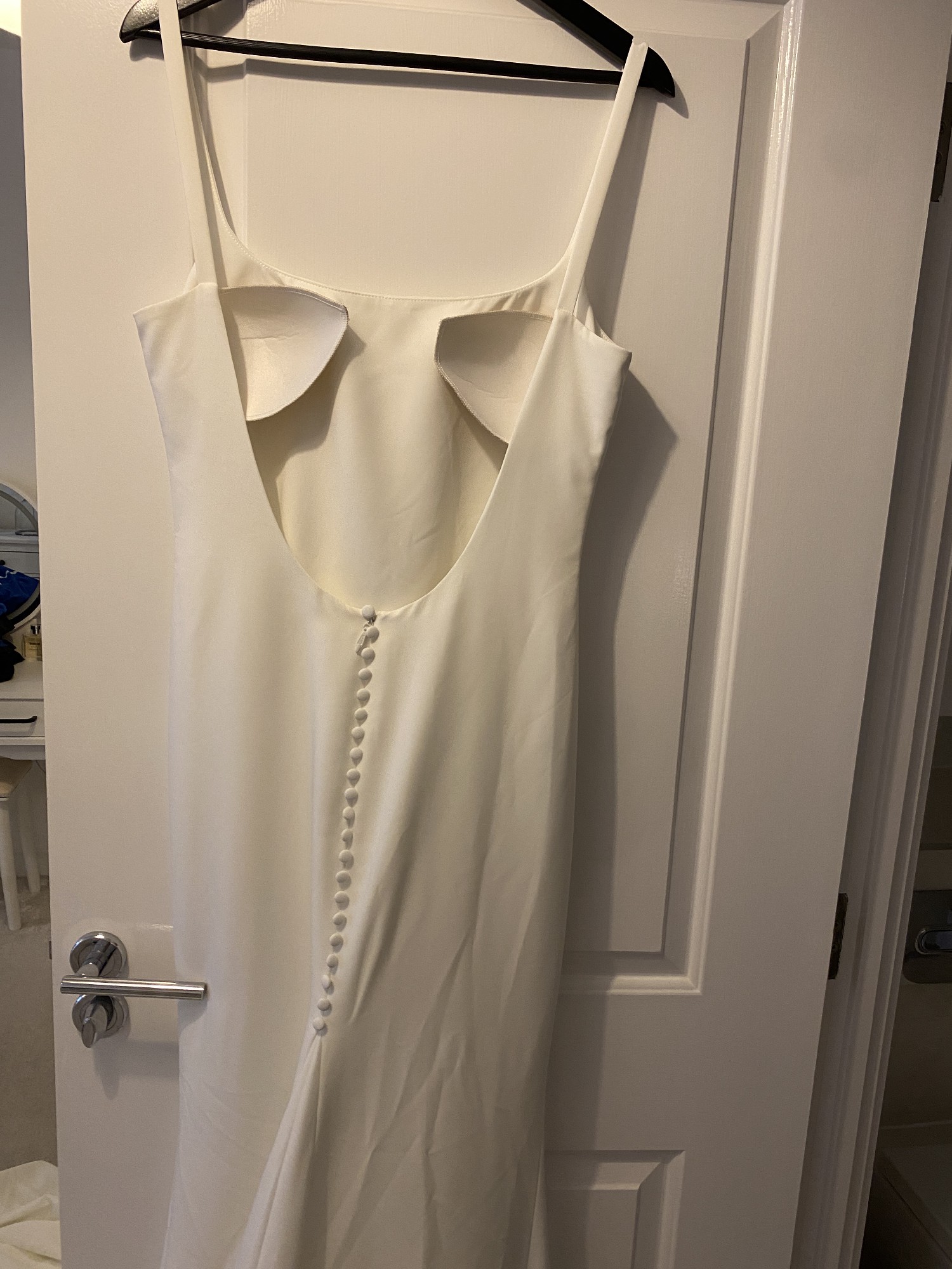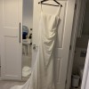Gracie dress by Made With Love. Crepe material with low back, square neckline, sewn in cups, buttons up back, train. New season! Bought from a trunk sale for a discounted price. It is missing the hook from hook & eye fastening, but easily fixable. I am a size 10, but purchased a 14 as I planned on altering it down (I have now purchased a different dress). Although wedding dress sizing is small, so I suggest this is more of a 12.