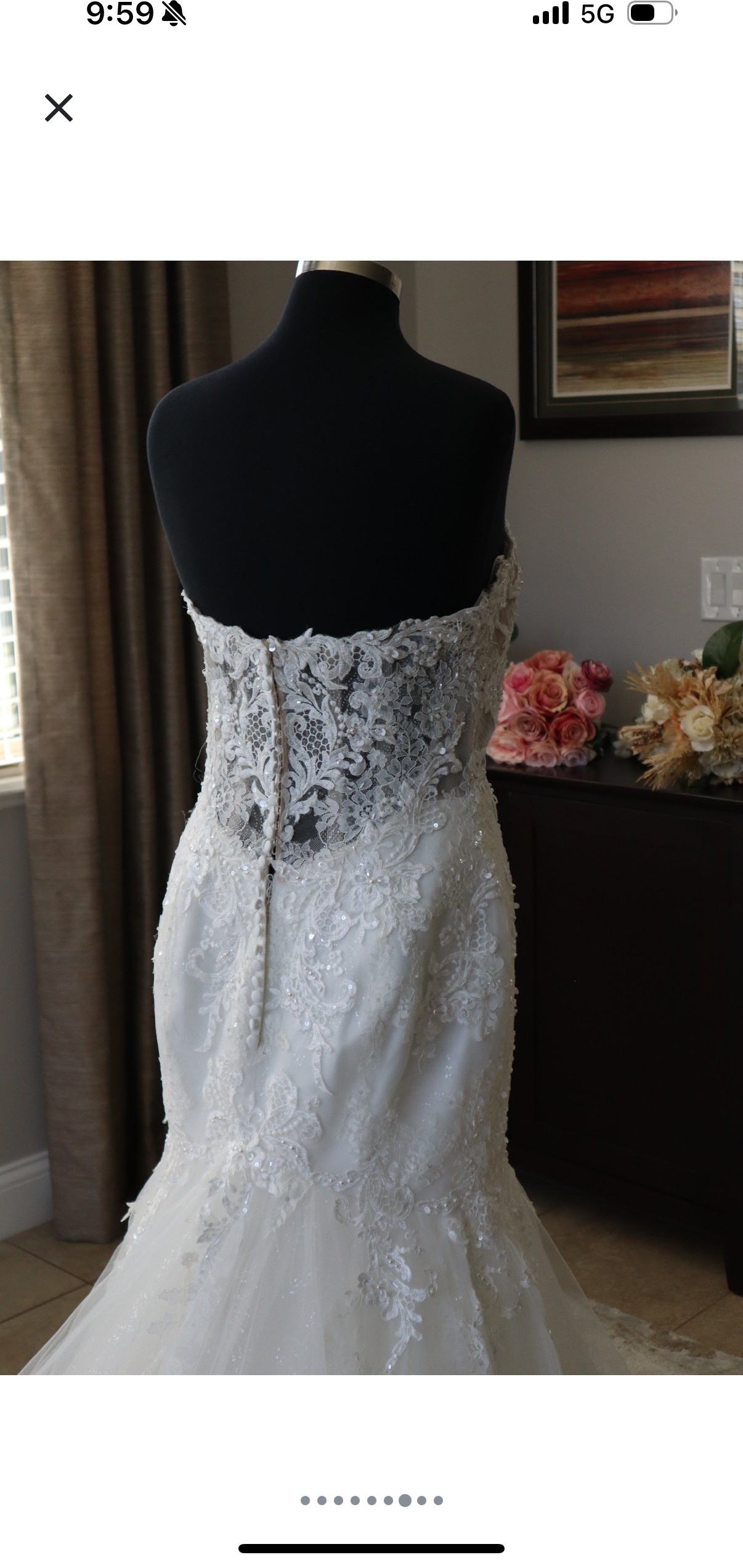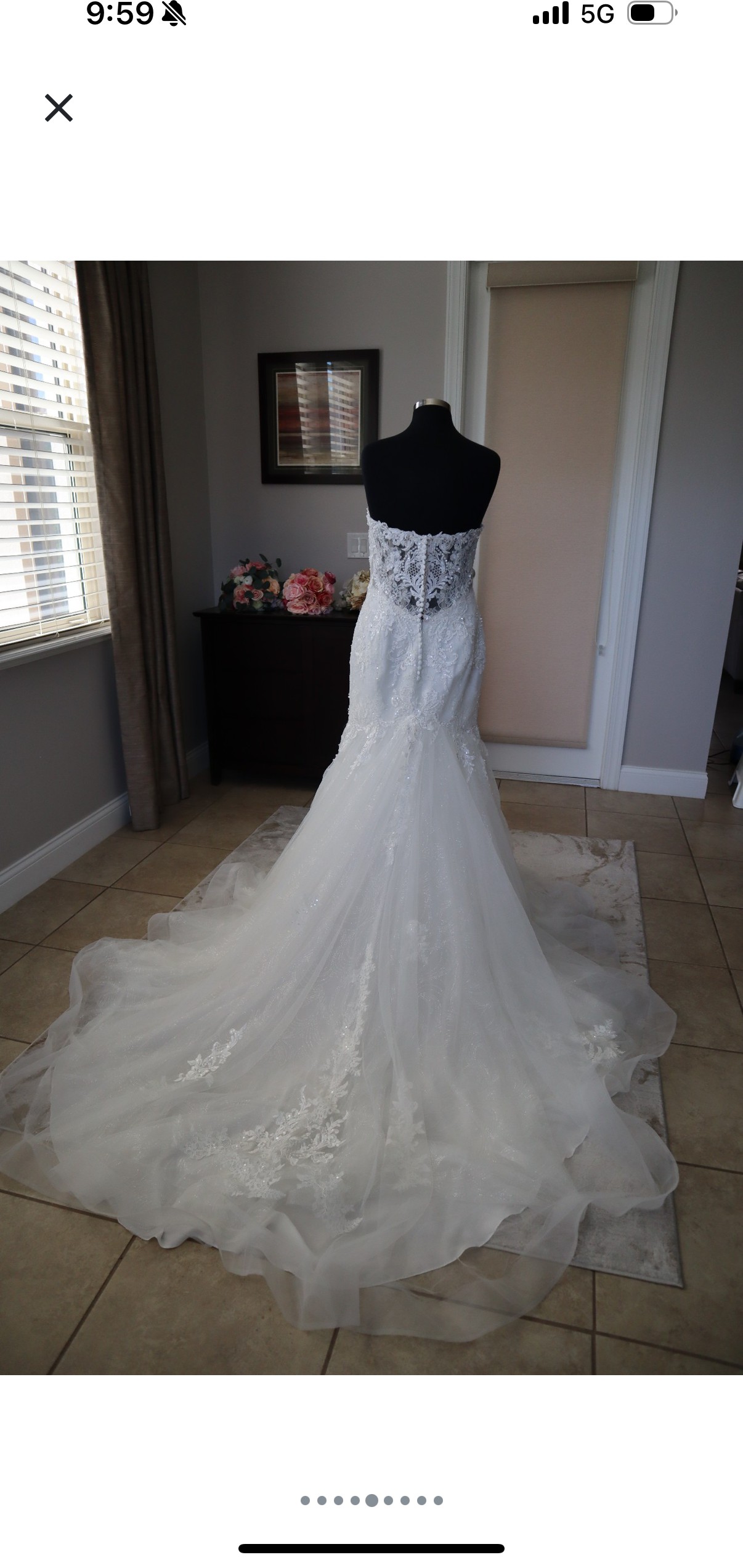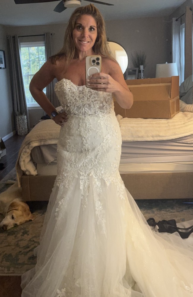 I had bought a few other dresses and I ended up choosing two of my other dresses. This dress is absolutely beautiful and deserves to be shown off. It just truly didn't go with my beach wedding, but absolutely love it and hate the part with it hoping it finds a home with someone. It's truly a stunning dress and complements your curves as well as hold things in that you needed held in. No damage no stains never worn and in altered. Smoke free home