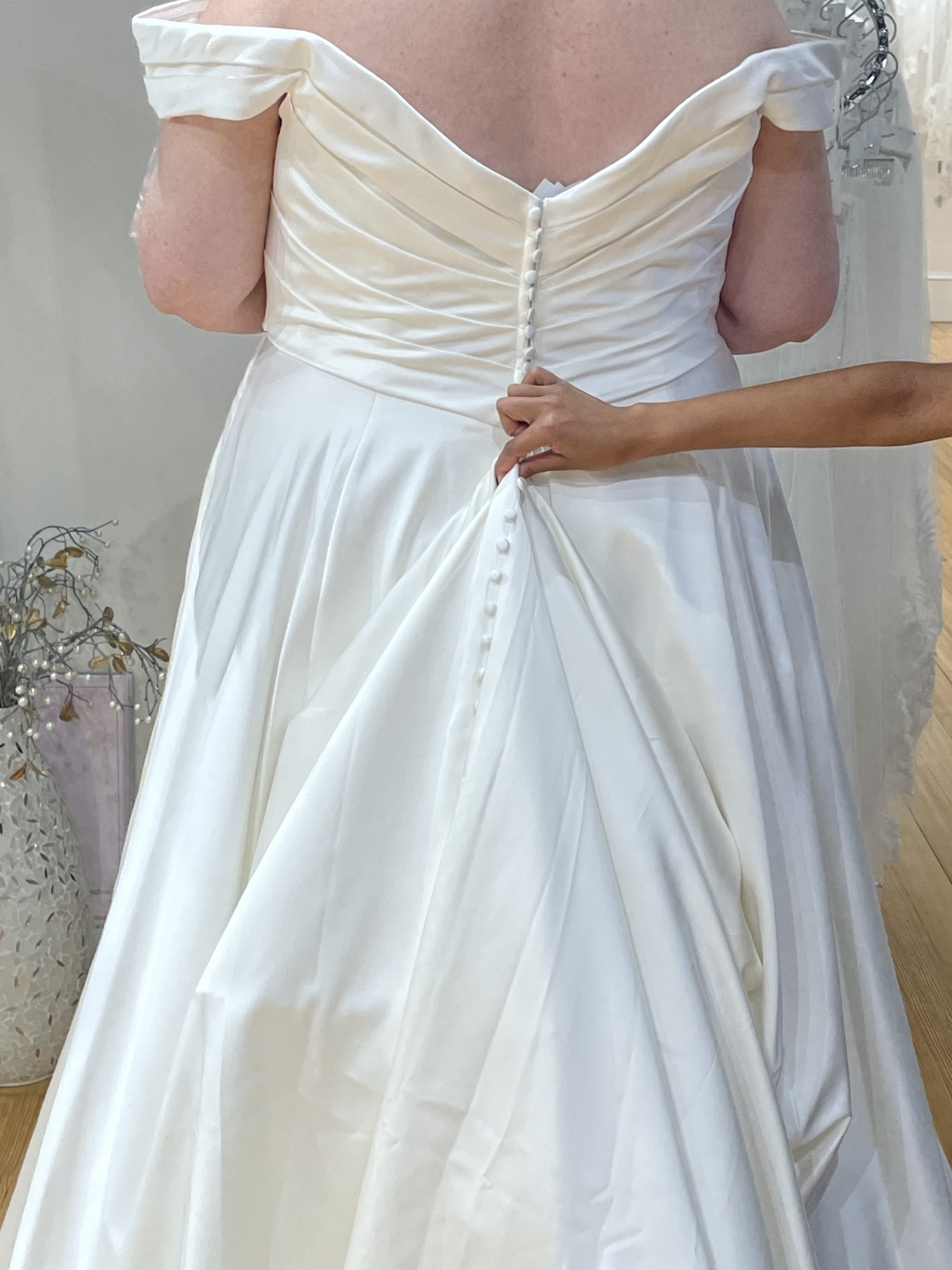 ***BRAND NEW tags still on the dress (pics of tags included)** only tried on 2x’s (bride to be lost too much weight and does not fit) A-line gown with off-the-shoulder straps that elegantly frame the décolletage. Satin, dramatically draped bodice sculpts the upper body before falling to a natural waistline and flowing into a pleated skirt, buttons all the way down the back.