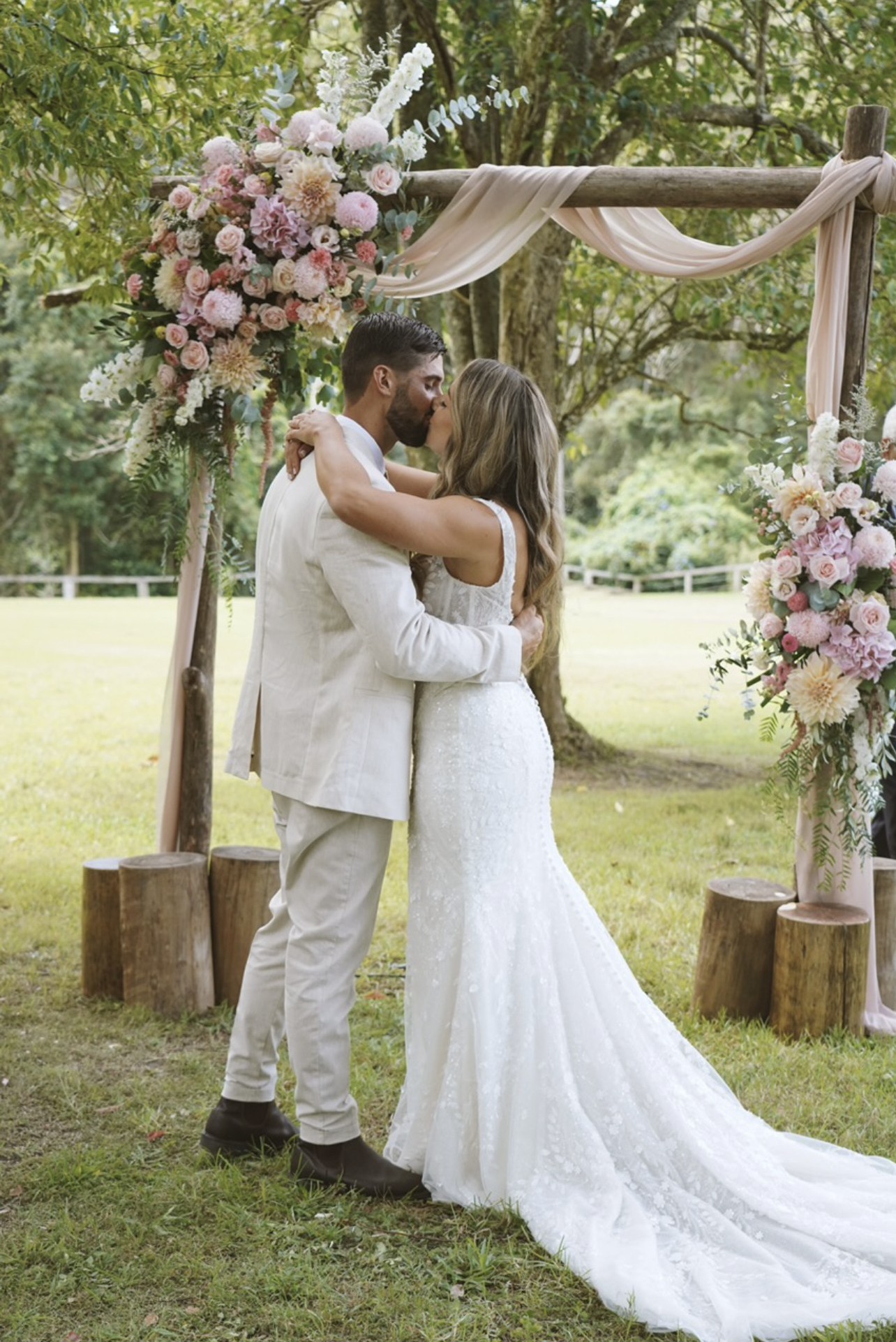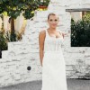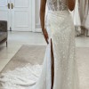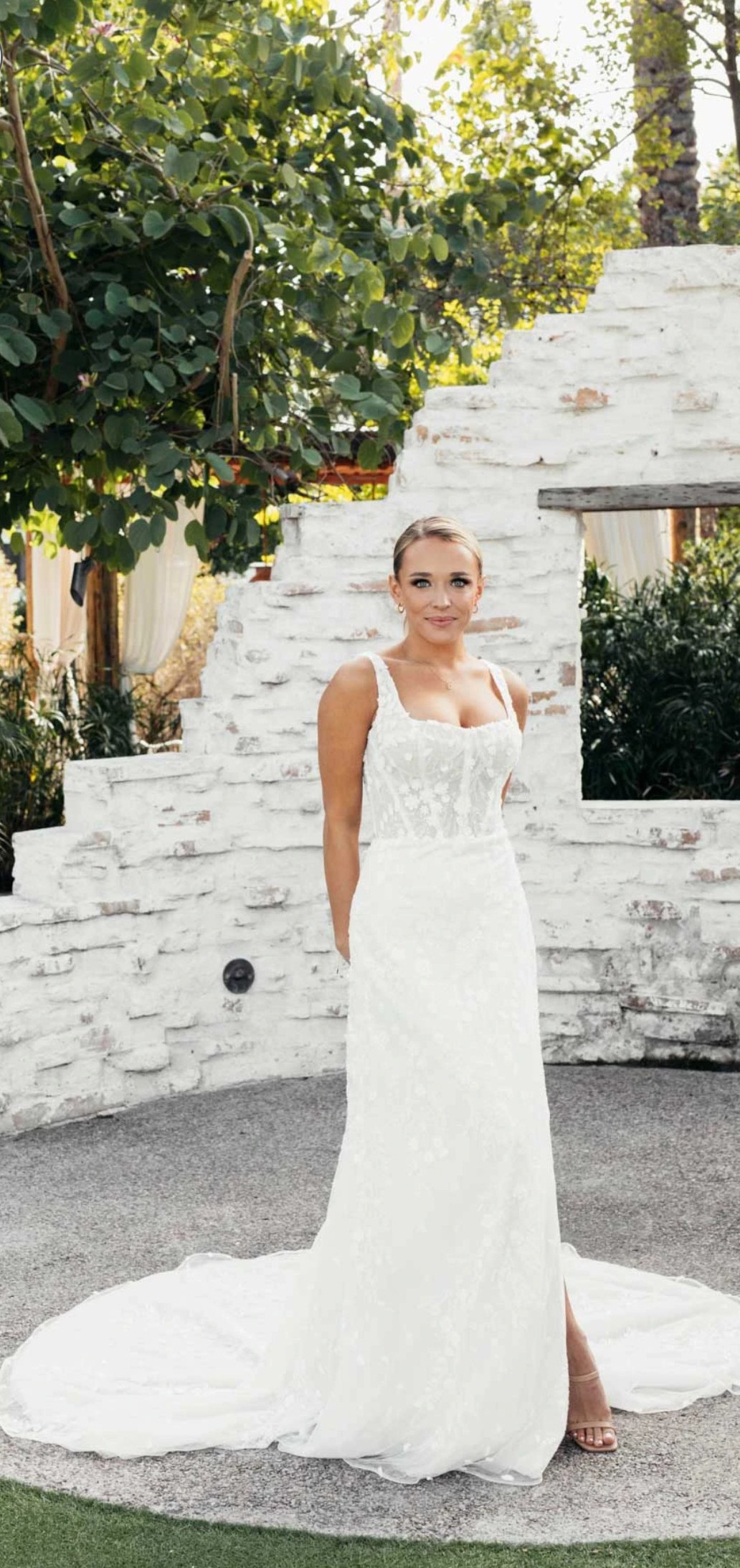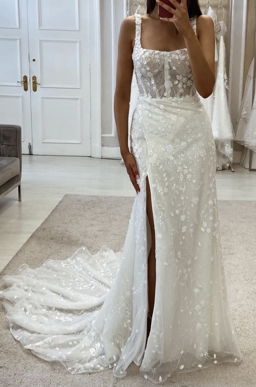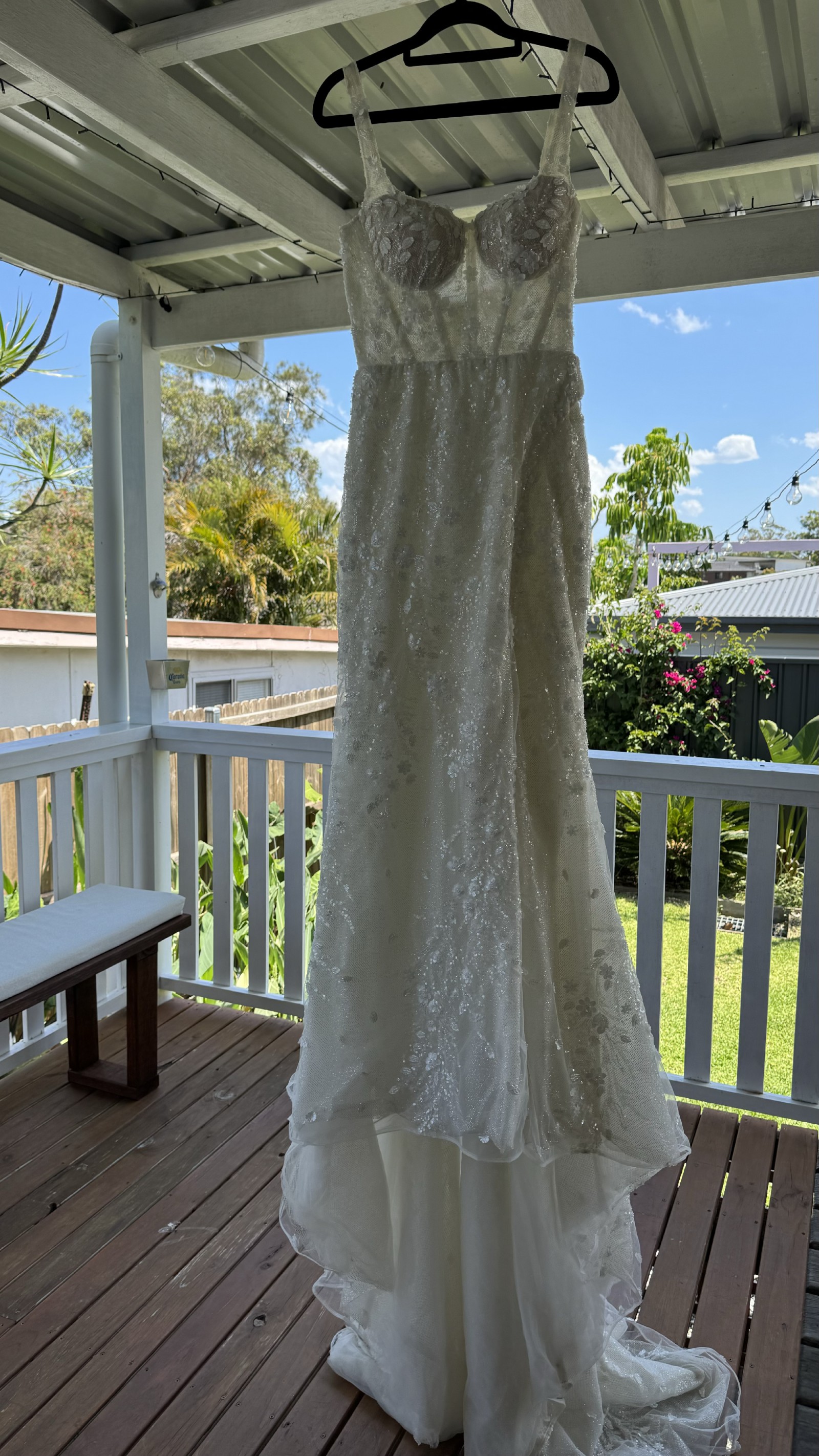 The square neck line is so flattering. The top layer has intricate floral lace and beading over a 2nd glitter layer that makes the whole dress sparkle. It zips up the back with buttons the entire length of the dress that hide the zip. The bodice has skin coloured bra cups and is semi sheer showing exposed boning for a modern look. The train is the best part and can be bustled up for ease of walking and dancing (see dancing pic.) I wish I could keep it but it will make me so happy to see another bride look incredible in this dress.