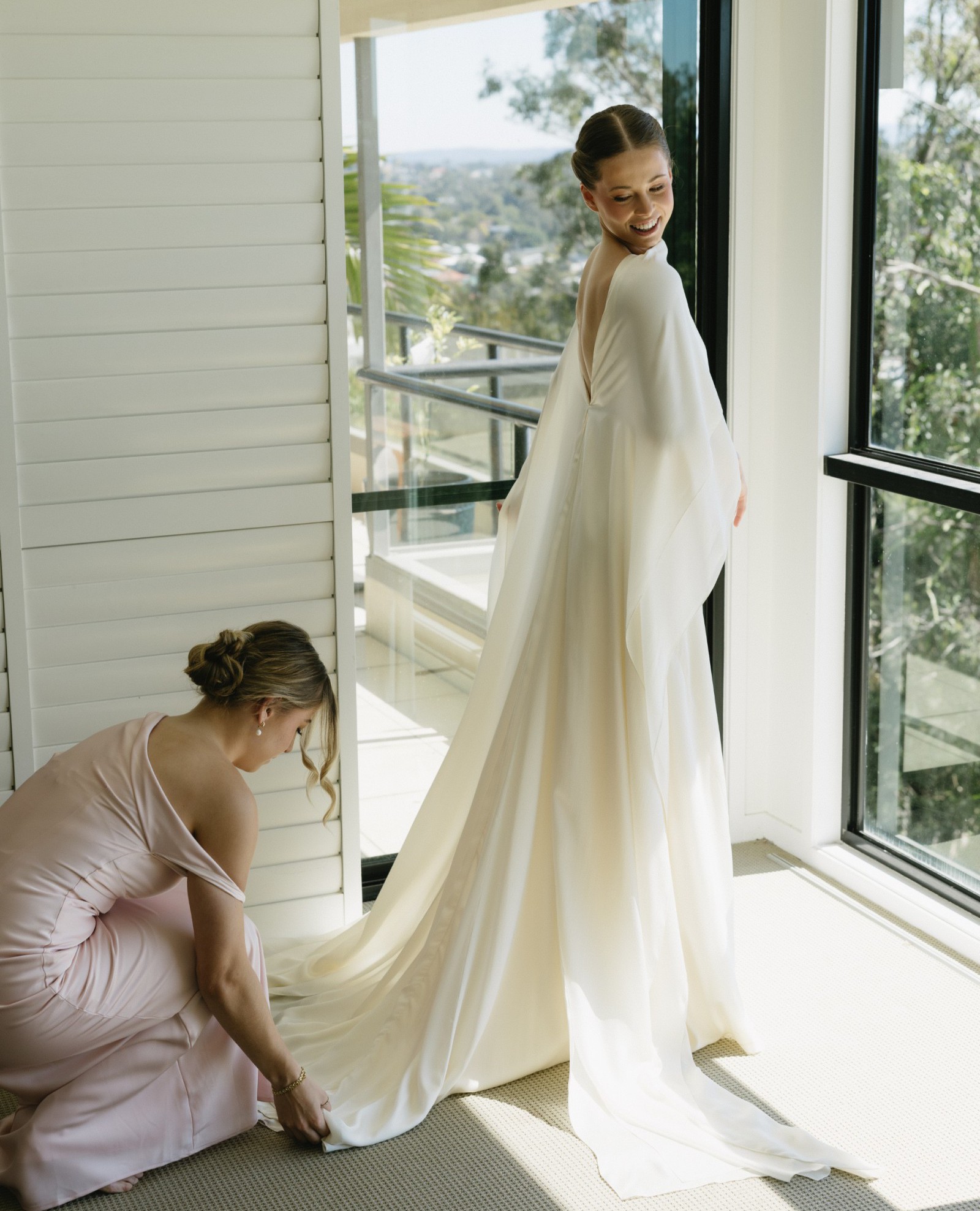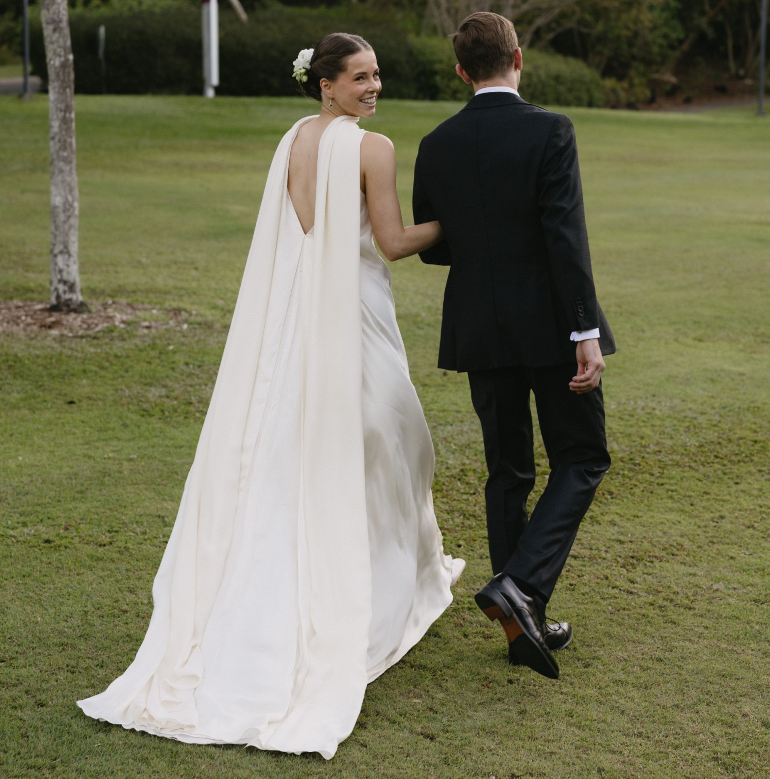 It was mesmerising - the little girls and boys just wanted to touch it! It is the most comfortable dress I have ever worn. Seamless in the right places, flowing and cool to the touch, as it is light Italian silk georgette in three separate layers - it creates movement in photography. The halter neckline can be adjusted to a boat neckline. I wore it multiple ways on the day. The V-back detail ensures that I did not look too mature as a young bride, while allowing me to wear a one-piece underwear bra. Perfect.