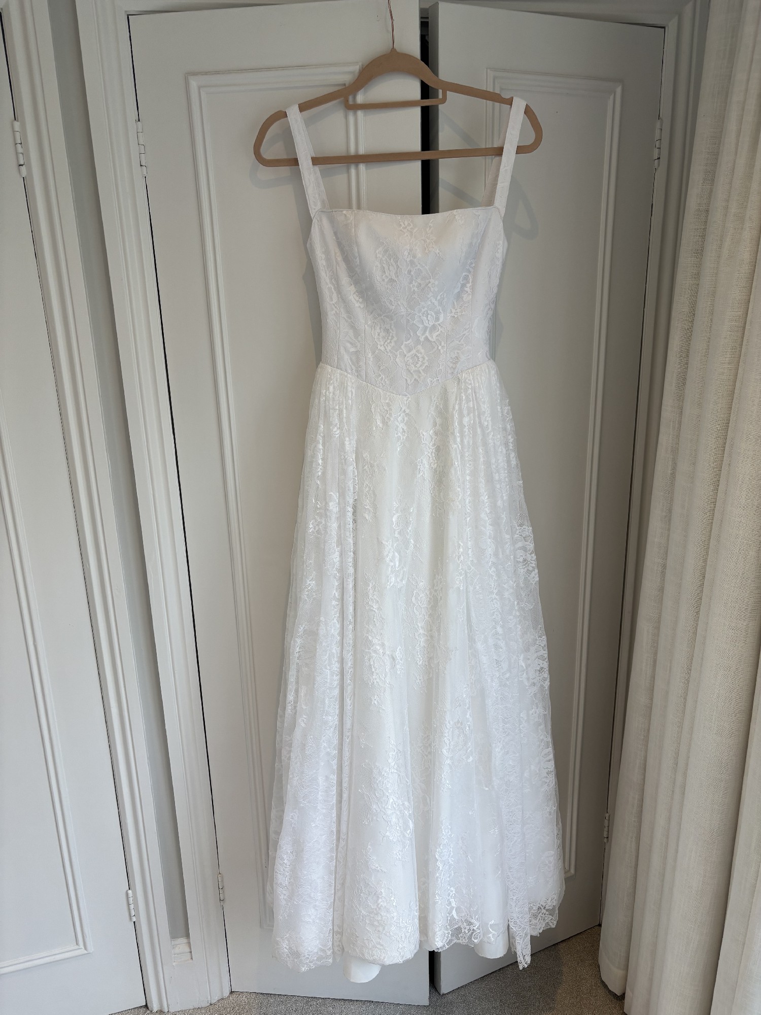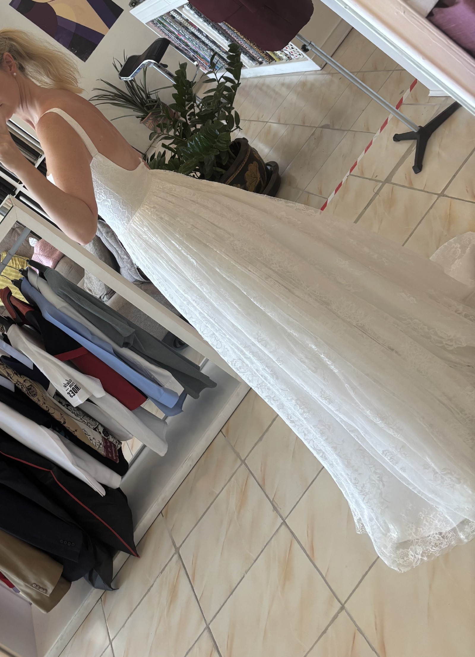 PLEASE NOTE I decided on the day the dress was too long and cut this with scissors. I am 176cm with shoes and it still touched the ground however has not been cut professionally. It was not noticeable due to the volume of fabric. I have tried to capture this in the video. It would be perfect for someone slightly shorter if they wanted to hem it properly however no one noticed a thing on the day!