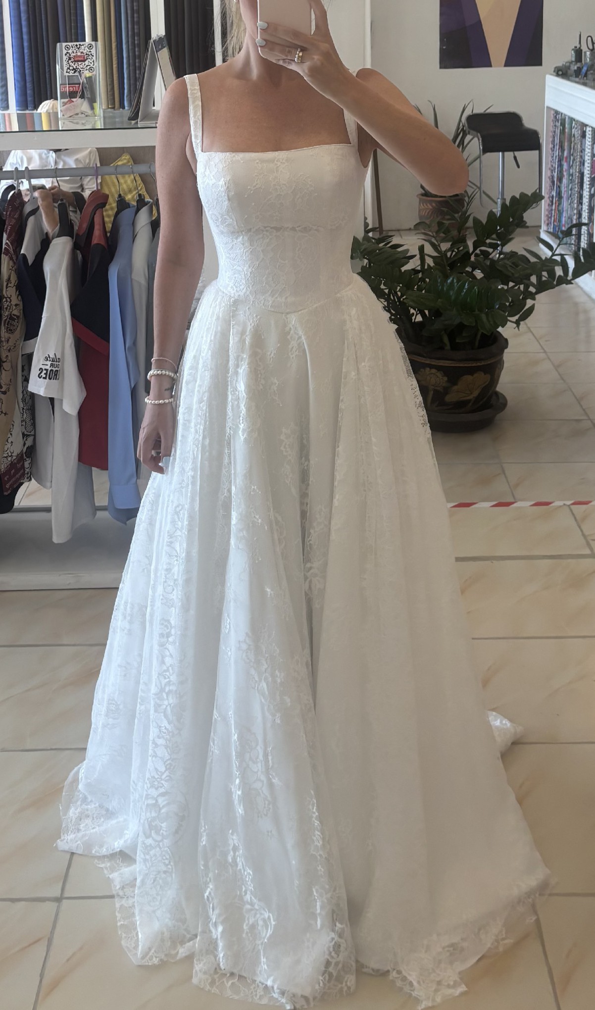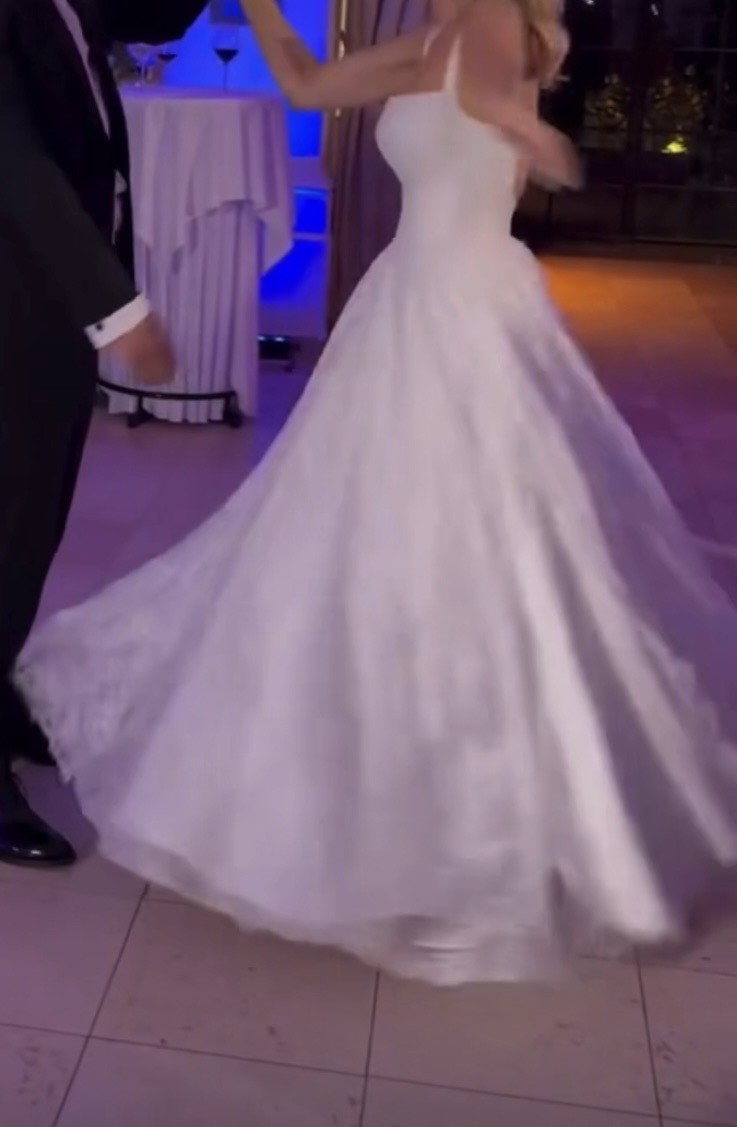 There is some very very faint marks at the very bottom of the lace but only pointing out as not brand new condition. For anyone shorter this section could easily be taken up. Please see video for full inspection of condition of the dress. Stunning while and bright and I felt like a princess in it.
