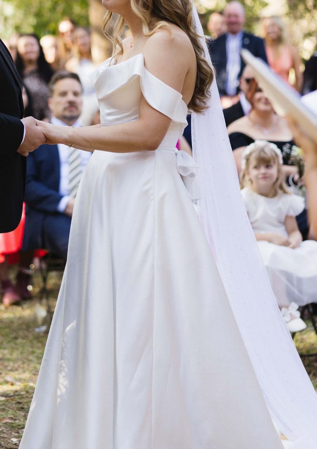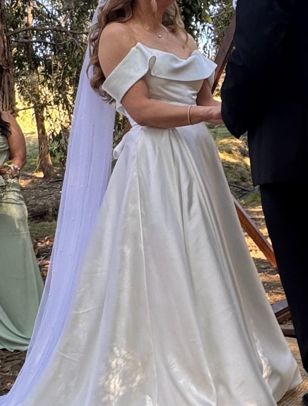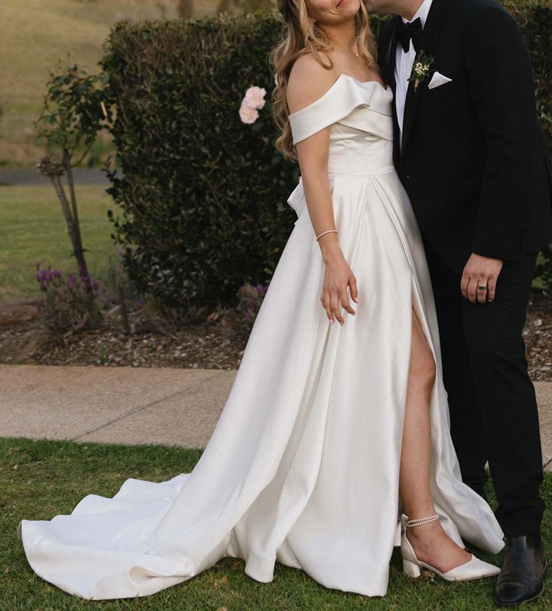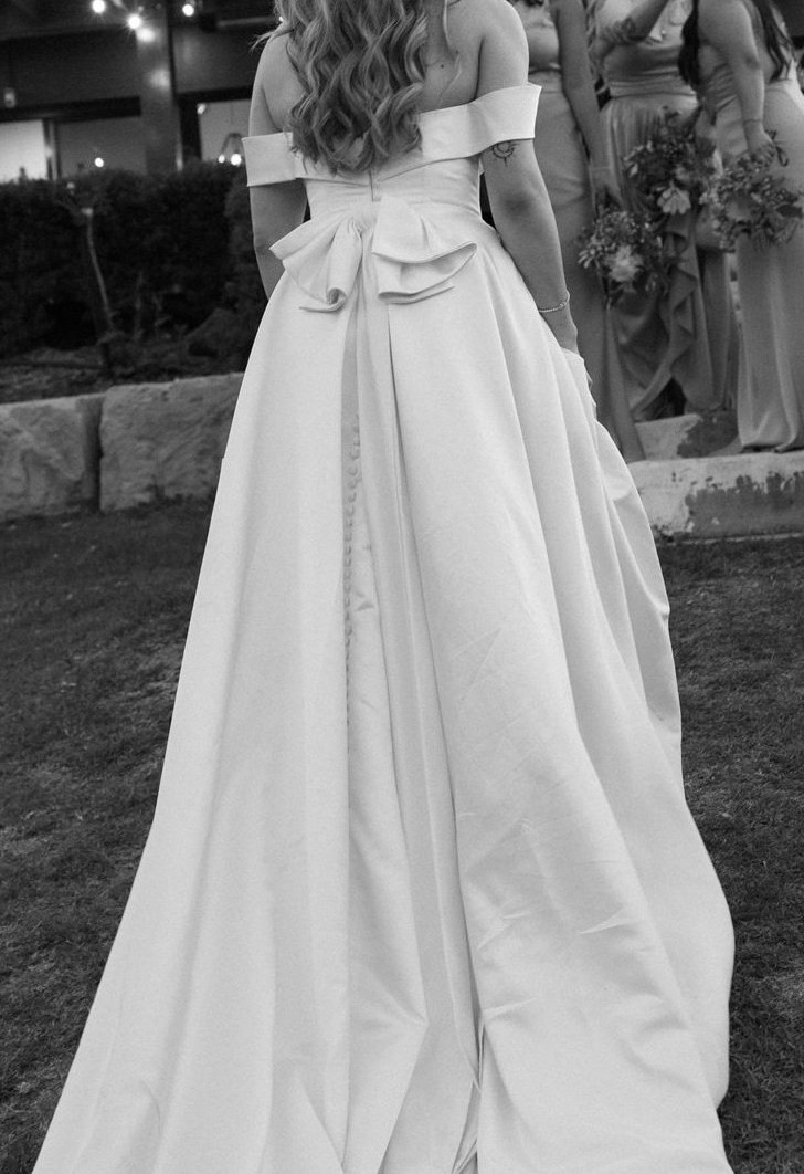 This stunning When Freddie Met Lilly dress has been the centerpiece of my dreams and my special day. Crafted in mikado silk for comfort and elegance, it features a flattering A-line silhouette that swirls beautifully as you move, creating an ethereal effect. The off-the-shoulder neckline adds a touch of romance, perfectly framing the shoulders, while the low back offers a daring glimpse that’s both classy and captivating. It has an invisible zip up back and beautiful silk button detail all the way down the train at the back. The bust is boned and padded for extra support. It is fully lined and no chance of see through skirt here! But still manages to not be very heavy.