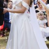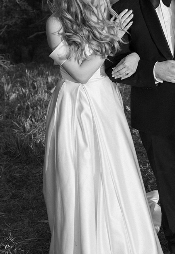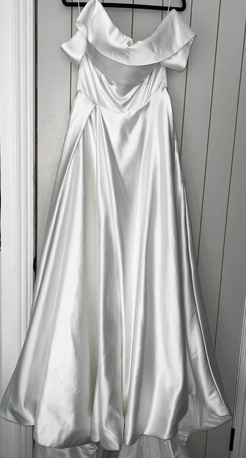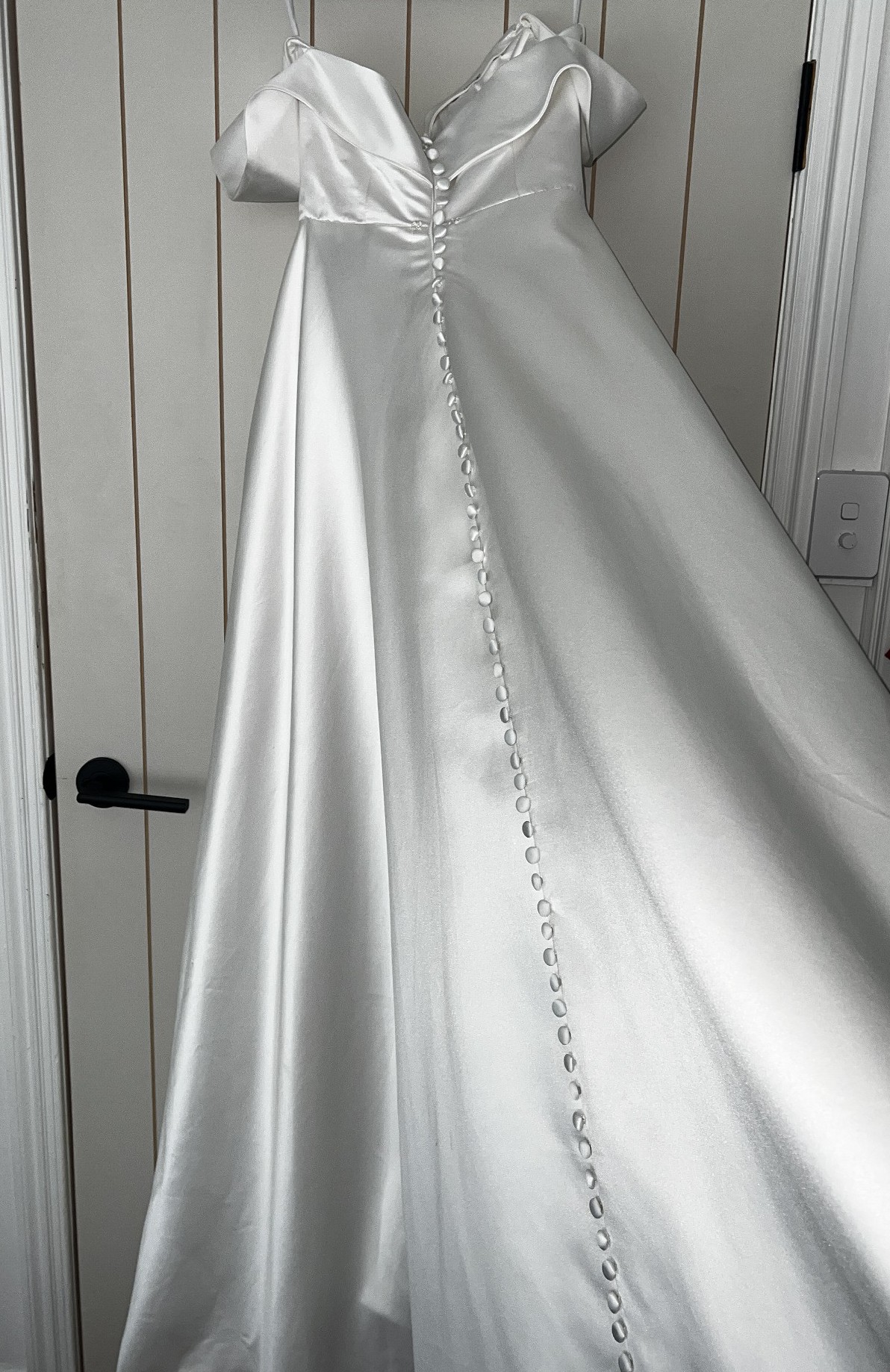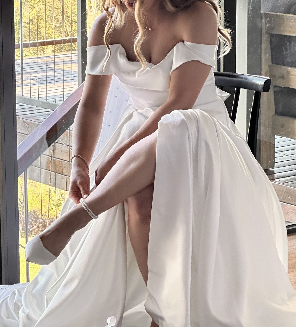 This stunning When Freddie Met Lilly dress has been the centerpiece of my dreams and my special day. Crafted in mikado silk for comfort and elegance, it features a flattering A-line silhouette that swirls beautifully as you move, creating an ethereal effect. The off-the-shoulder neckline adds a touch of romance, perfectly framing the shoulders, while the low back offers a daring glimpse that’s both classy and captivating. It has an invisible zip up back and beautiful silk button detail all the way down the train at the back. The bust is boned and padded for extra support. It is fully lined and no chance of see through skirt here! But still manages to not be very heavy.