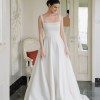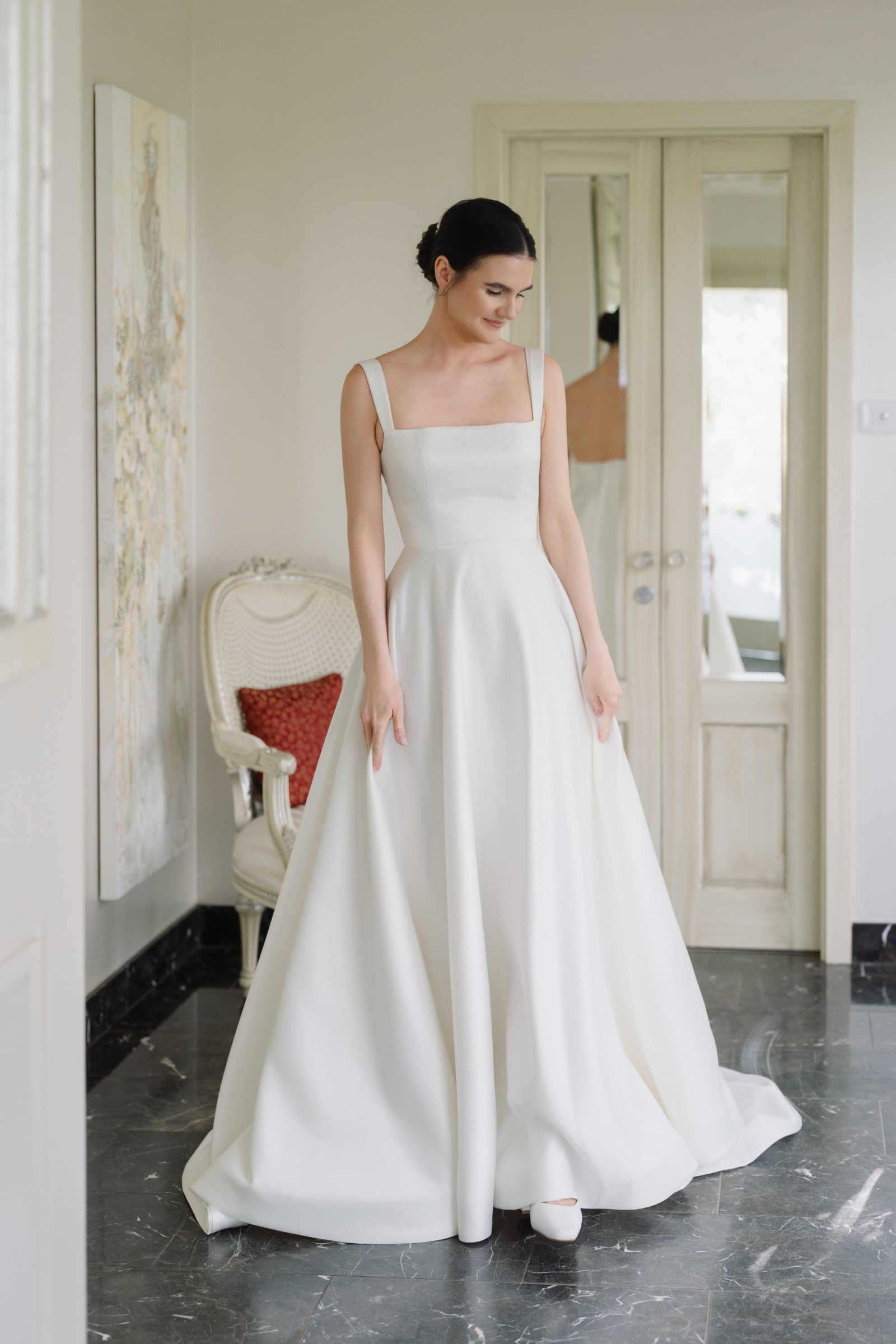 The dress is made from Duchess Satin and has a flattering square neckline, structured bodice, centre back zip, buttons and loops running from the bodice to the waist point, full skirt, and a low, square, open back with buttons.