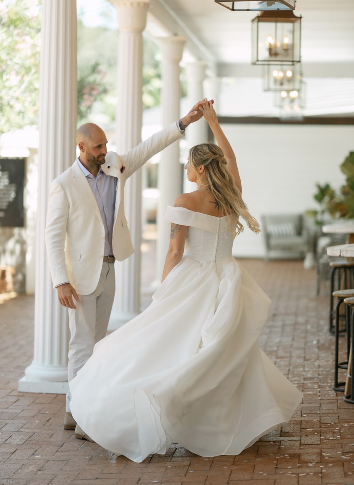 - added a bustle to lift and secure the train to the back of the dress (with buttons) so you can move more easily after the ceremony/photos — especially for the reception or dancing.