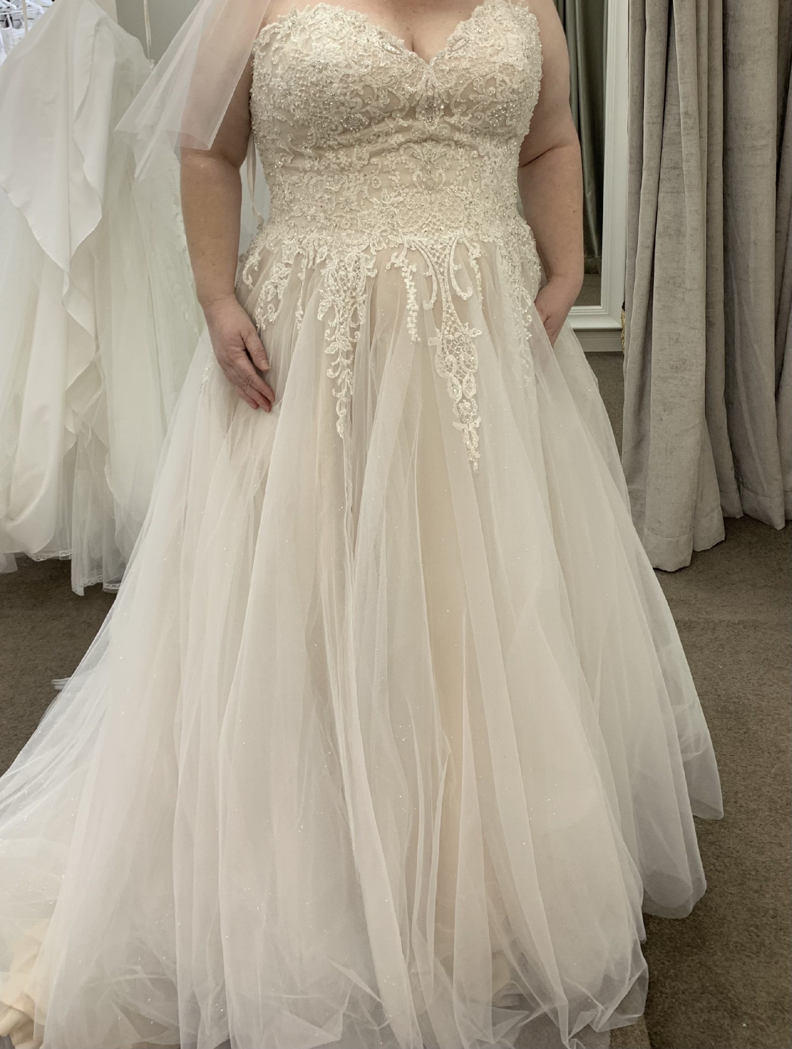 Crafted from high-quality materials, this floor-length gown drapes beautifully, flowing effortlessly as you move. The size 22 fit guarantees ample room for alterations to make it uniquely yours.