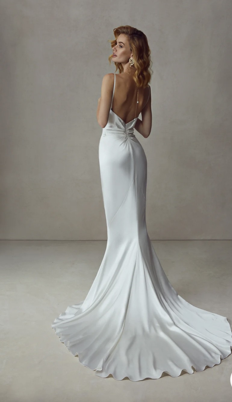 This stunning Jane dress by Katherine Tash is the epitome of elegance and sophistication. As I walked down the aisle in this trumpet silhouette, I felt like a true vision, and I want to share that experience with another bride seeking her dream gown. The exquisite curve neckline beautifully accentuates the collarbones while maintaining an air of timeless grace. The low back adds just the right amount of allure, making it a perfect combination of classic beauty and modern romance.