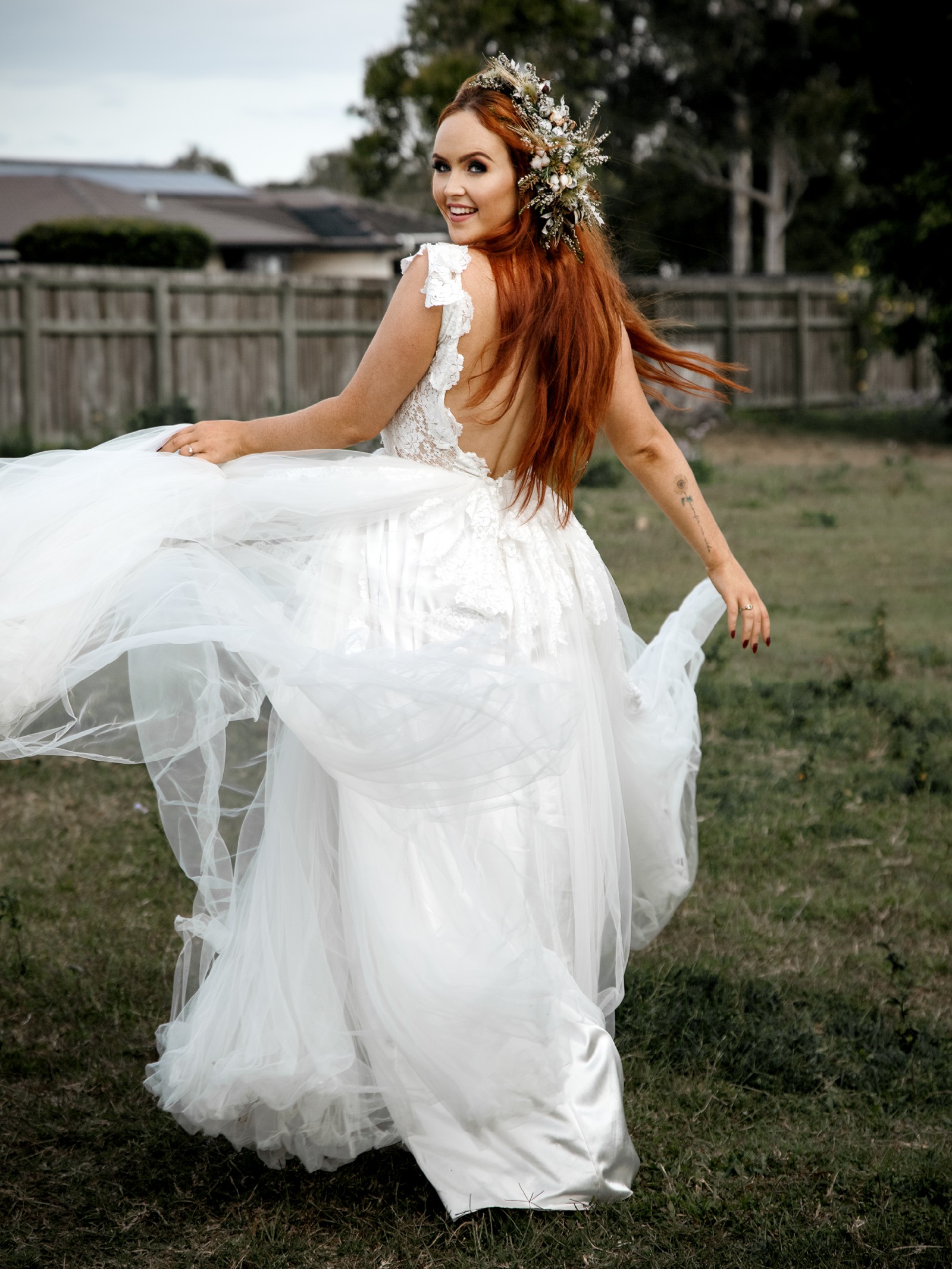 Description: A delicate lace bodice with a V neckline, low V back & full tulle skirt. The highlight of our Nikita Gown is the hand cut lace pieces that flow from the bodice down into the full tulle skirt adding a whimsical softness that is an undeniably stunning addition to the gown, particularly throughout movement.