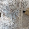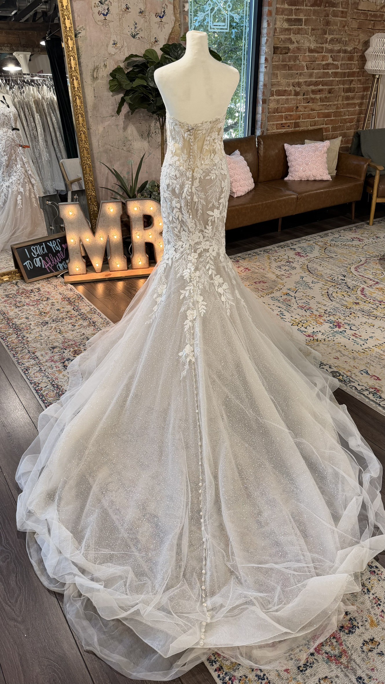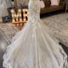 This dress features a gorgeous strapless sweetheart neckline bodice, beautifully adorned with lace and floral appliques that lightly scallop the neckline then cascade down the bodice. The back appliques are contrasted as it sits on clear meshing and boning. Buttons trail from the back all the way to the bottom of the structured horse hair hem. The unique heavily shimmery skirt flares from the knee creating a flattering silhouette line.