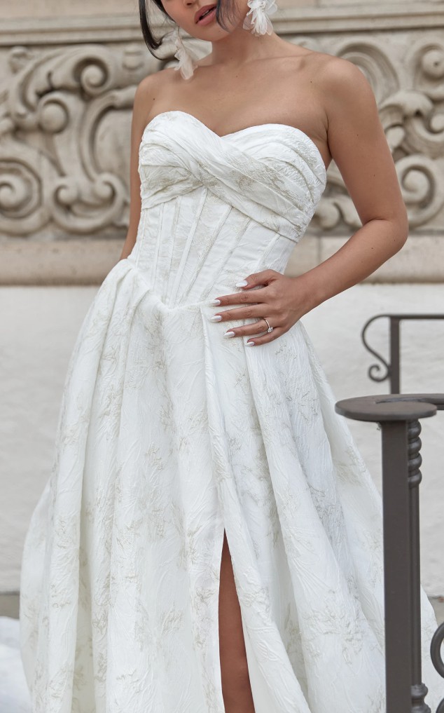Crafted in a soft ivory/gold hue, the dress transitions effortlessly from an intimate ceremony to a grand celebration. The exquisite embroidery adds a touch of artistry, intertwining sophistication with a hint of whimsical charm. Completing the look, the corset back provides not only a secure fit but also an alluring detail that accentuates the waist.