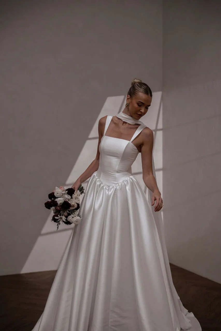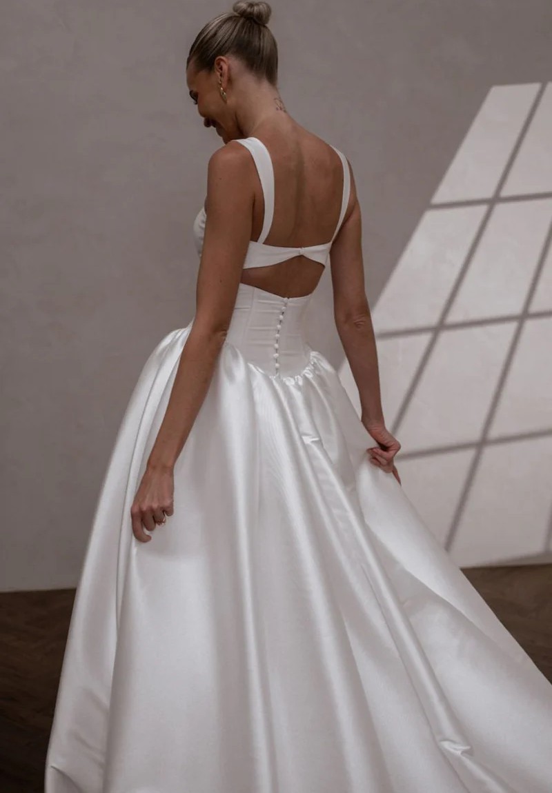 The square neckline beautifully frames the collarbone and highlights your décolletage, while the delicate straps offer subtle support. At the back, the enchanting keyhole detail brings an element of surprise, allowing for a touch of allure without sacrificing grace. The rich ivory hue enhances the overall ethereal quality of the dress, making it a flawless choice for any wedding theme.