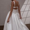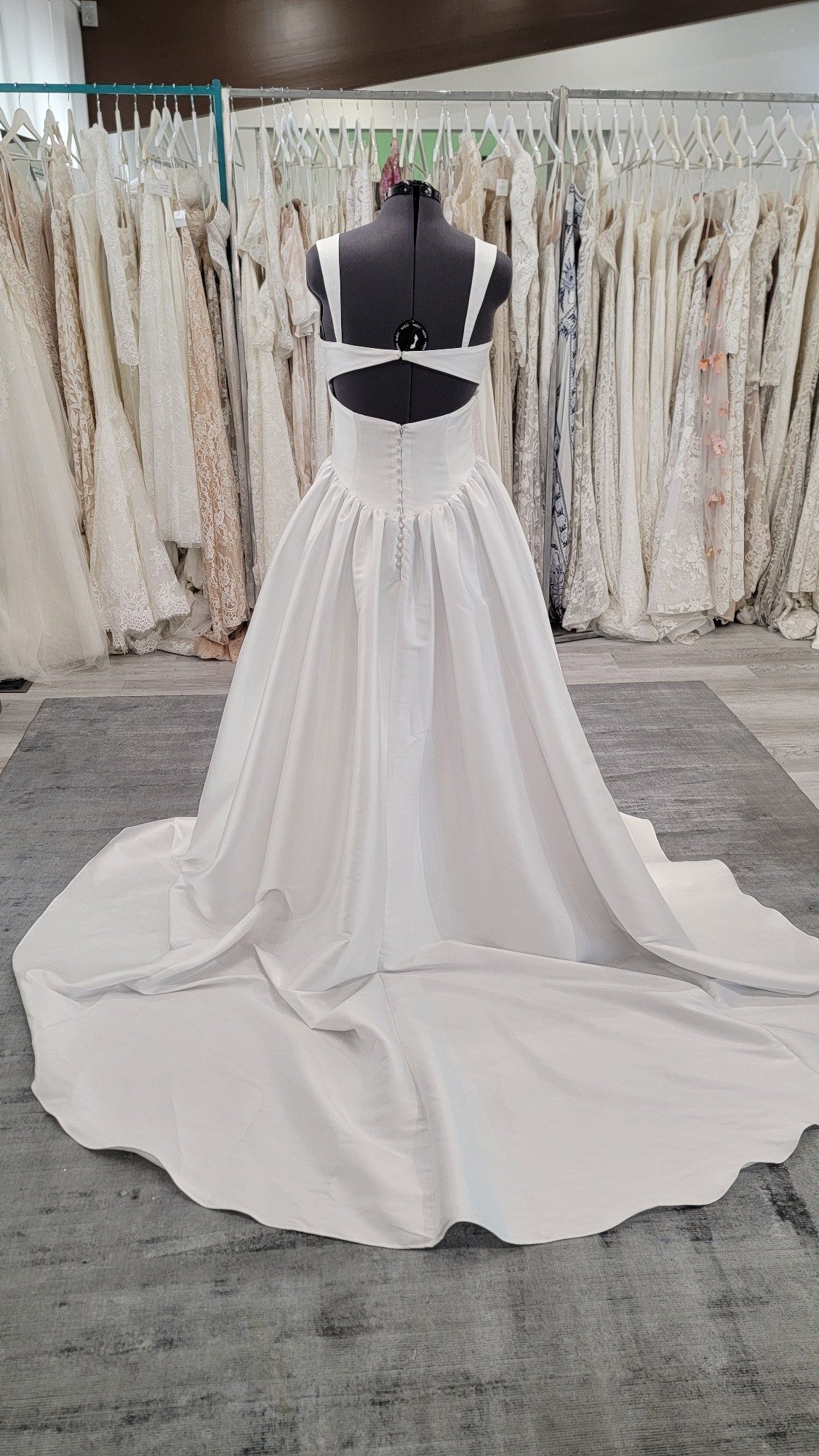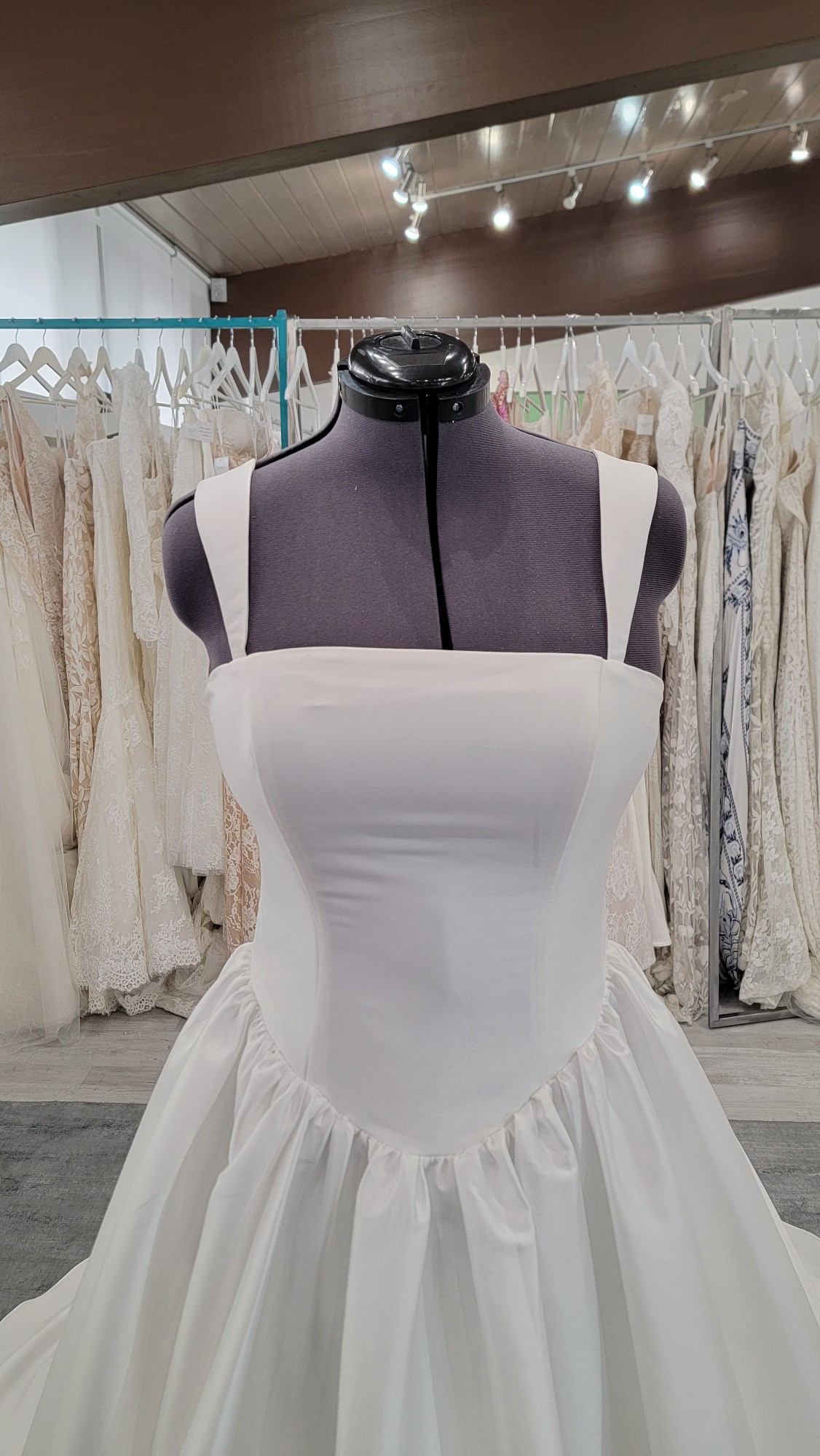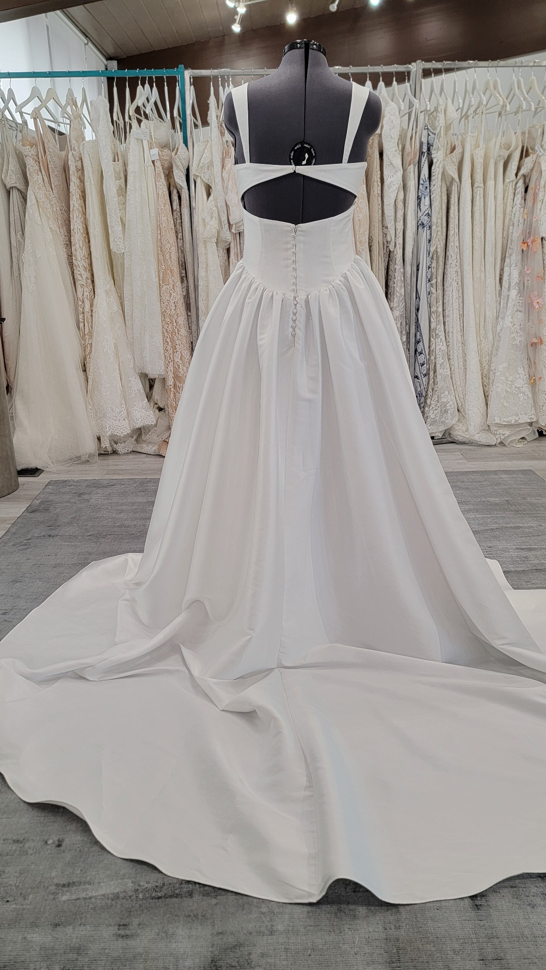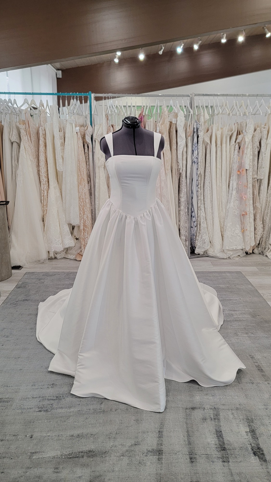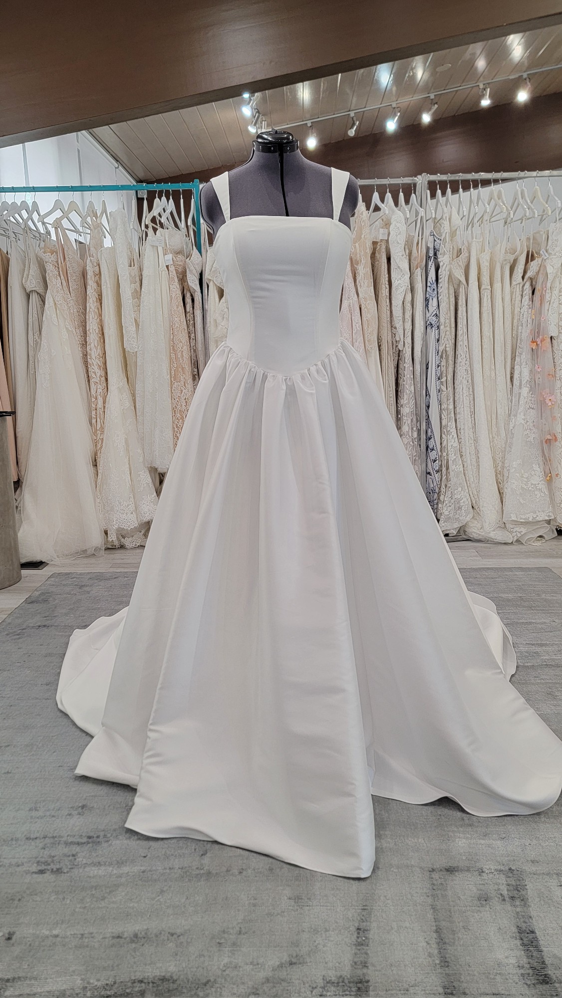This Raine wedding dress from Made With Love is a breathtaking embodiment of elegance and modern romance. The A-Line silhouette gracefully flows to a floor-length design, making it perfect for brides who desire that effortless yet refined look on their special day. The luxurious Mikado fabric adds a touch of sophistication while ensuring comfort as you move through your evening.
