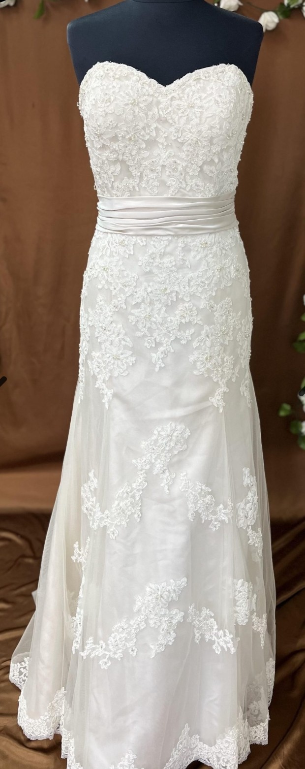 This stunning Sincerity wedding dress captured my heart the moment I slipped it on. With its elegant trumpet silhouette and romantic sweetheart neckline, I felt absolutely breathtaking on my special day. The flattering fit hugged my curves perfectly, while the low back added a touch of alluring sophistication. The delicate spaghetti straps offered just the right amount of support, making me feel comfortable as I danced the night away.