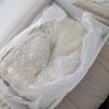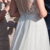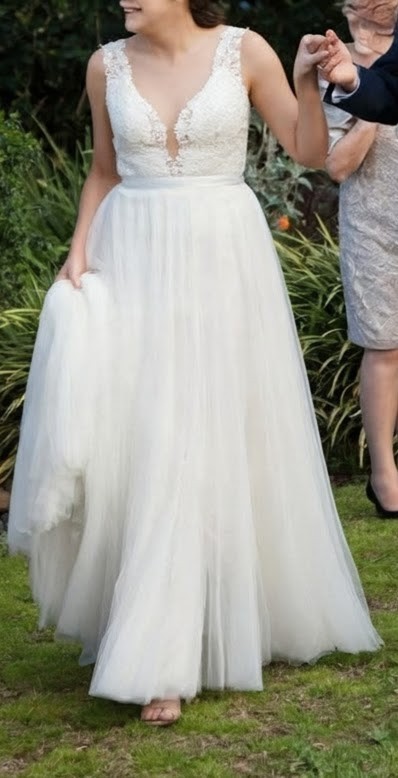 Sheer upper with embroidered flowers, button back with tulle skirt, lined underneath. Was worn in 2016 and dry cleaned, in storage ever since. Still in excellent condition.