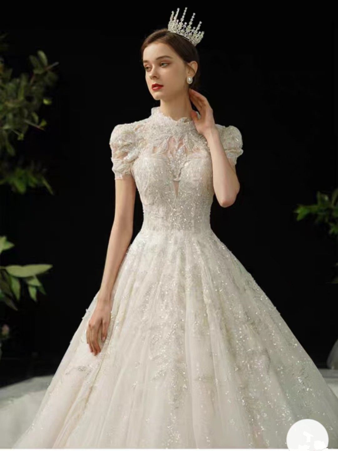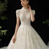 Keywords: high-neck lace, vintage royal style, corset back, beaded embroidery, floor-length gown.